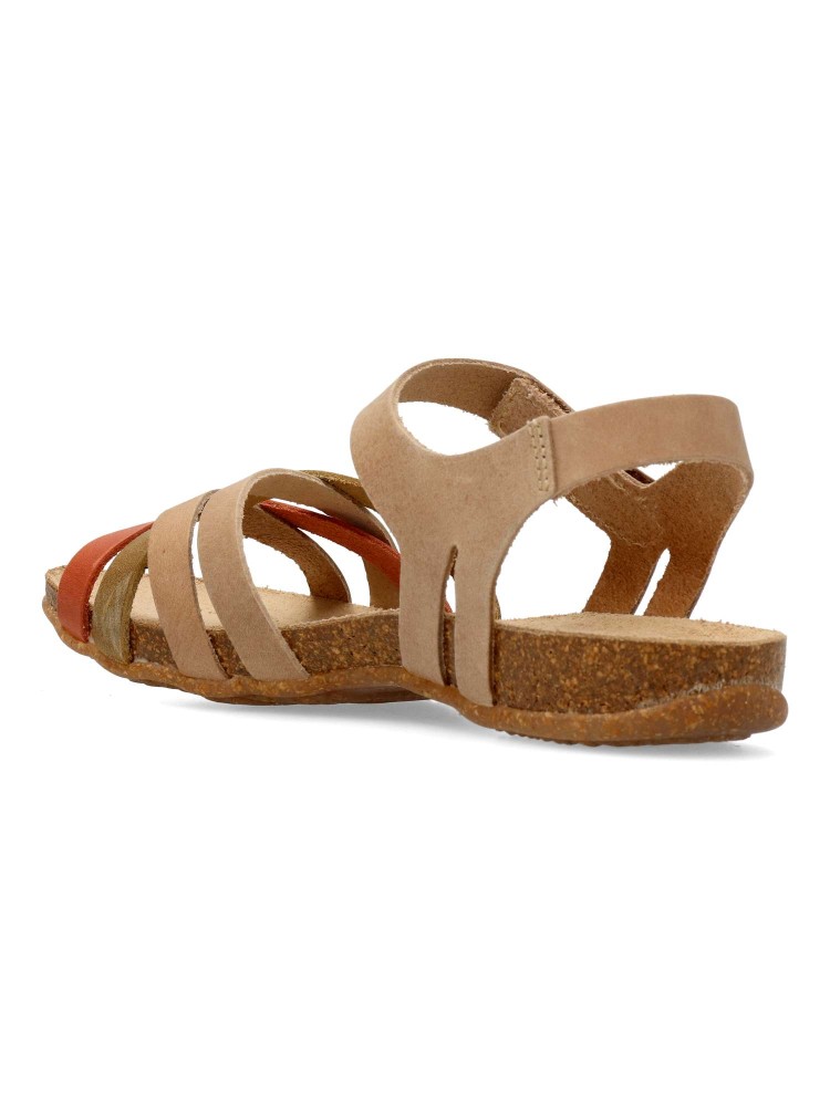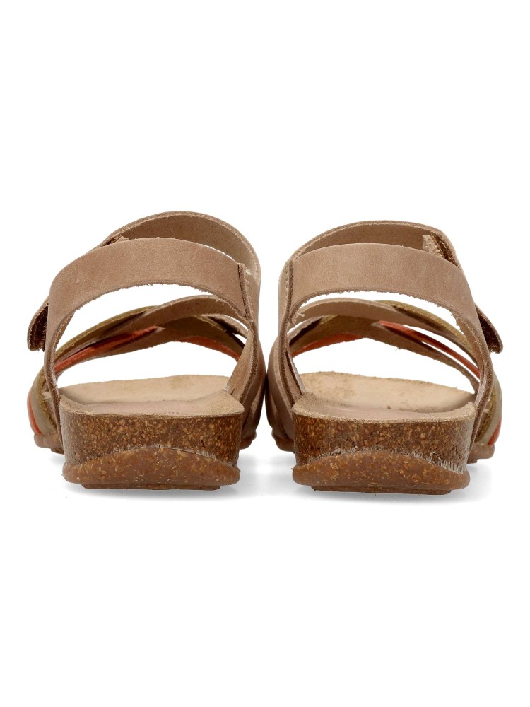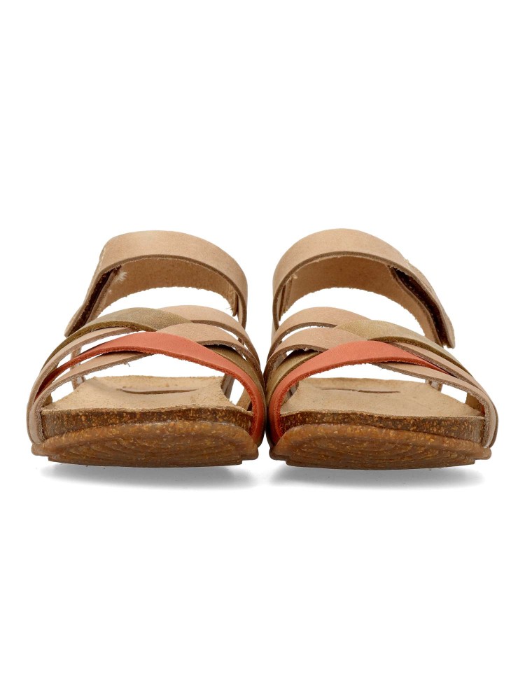 Sandalia cómoda de mujer, fabricada en piel natural de alta calidad. Plantillas bio-anatómicas de corcho natural. Color beige-teja-kaki. Modelo de tiras con cierre de velcro. Diseño innovador y colorido que marcan la diferencia. Fabricado en España.