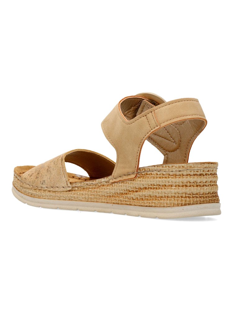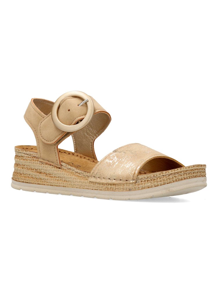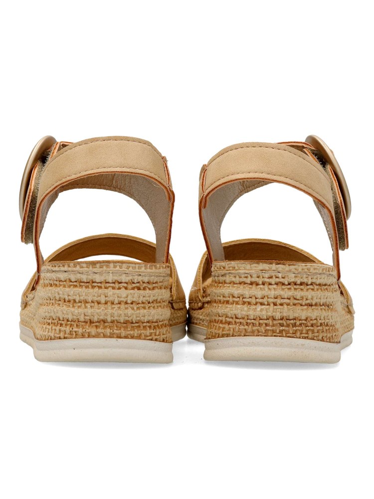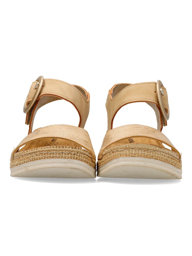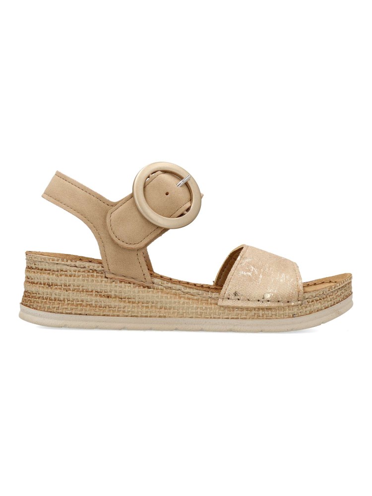 Sandalia cómoda de mujer, con cierre de hebilla. Color beige con detalles metalizados. Fabricado en piel sintética con suela de goma ligera y flexible. Planta de piel acolchada, confort diario. Pequeña cuña efecto rafia. Diseño elegante para verano.