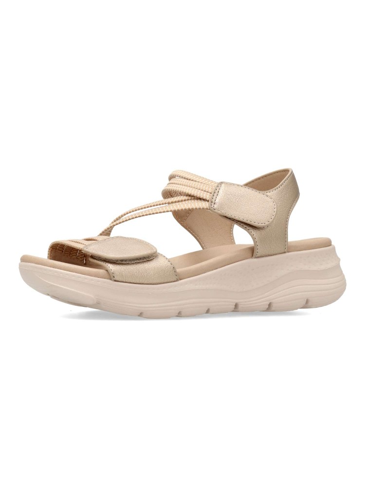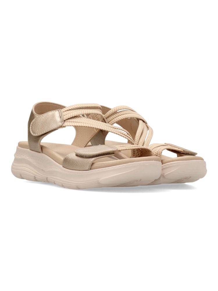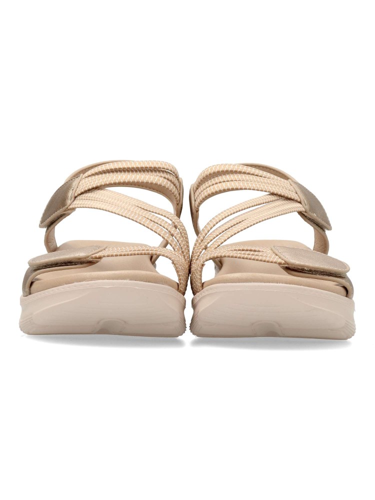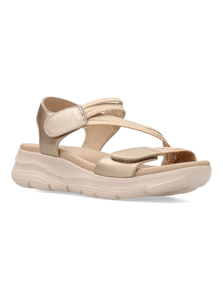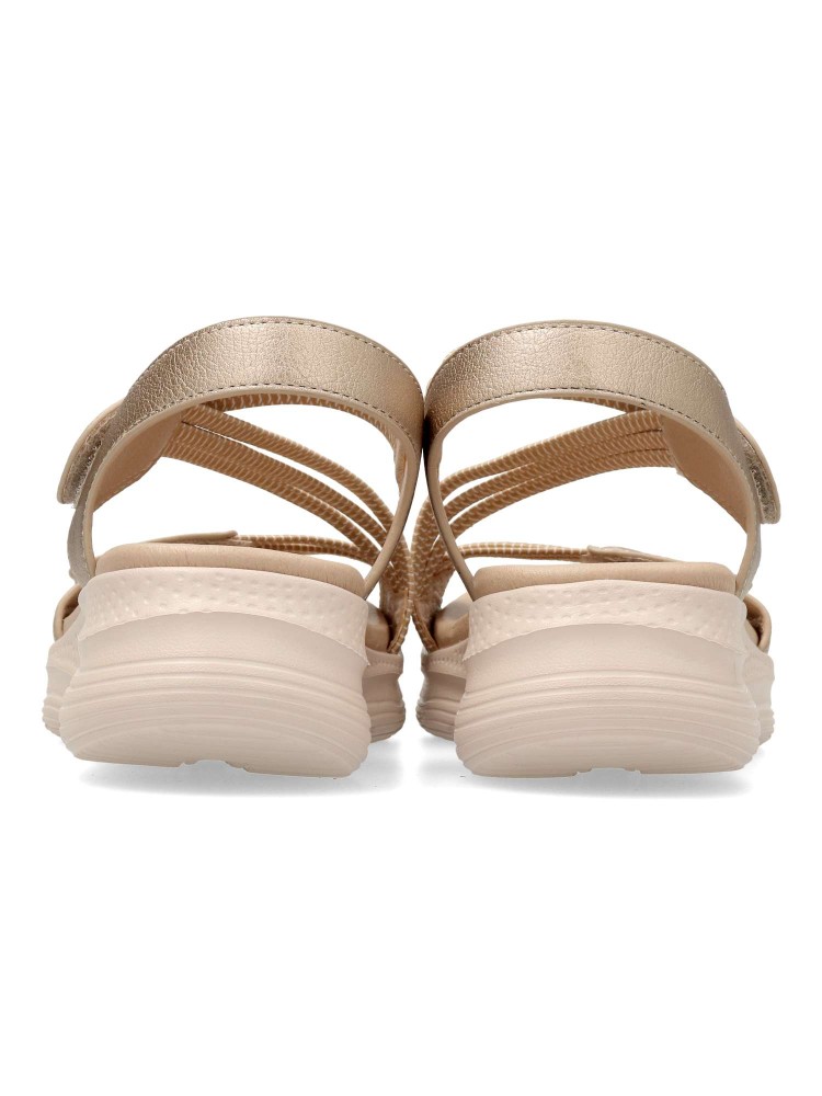 Sandalia deportiva de mujer, estilo casual. Cierre de tiras adherentes. Modelo cómodo, fabricado en piel sintética y tiras elásticas. Suela de goma ligera y flexible. Plantilla acolchada. Color oro. Diseño y confort en tus paseos de verano.