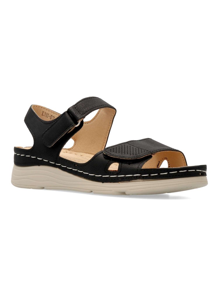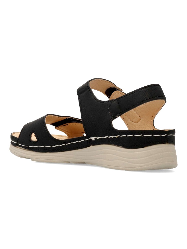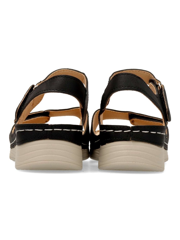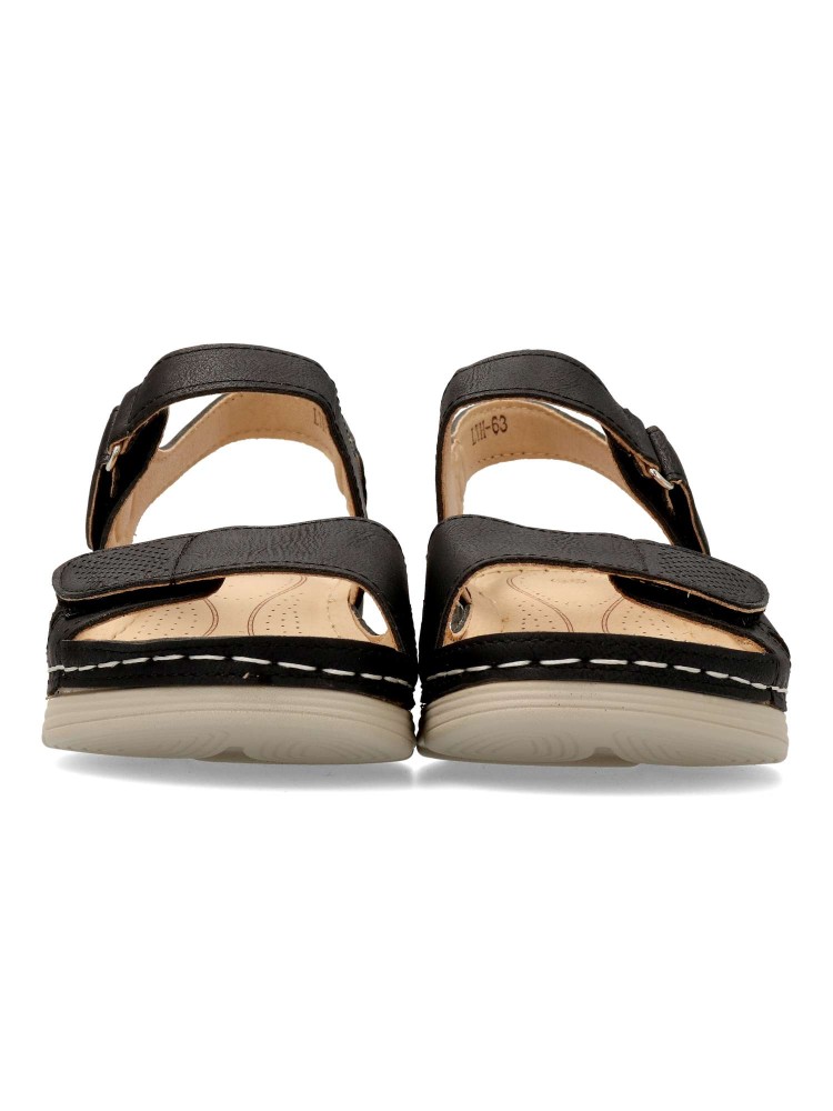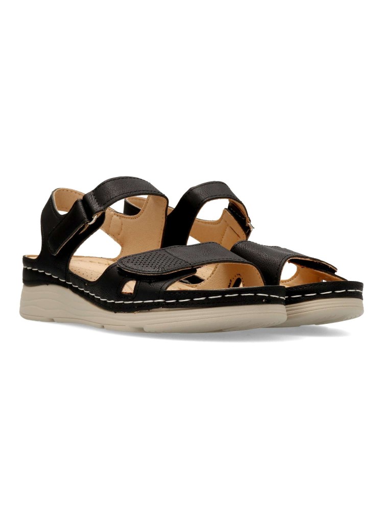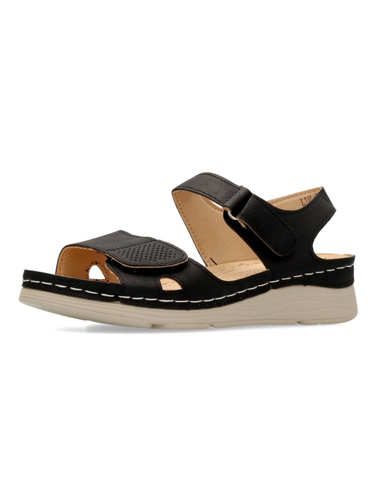 Sandalia cómoda de mujer, con cierre adherente ajustable. Fabricado en piel sintética, con suela de goma ligera y flexible. Planta acolchada. Color negro. Máximo confort, en una sandalia versátil, ideal en tus paseos de verano.