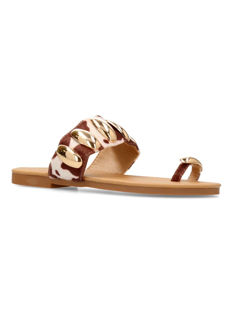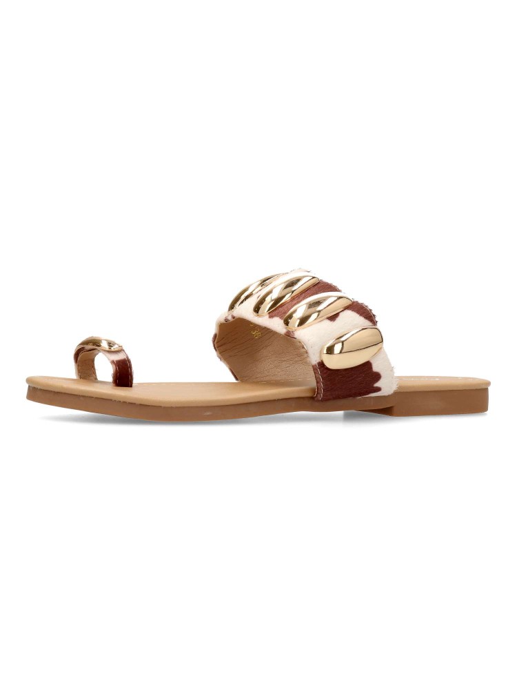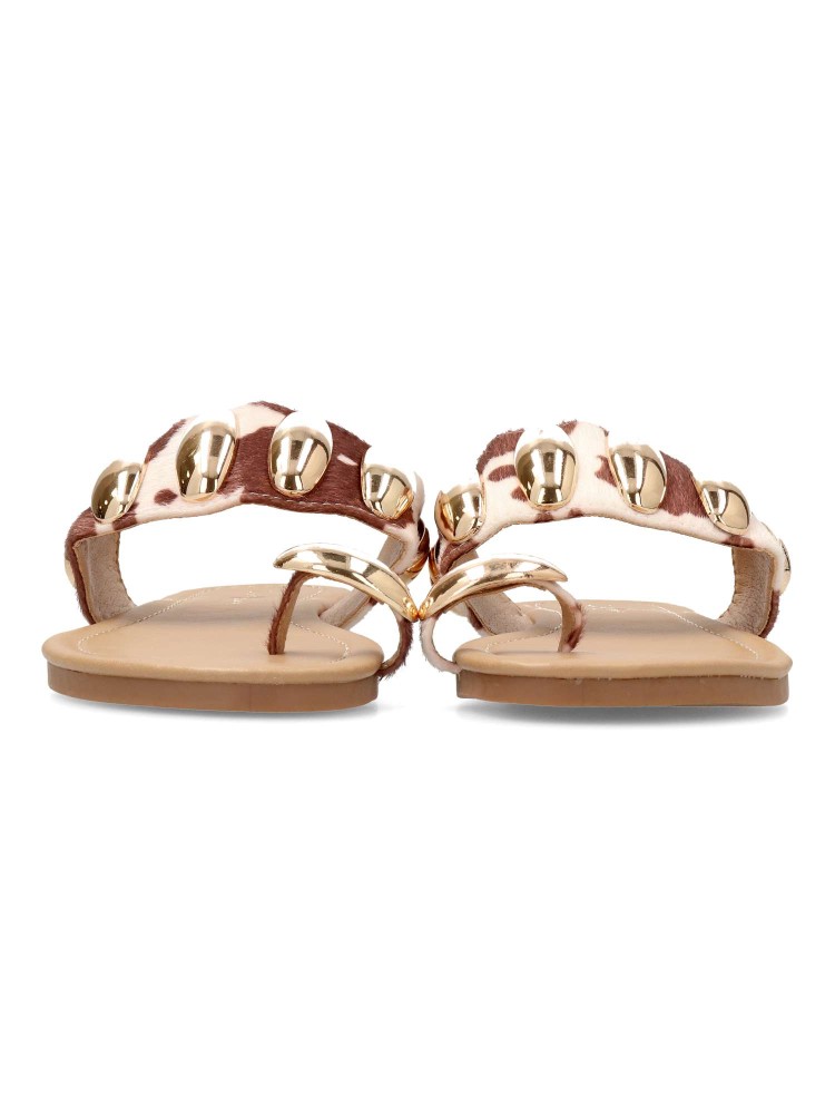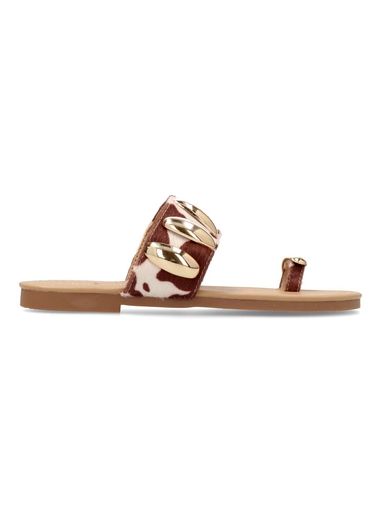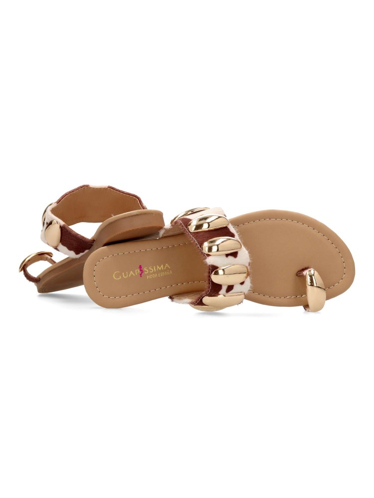 Sandalia plana de mujer. Modelo fabricado en material sintético print cebra, con suela de goma flexible. Detalles decorativos metalizados. Planta acolchada. Diseño cómodo, elegante y fresco, fácil de combinar con todos tus looks de verano.