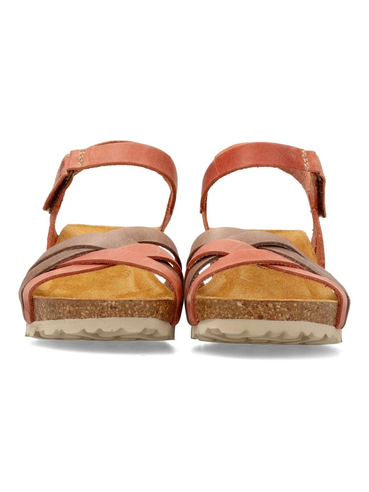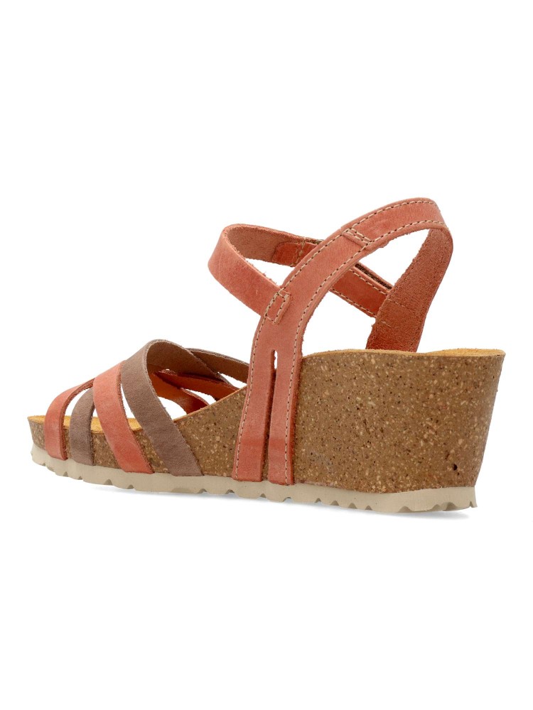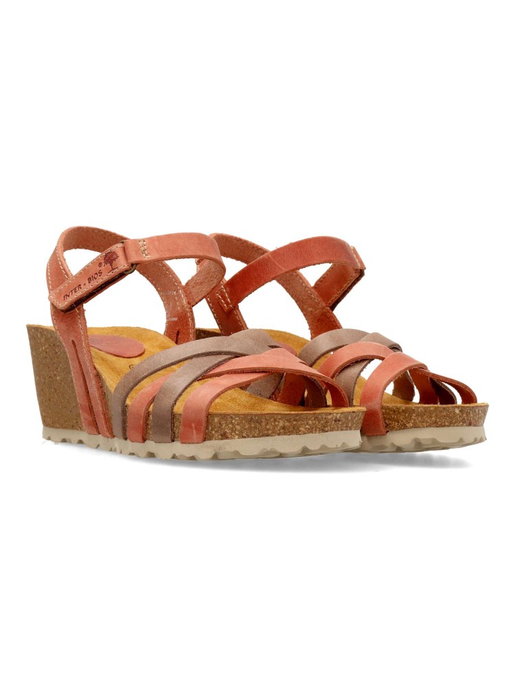Sandalia cómoda de mujer, fabricada en piel natural. Plantillas bio-anatómicas de corcho natural. Altura cuña 6 cm. Color teja-taupe. Modelo de tiras con cierre adherente. Diseño y confort para combinar con tus outfits de verano. Fabricado en España.