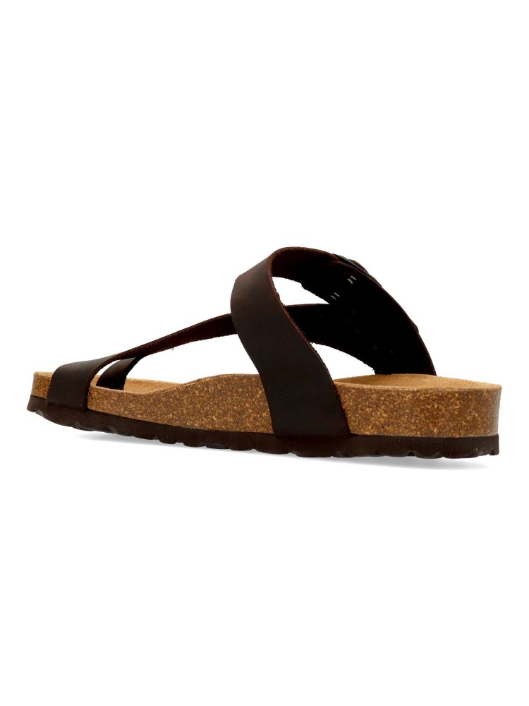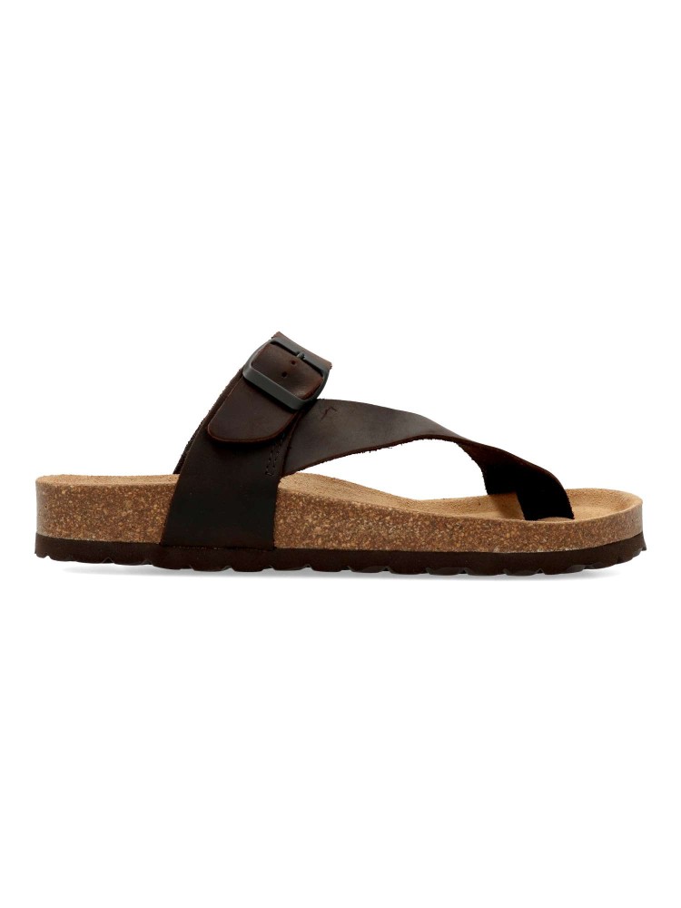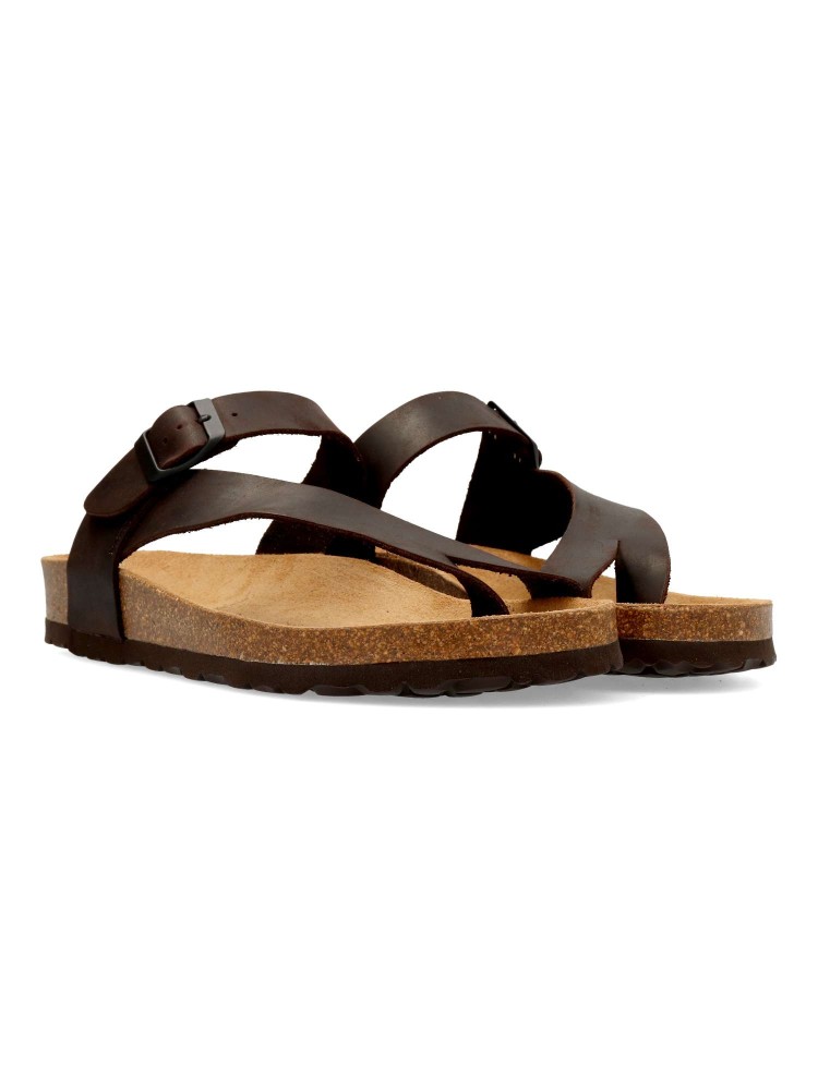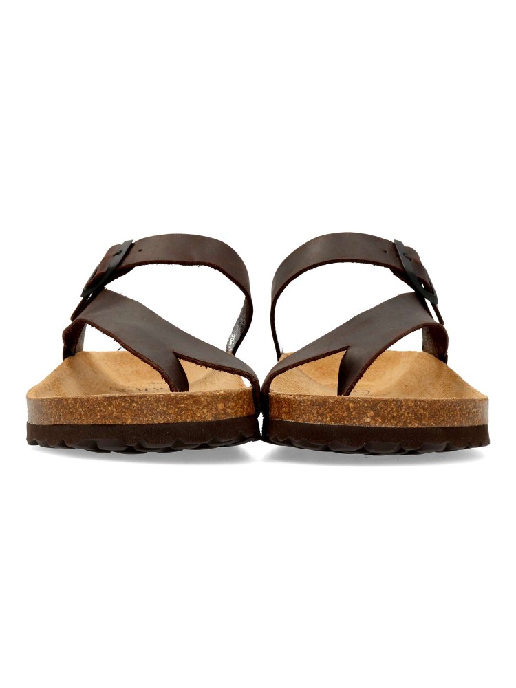 Sandalia casual de hombre, fabricada en piel natural. Plantillas bio-anatómicas de corcho natural. Color marrón oscuro. Modelo de tiras con hebilla ajustable. Sandalia con diseño y confort: disfruta de tus paseos de verano. Hecho en España.