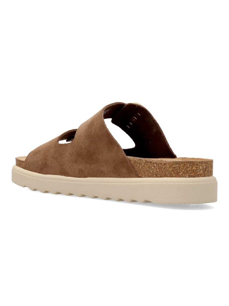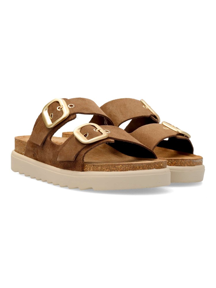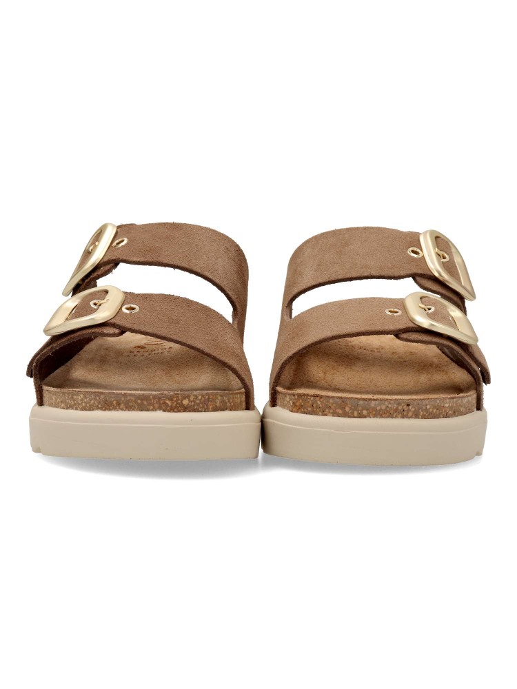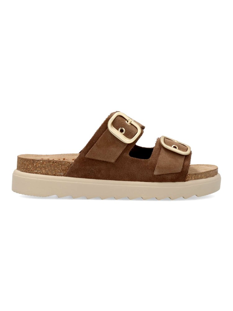 Sandalia bio de mujer, fabricada en piel serraje. Doble pala ajustable con hebillas. Planta acolchada. Doble suela de corcho y goma, al mejor estilo Yokono. Altura 4 cm. Color lodo. Ideal para tus planes del día a día. Hecho a mano en España.