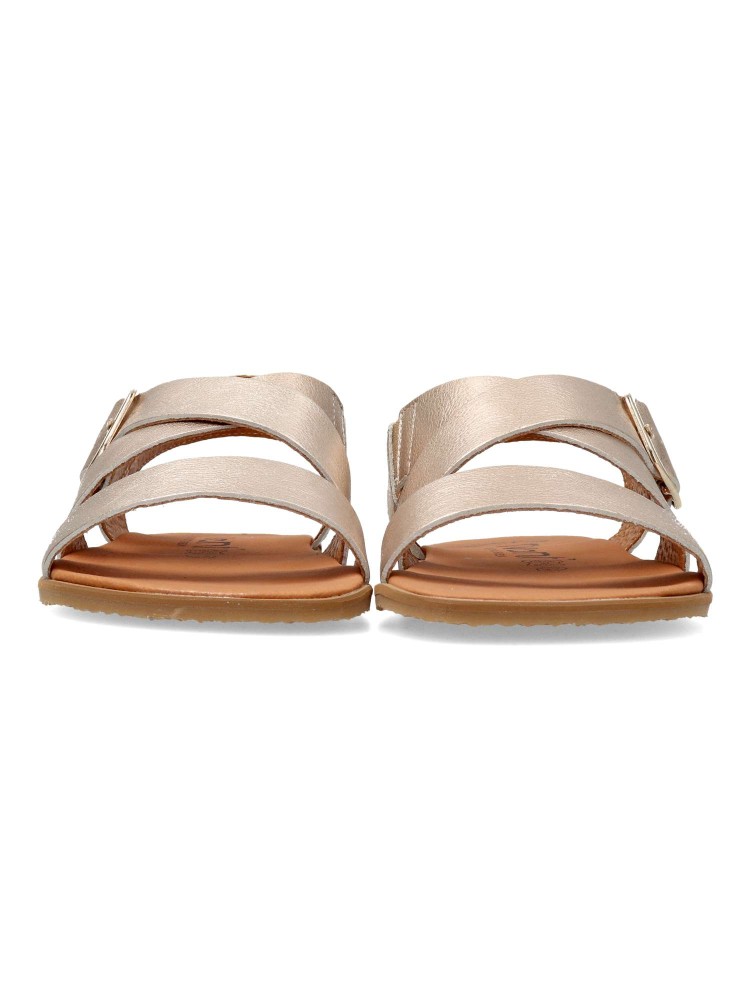 Sandalias barefoot con suela fina, flexible, antideslizante y sin drop. Calzado respetuoso que permite una pisada natural y saludable. Corte en piel metalizado, suave, transpirable y resistente. Horma ancha y plantilla ergonómica.