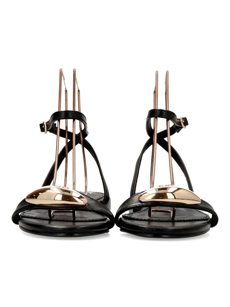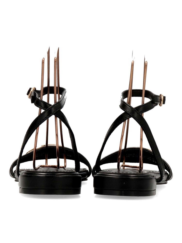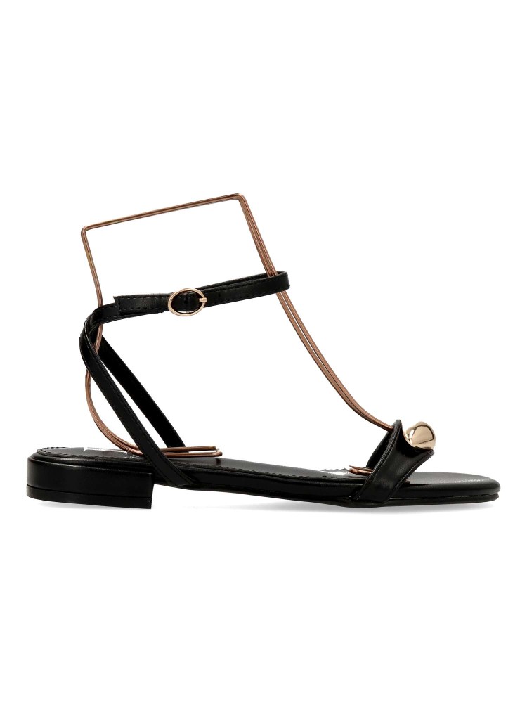 Sandalia plana de mujer, con cierre de hebilla. Modelo fabricado en material sintético color negro, con suela de goma. Detalle decorativo metalizado. Planta acolchada. Diseño cómodo, elegante y fresco, fácil de combinar con todos tus outfits de verano.