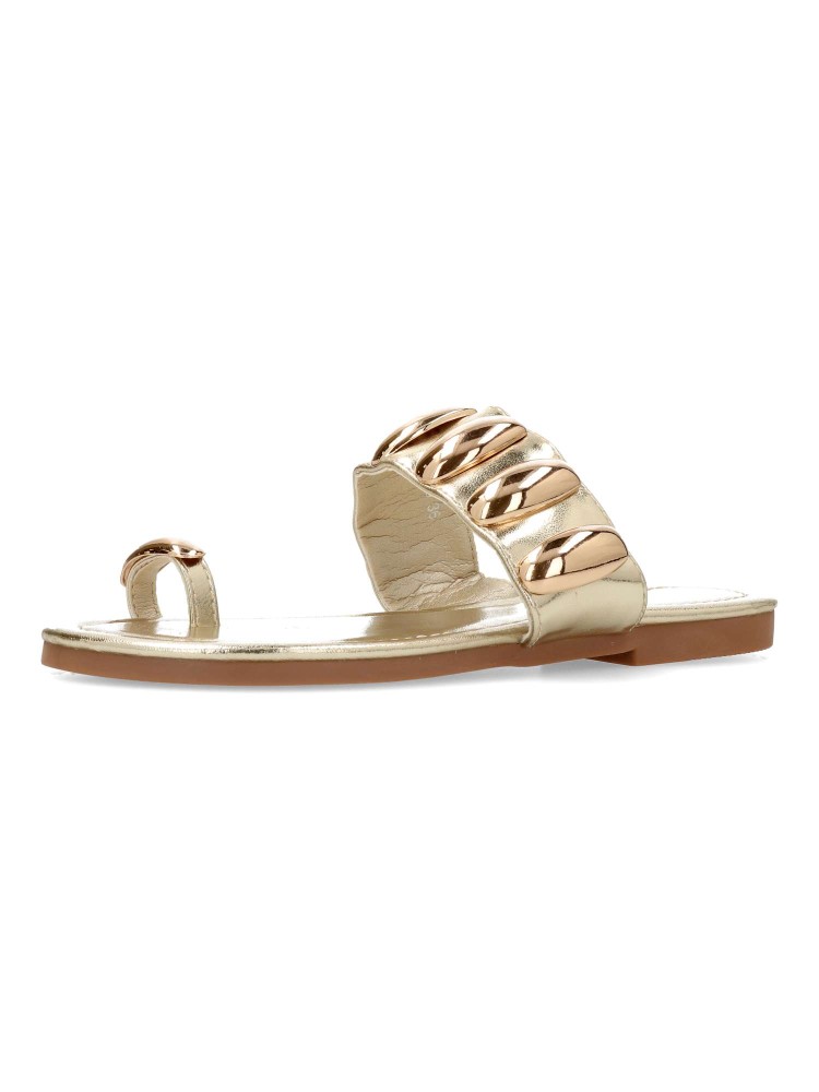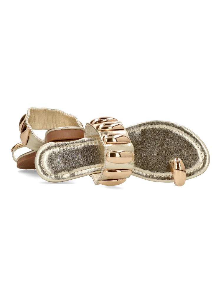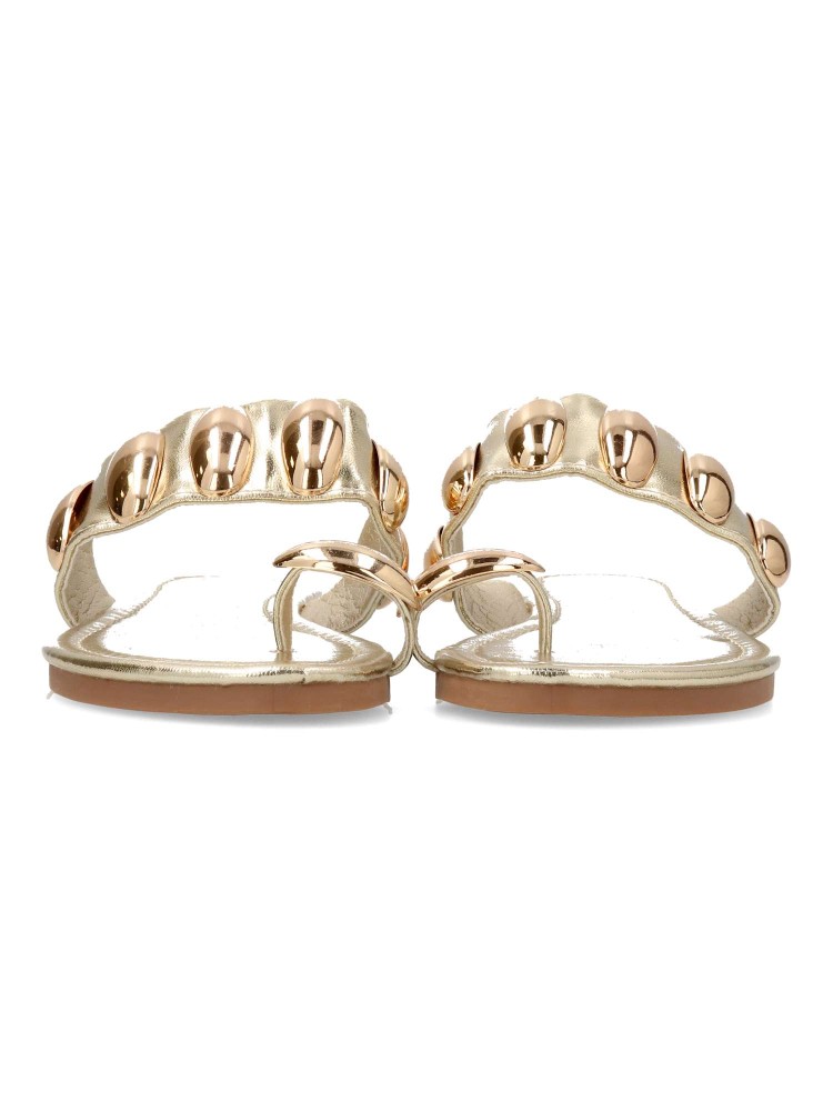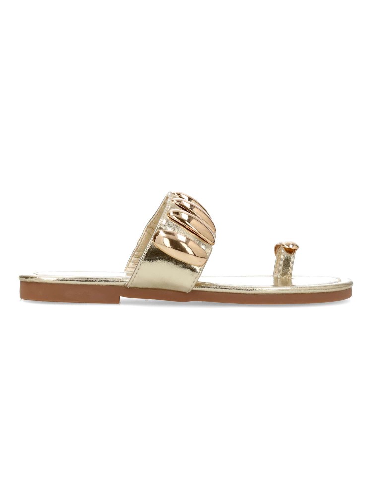 Sandalia plana de mujer. Modelo fabricado en material sintético color oro, con suela de goma flexible. Detalles decorativos metalizados. Planta acolchada. Diseño cómodo, elegante y fresco, fácil de combinar con todos tus looks de verano.