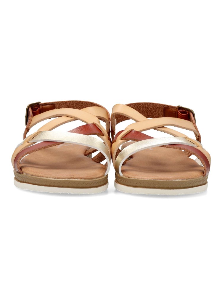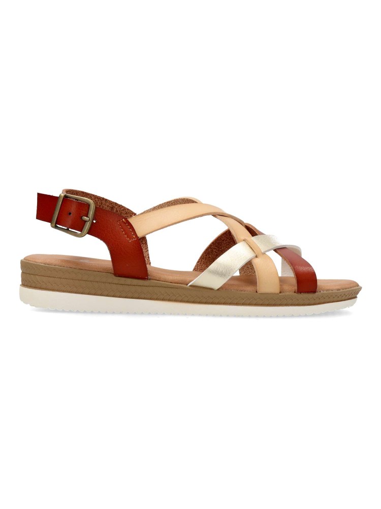 Sandalia cómoda de mujer, con cierre de hebilla al tobillo. Fabricada en piel sintética, con suela de goma flexible. Planta acolchada. Color beige-oro. Una sandalia versátil, con diseño de tiras cruzadas, con la que podrás pasear cómodamente en verano.