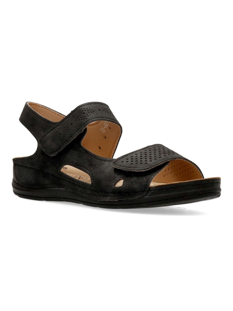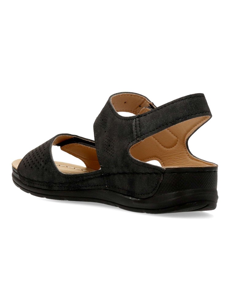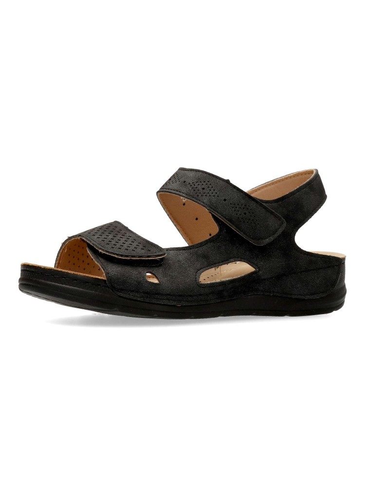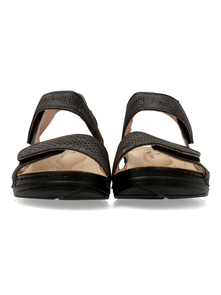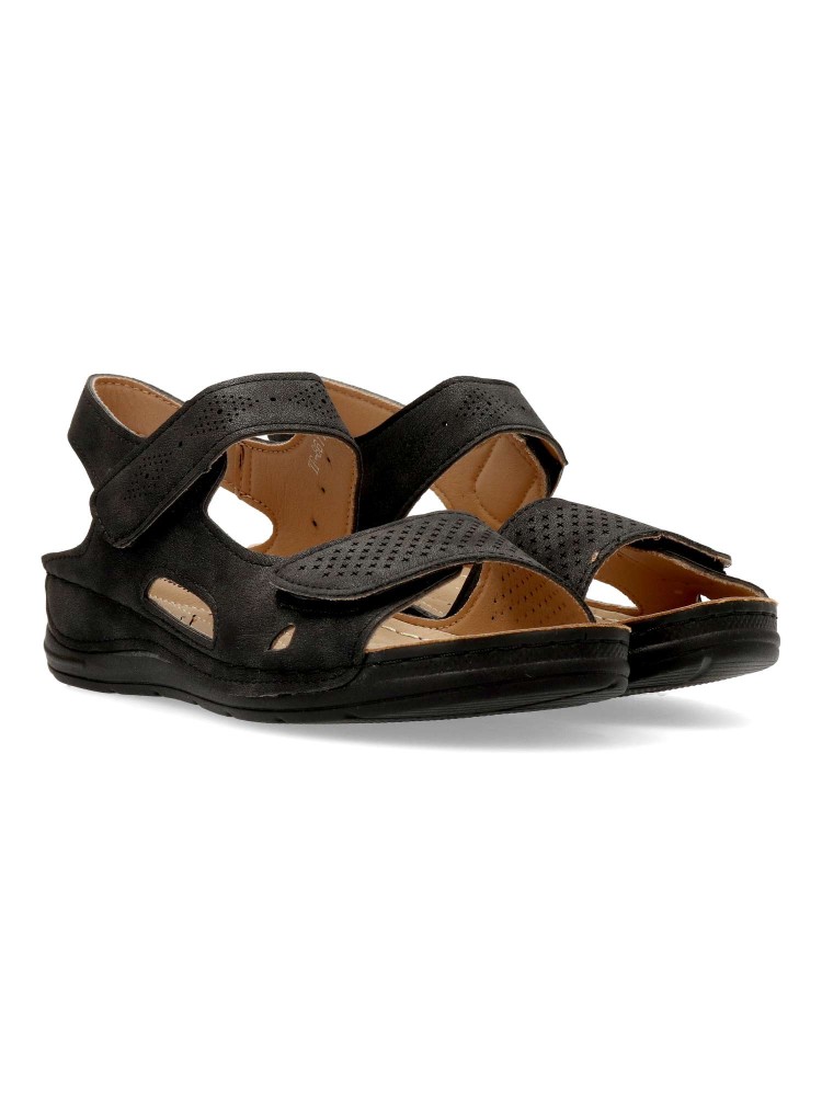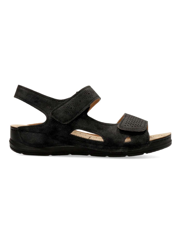Sandalia cómoda de mujer, con cierre adherente ajustable. Fabricado en piel sintética, con suela de goma ligera y flexible. Planta acolchada. Color negro. Máximo confort, en una sandalia versátil, ideal en tus paseos de verano.