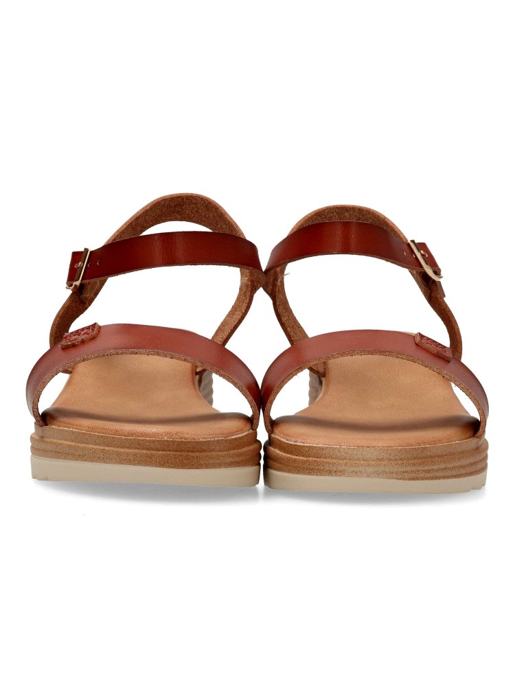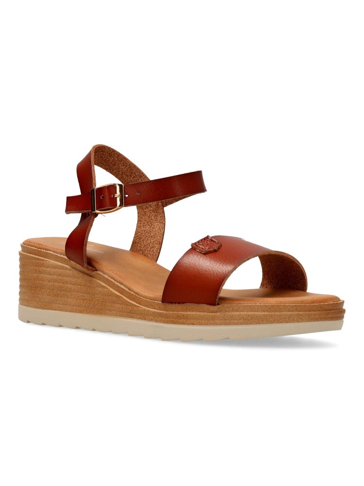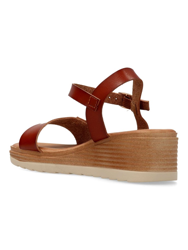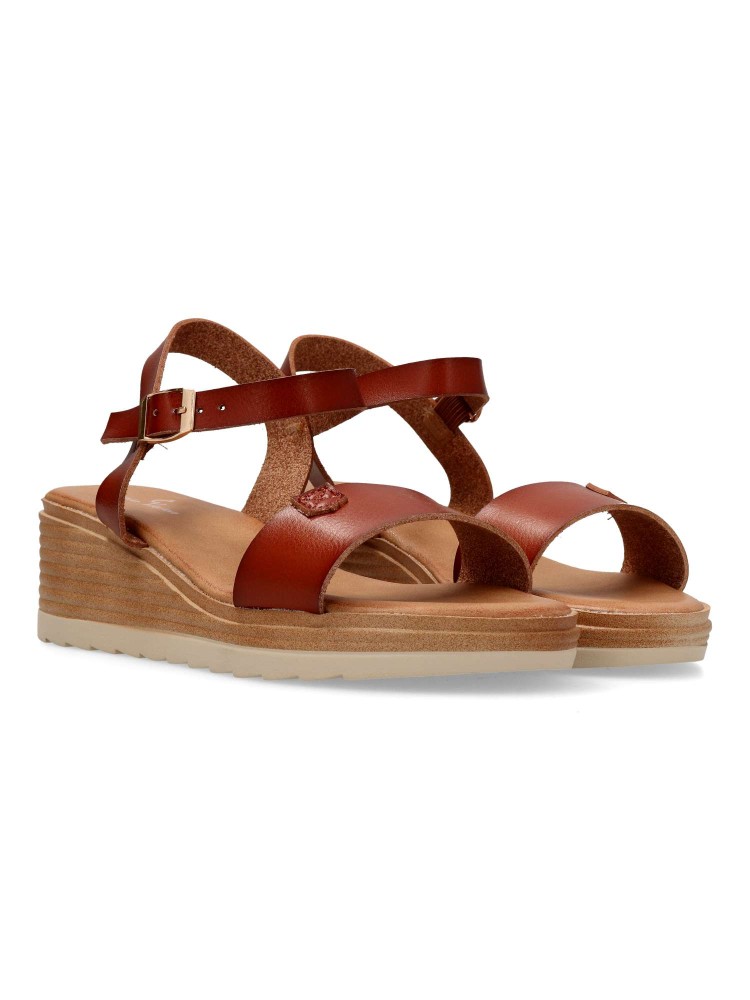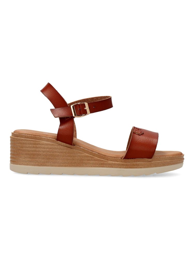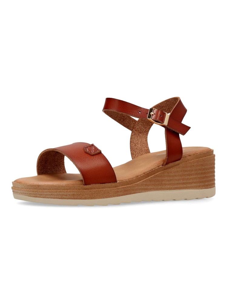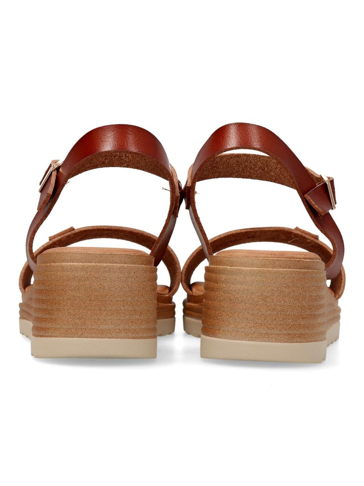 Sandalia de pala con cierre de hebilla al tobillo. Modelo cómodo, fabricado en piel sintética con suela de goma ligera y flexible. Planta acolchada. Color camel. Altura cuña 5 cm. Diseño versátil y cómodo, ideal para combinar con tus outfits de verano.
