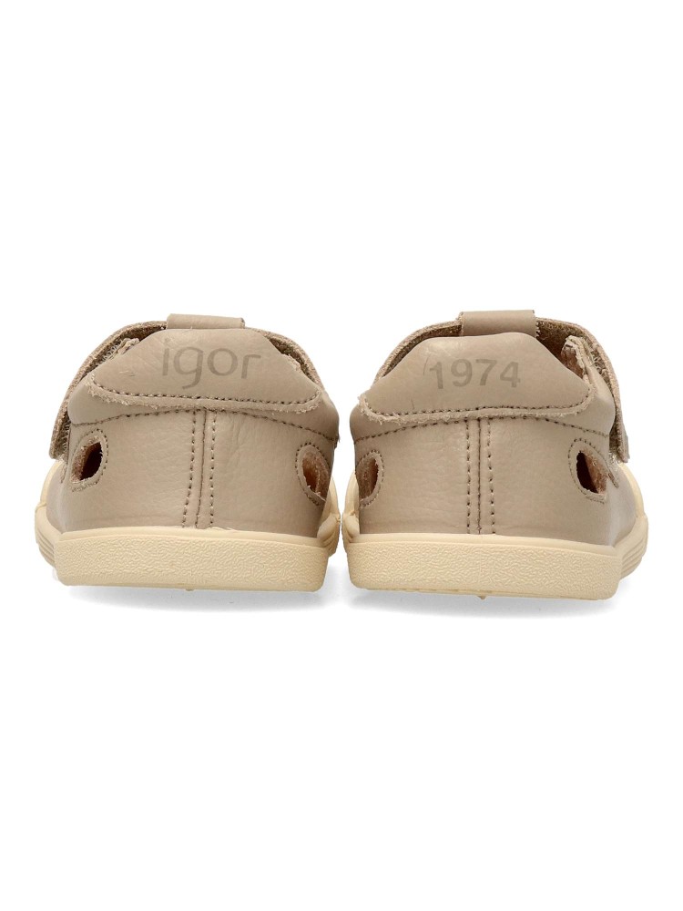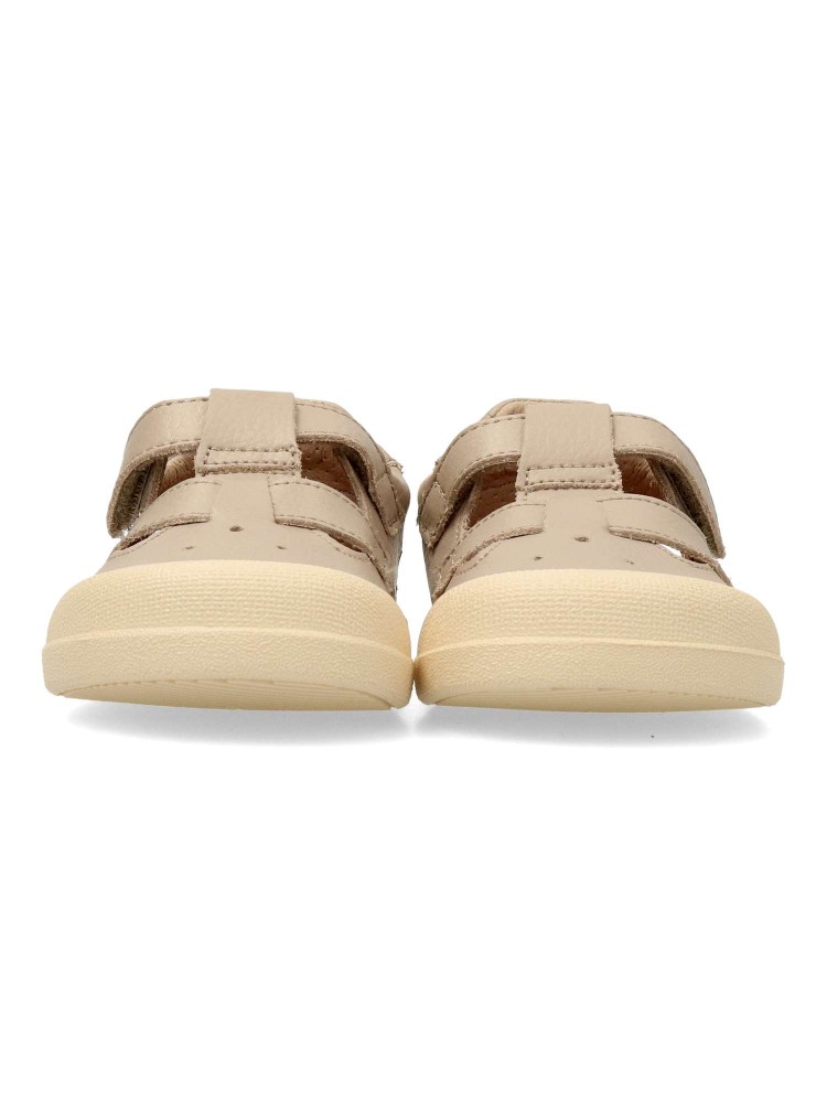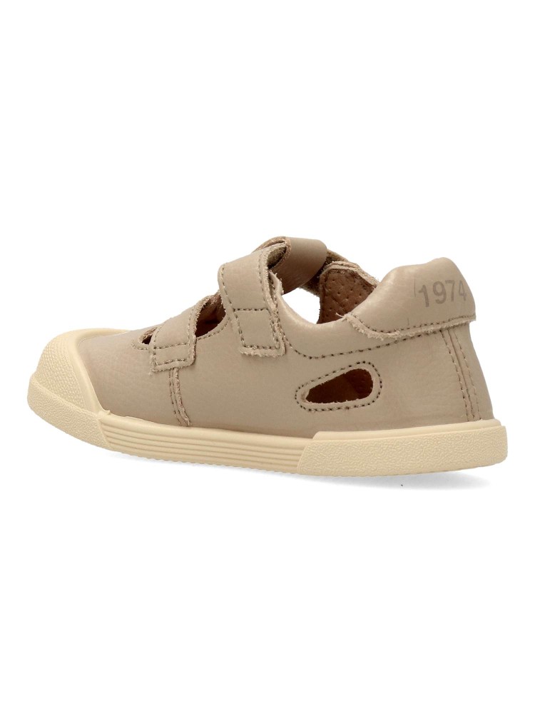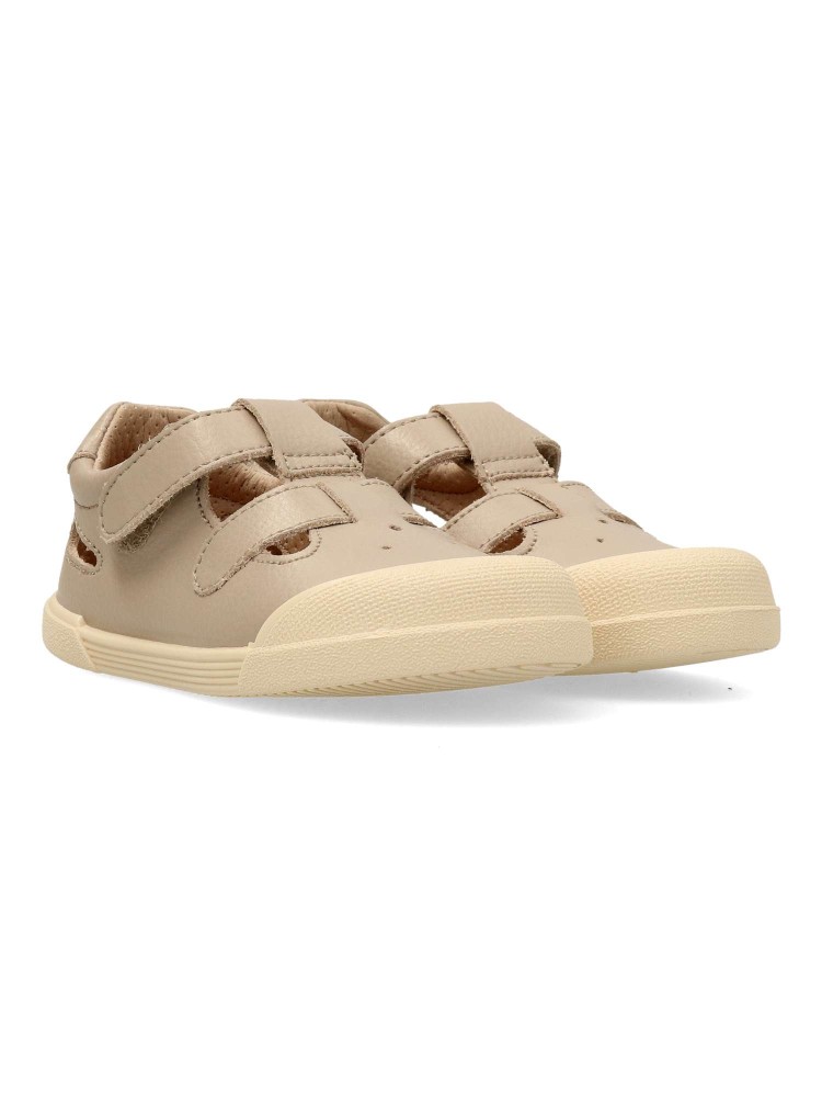 Sandalia cangrejera de piel, de concepto barefoot medium, con la puntera mucho más ancha que en modelos anteriores, cero drop, flexible, blandita y plantilla extraíble. Cierre adherente. Color arena. 100% Fabricado en España.