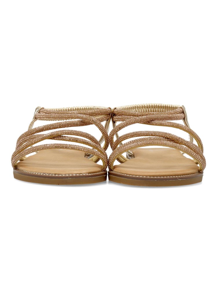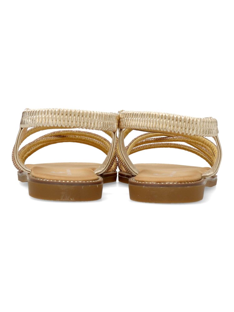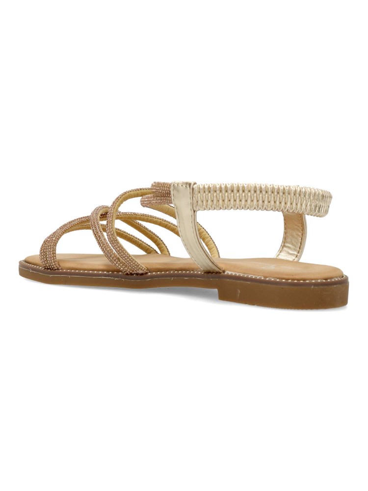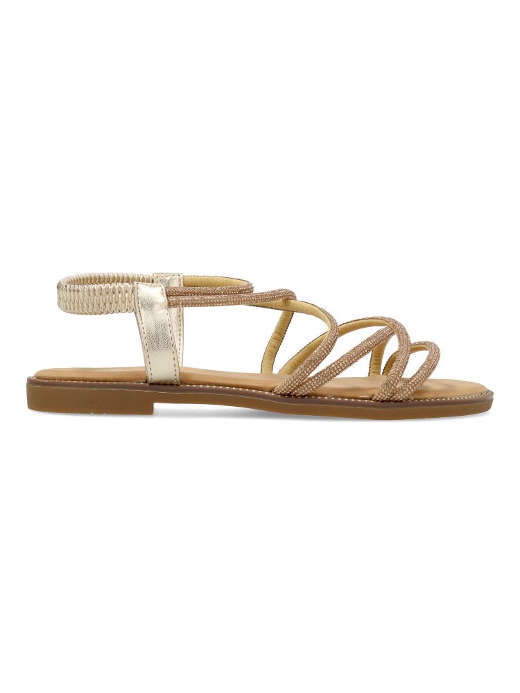 Sandalia plana de mujer, sujeta al tobillo por un elástico en la talonera. Modelo de tiras con pedrería de brillo. Fabricado en material sintético. Planta acolchada. Color oro. Ideal tanto para tu día a día como para fiestas y celebraciones.