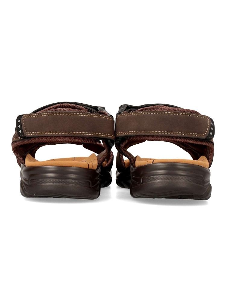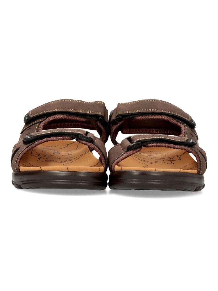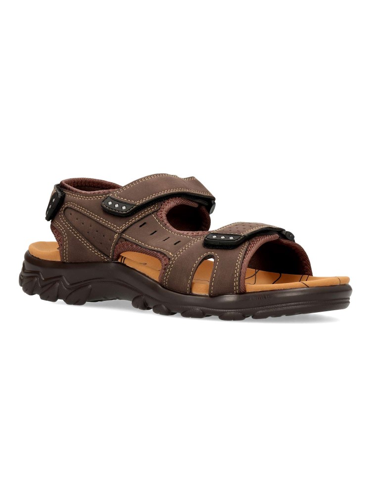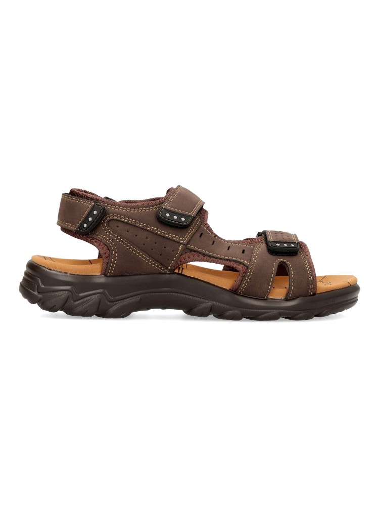Sandalia cómoda de hombre, tipo californiana. Cierres adherentes ajustables. Fabricada en piel sintética, con suela de goma ligera y flexible. Planta de piel acolchada. Disponible en color marrón. Ideal para dar frescura a tus paseos de verano.