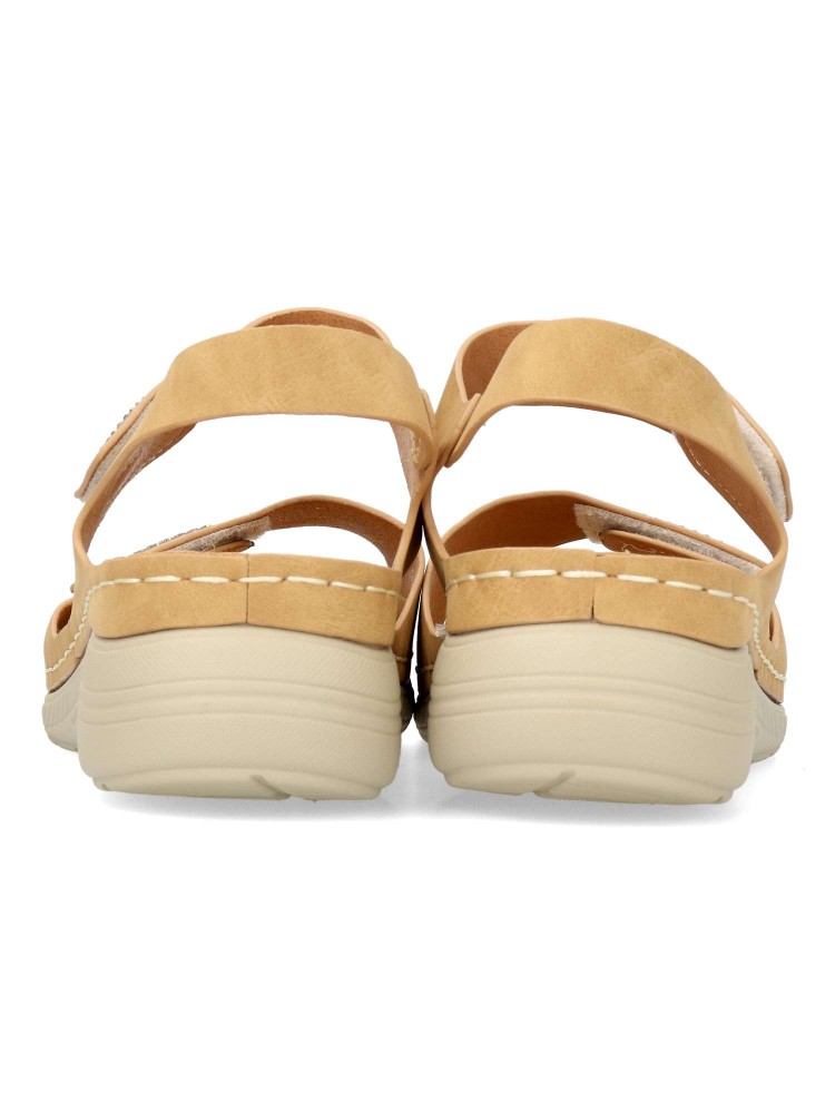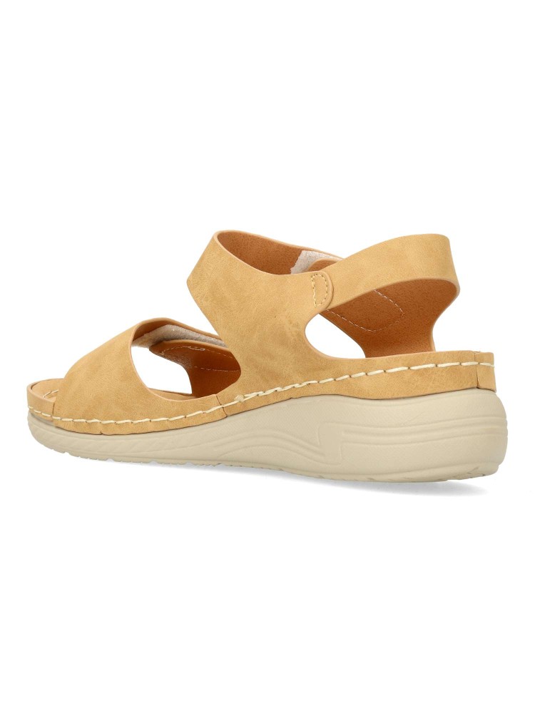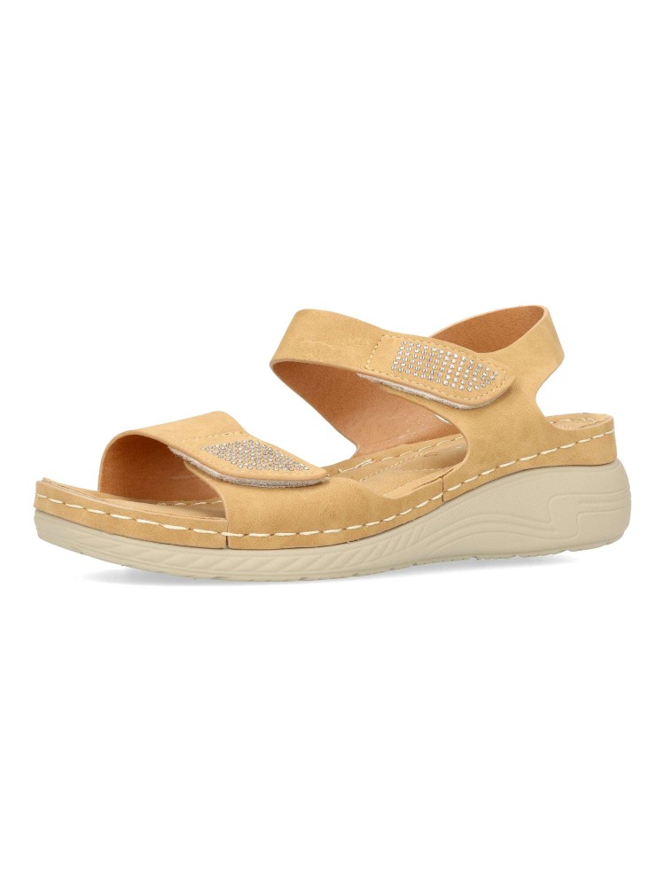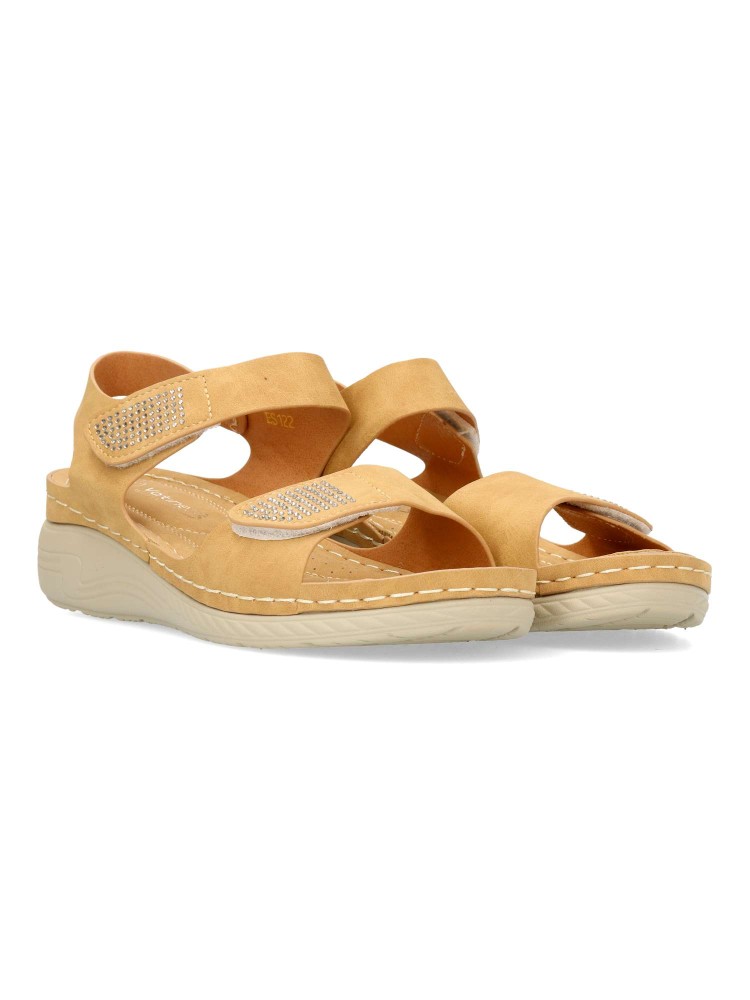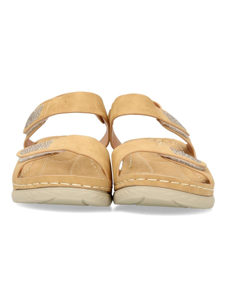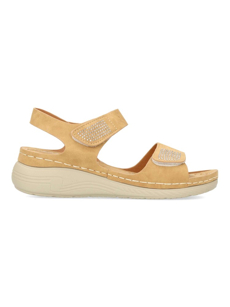 Sandalia cómoda de mujer, con cierre adherente. Fabricado en piel sintética, con suela de goma ligera y flexible. Planta acolchada. Color beige. Detalle de predrería brillo. Máximo confort, en una sandalia versátil, ideal en tus paseos de verano.