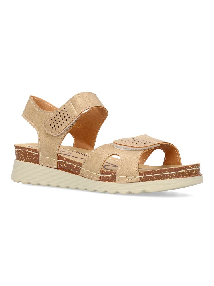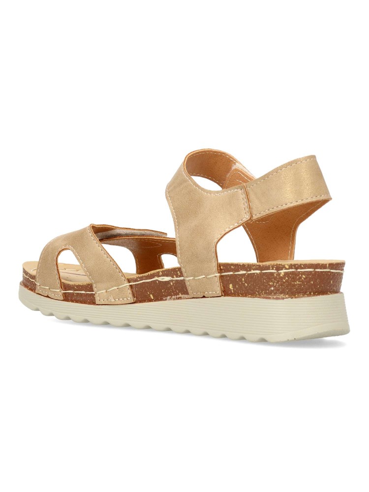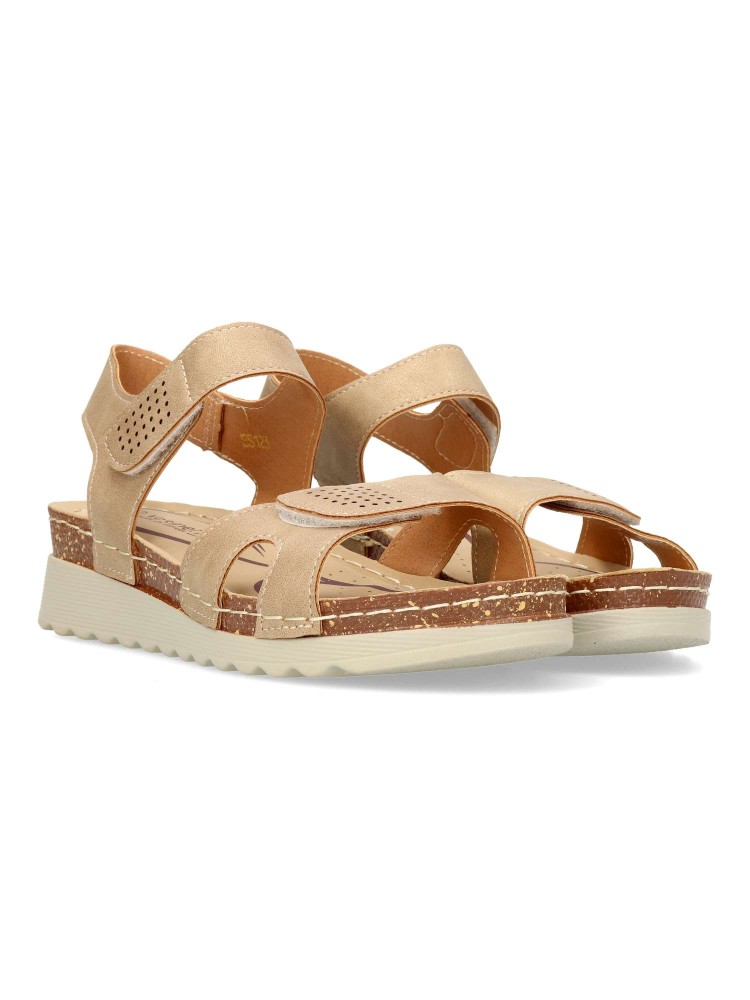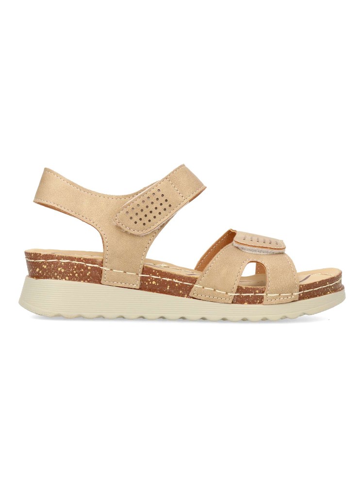 Sandalia cómoda de mujer, con cierres adherentes. Fabricado en piel sintética brillo, con suela de goma ligera y flexible. Planta acolchada. Color beige. Máximo confort, en una sandalia versátil, ideal para combinarlas con tus looks de verano.