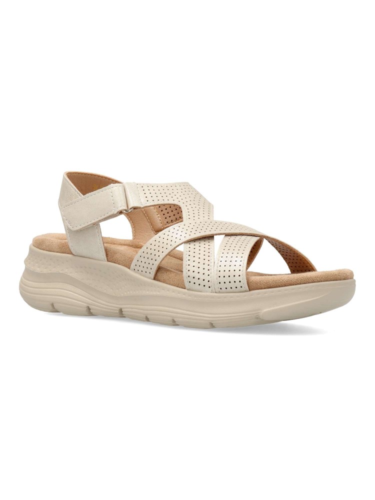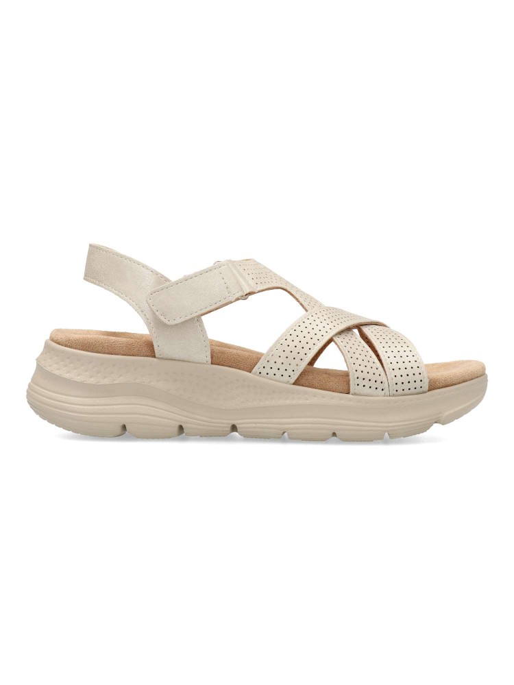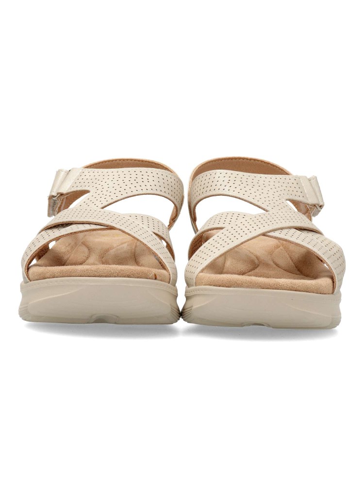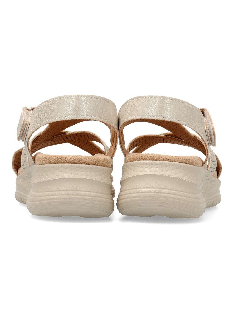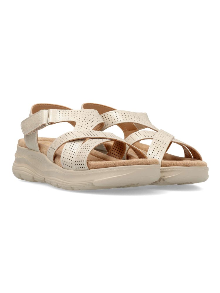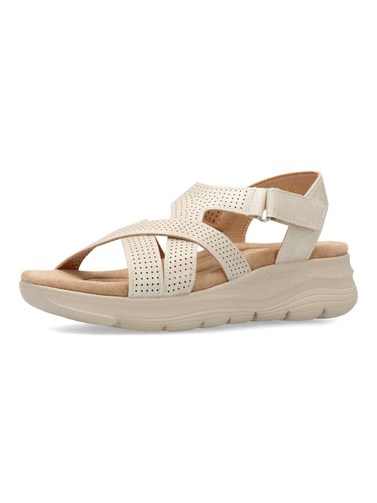 Sandalia cómoda de mujer, con cierre adherente ajustable. Fabricado en piel sintética, con suela de goma ligera y flexible. Planta acolchada. Color plata. Altura cuña 4,5 cm. Máximo confort, en una sandalia versátil, ideal en tus paseos de verano.