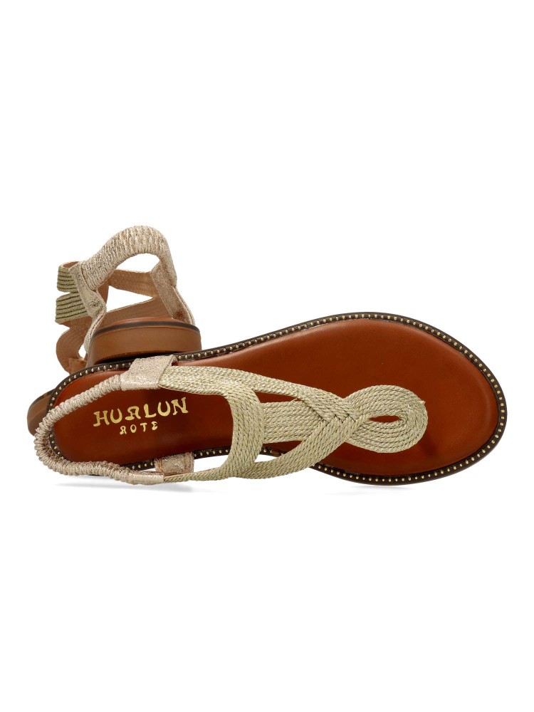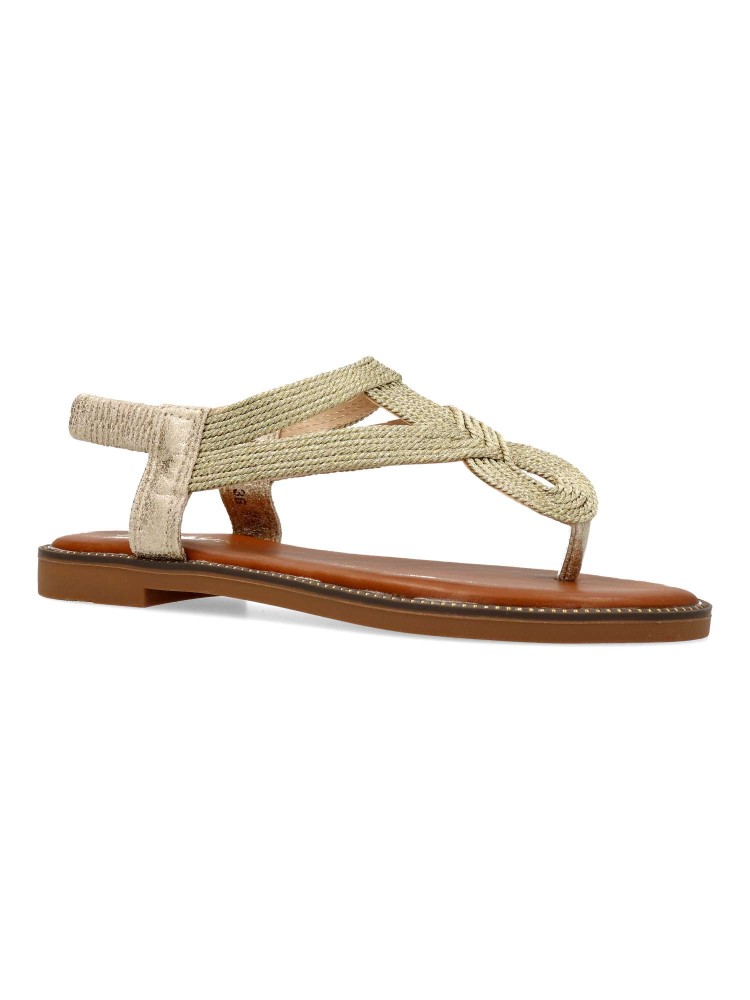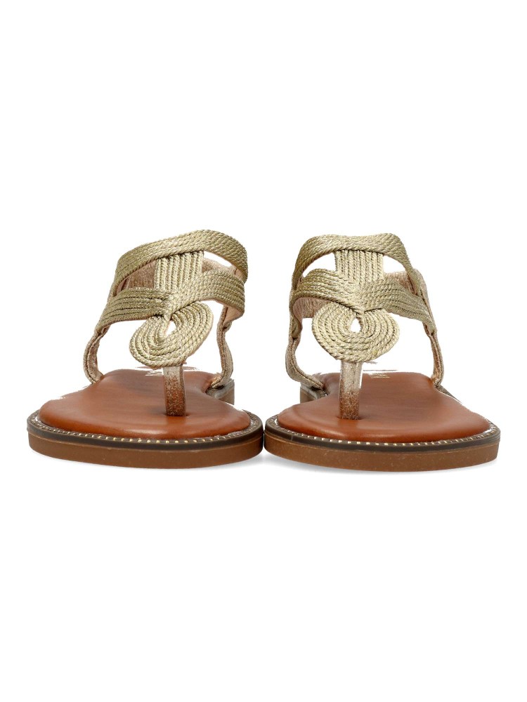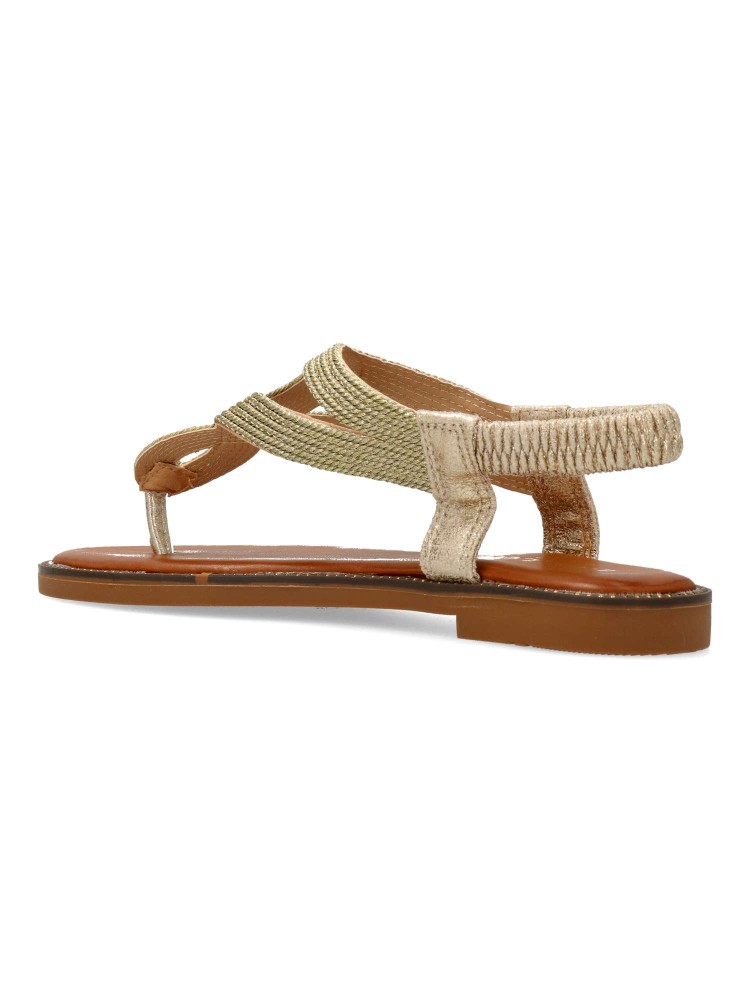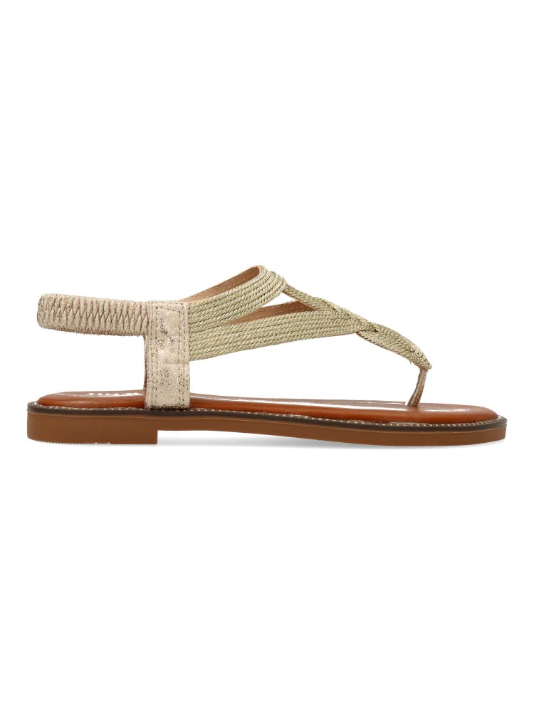 Sandalia cómoda de mujer, tipo esclava. Sujeta al tobillo por un elástico en la talonera. Color oro. Fabricada con tiras de cuerdas trenzadas y suela de goma flexible. Planta acolchada, confort diario. Ideal para lucirlas en tus paseos de verano.