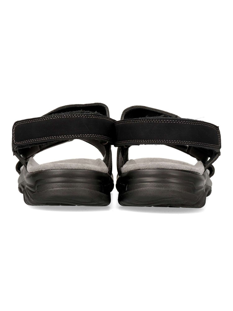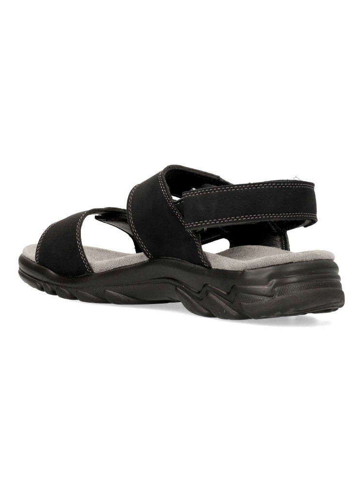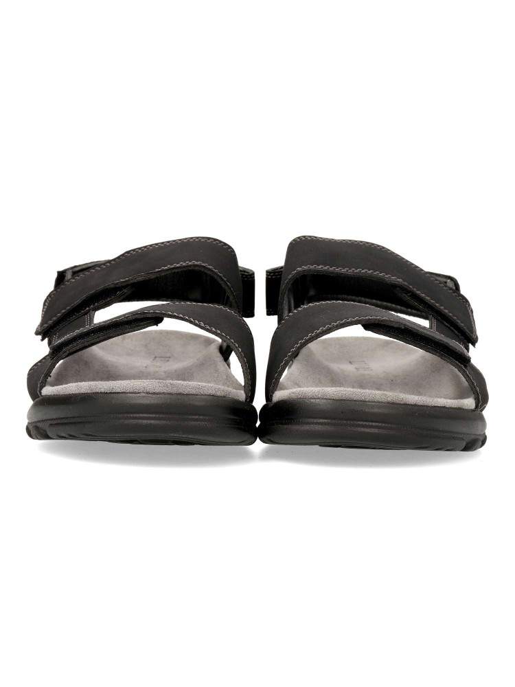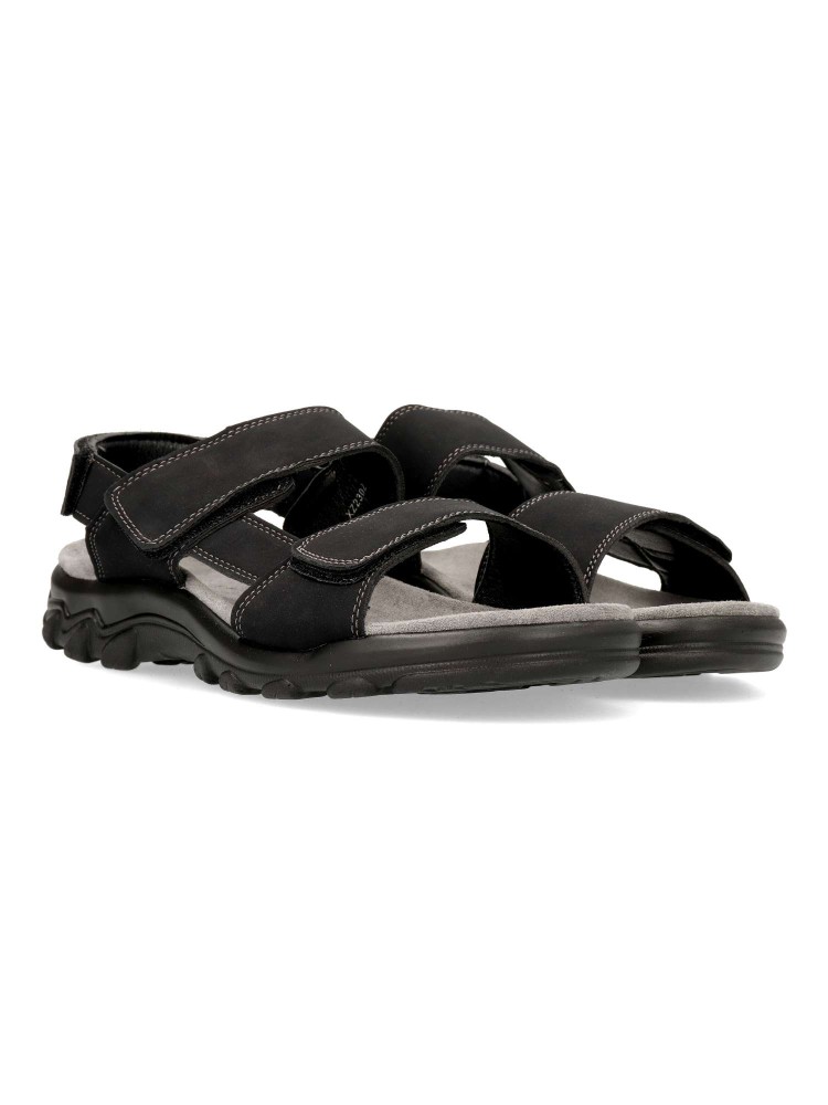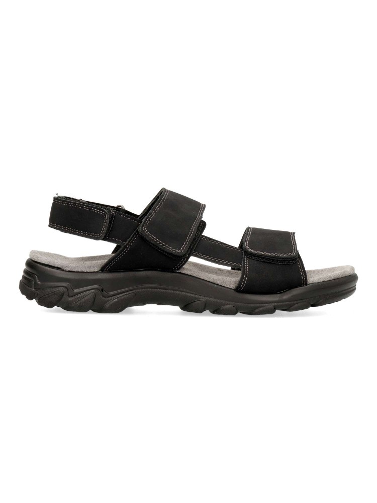 Sandalia cómoda de hombre, tipo californiana. Cierres adherentes ajustables. Fabricada en piel sintética, con suela de goma ligera y flexible. Planta acolchada. Disponible en color negro. Ideal para dar frescura a tus paseos de verano.
