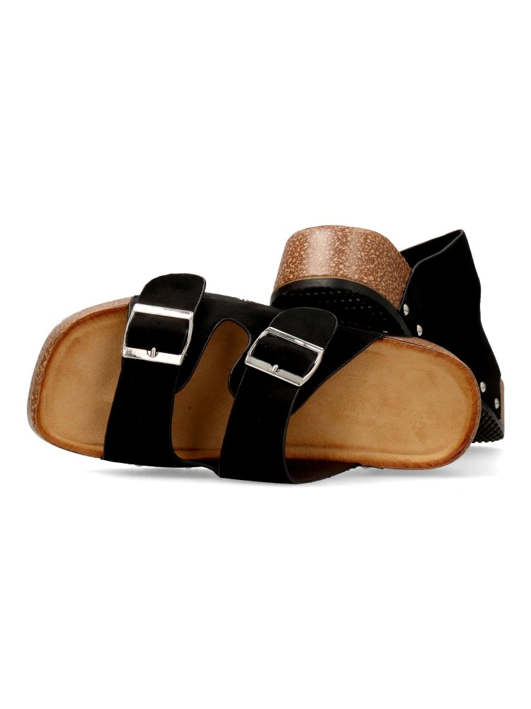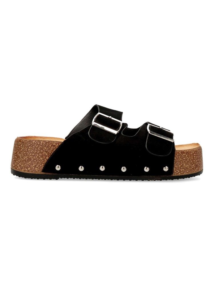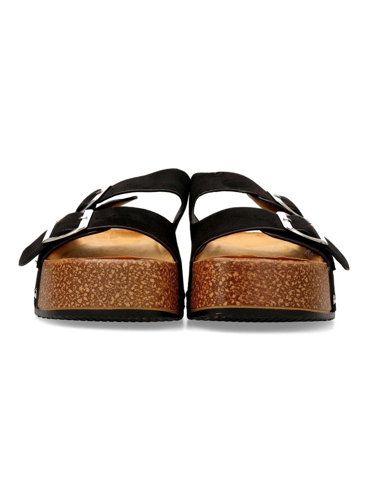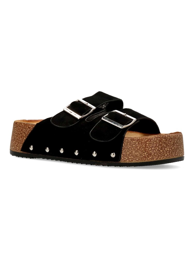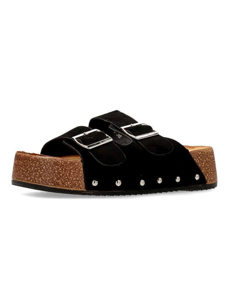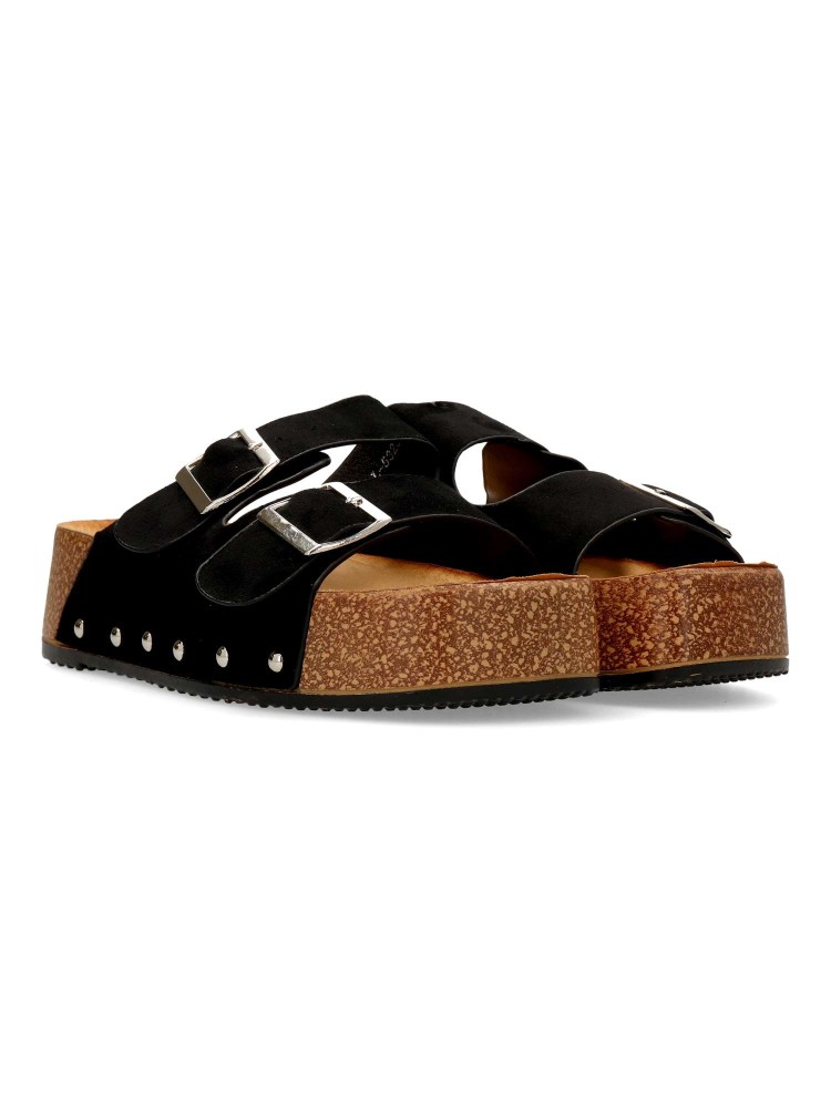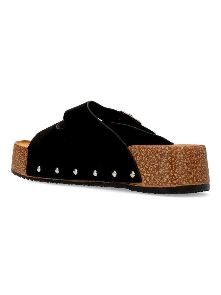 Sandalia de mujer tipo bio. Pala ajustable con doble hebilla. Modelo cómodo, fabricado en antelina con suela de goma. Detalle de tachas. Planta anatómica. Plataforma de 4 cm. Modelo fresco y confortable que no te puede faltar con tu outfit de verano.
