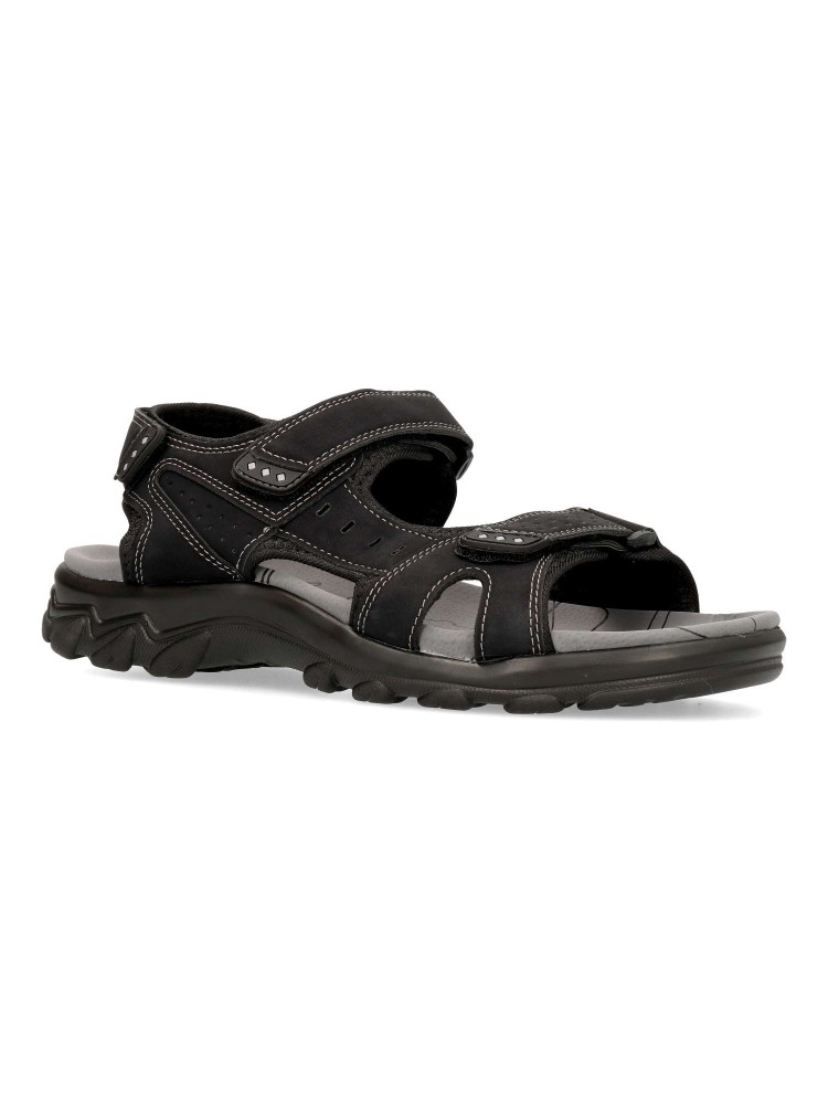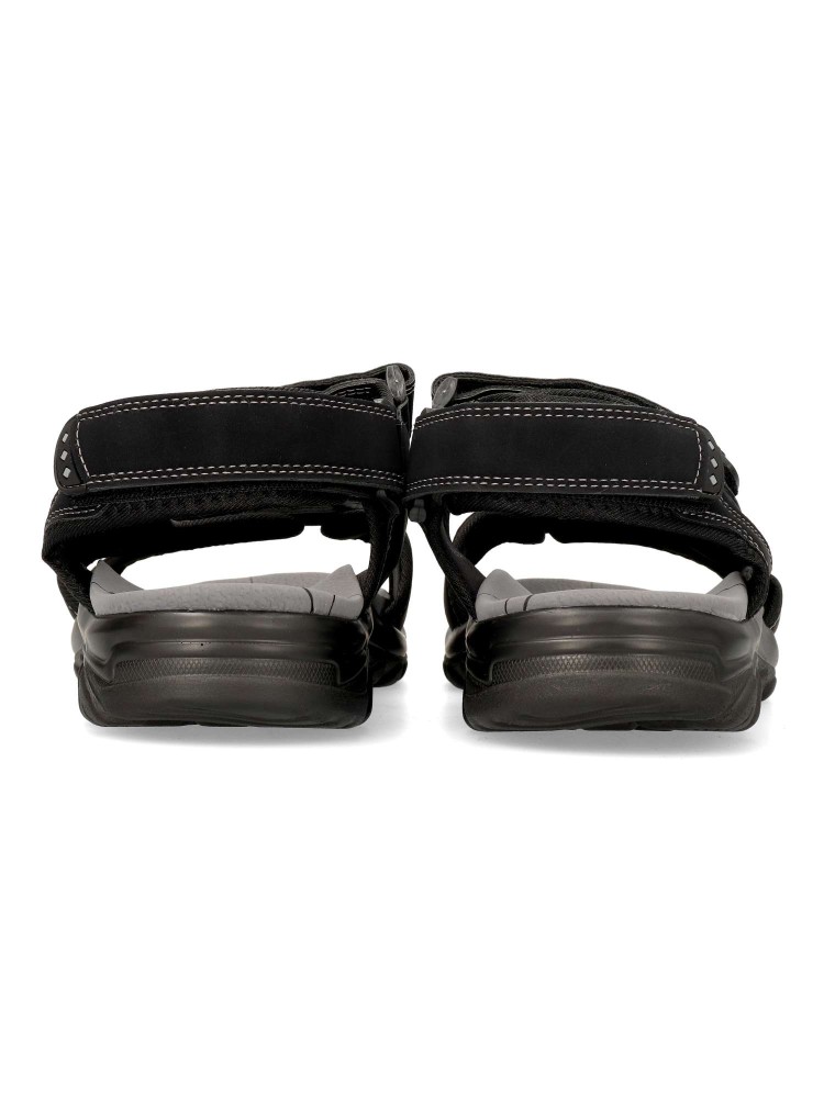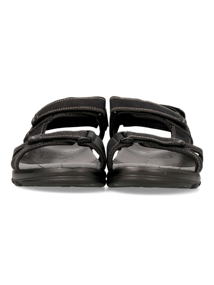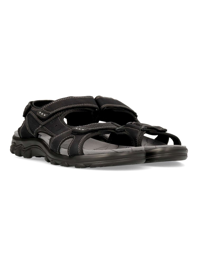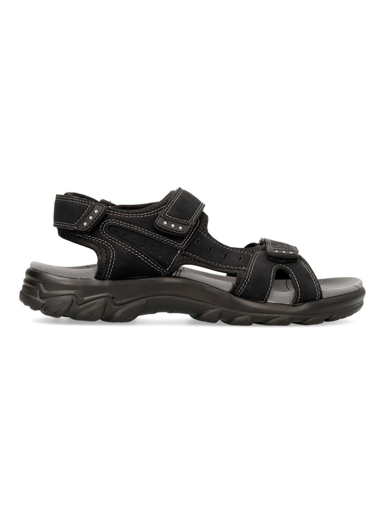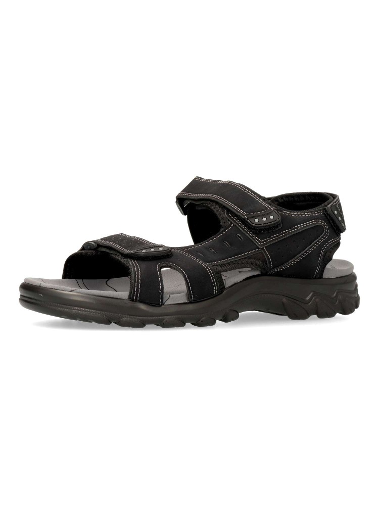 Sandalia cómoda de hombre, tipo californiana. Cierres adherentes ajustables. Fabricada en piel sintética, con suela de goma ligera y flexible. Planta de piel acolchada. Disponible en color negro. Ideal para dar frescura a tus paseos de verano.