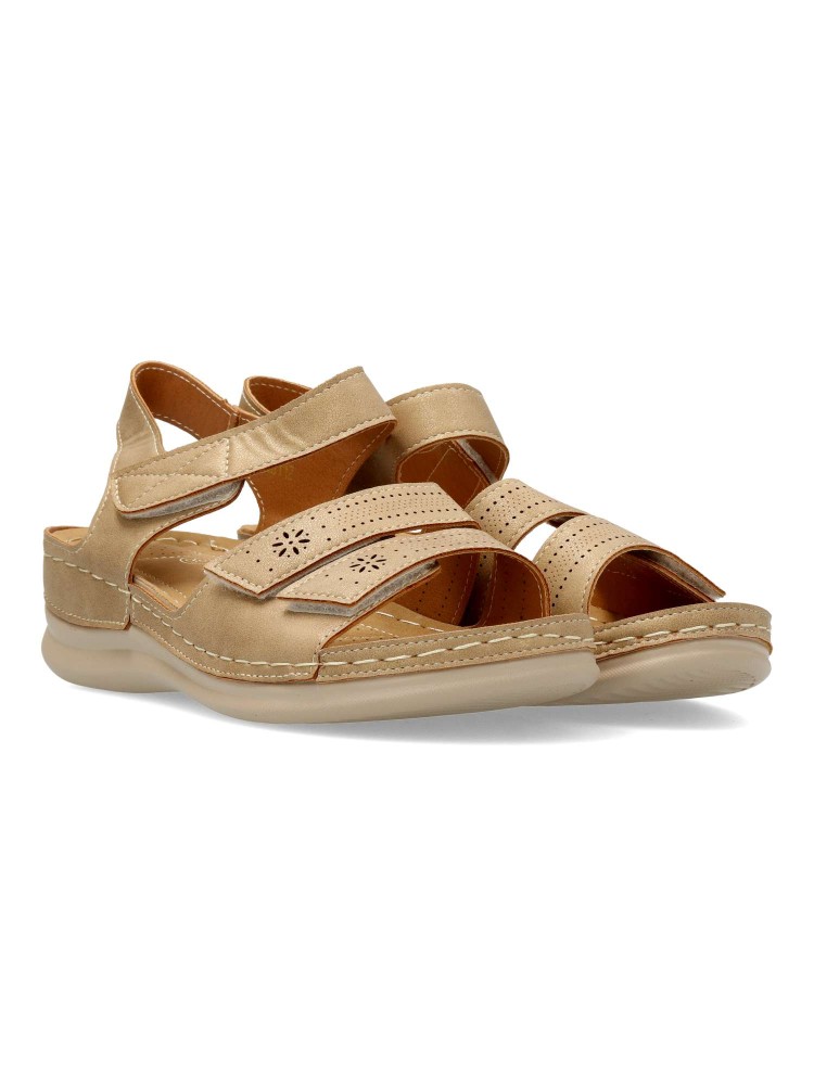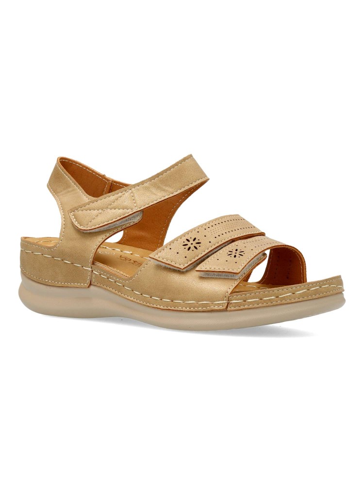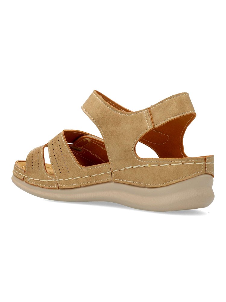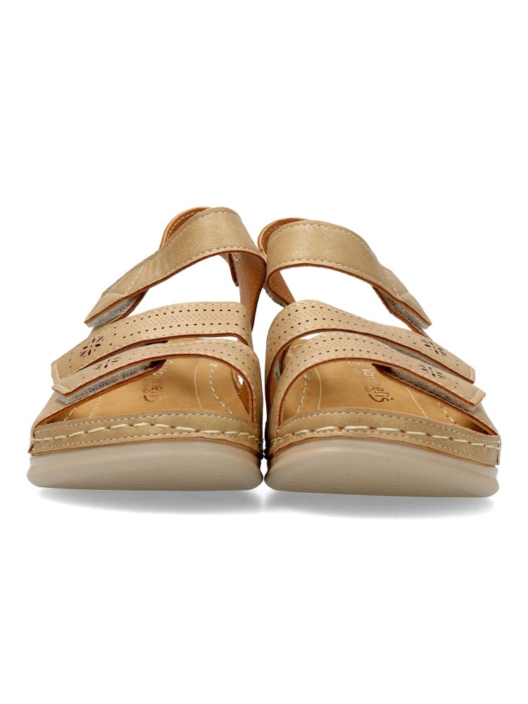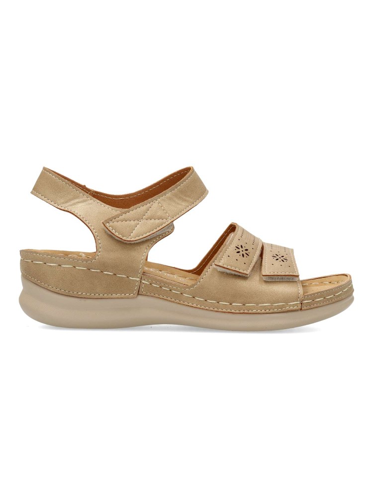 Sandalia cómoda de mujer, con cierre adherente. Fabricado en piel sintética brillo, con suela de goma ligera y flexible. Planta acolchada. Color beige. Máximo confort, en una sandalia versátil, ideal para combinarlas con tus looks de verano.