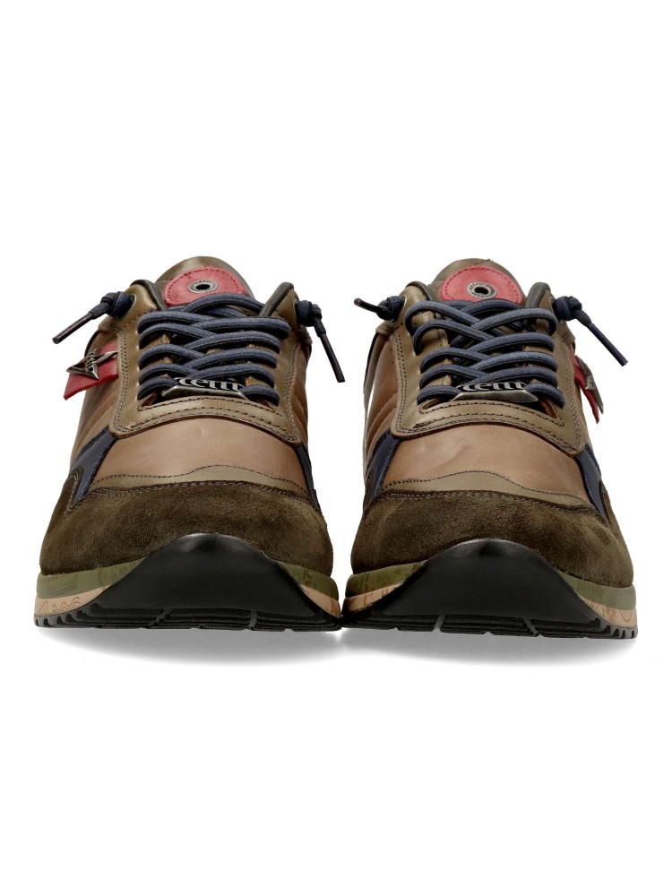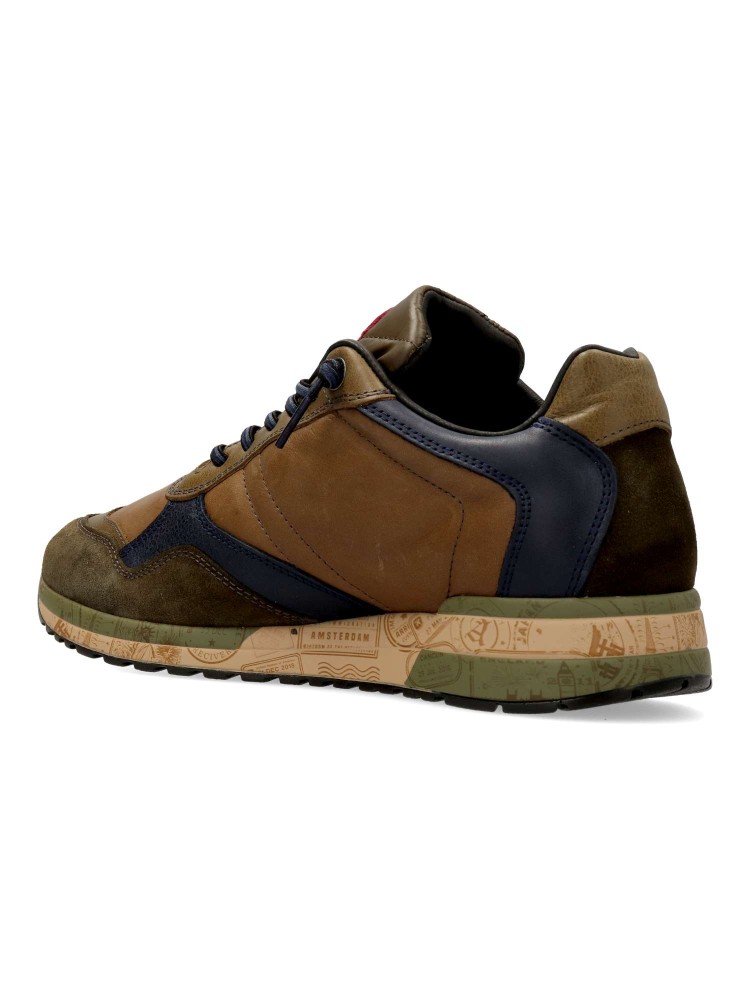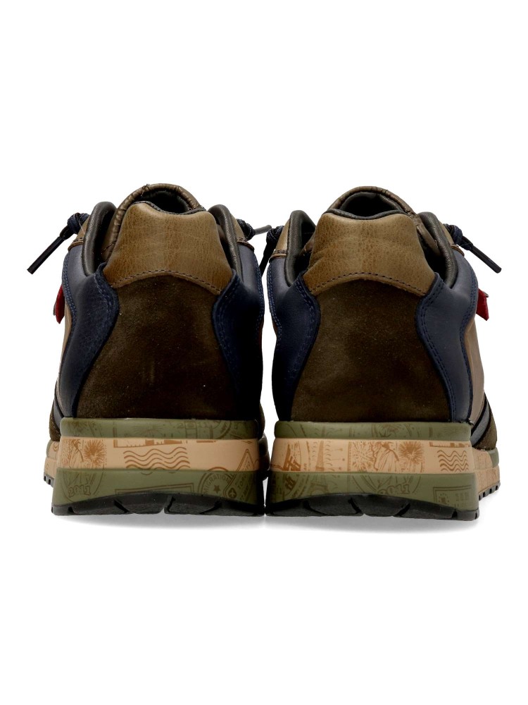 Zapato casual de hombre, con aspecto vintage-retro. Sneakers cómodo fabricado en piel natural y textil. Cierre de cordones elásticos. Plantilla acolchada extraible. Suela de goma gruesa. Color kaki-marino. Estilo urbano. Hecho en España.