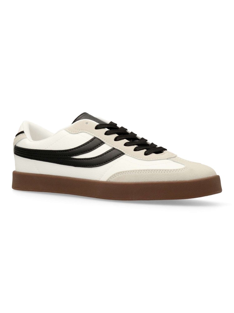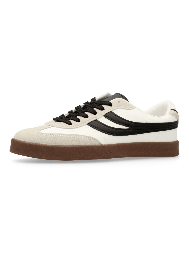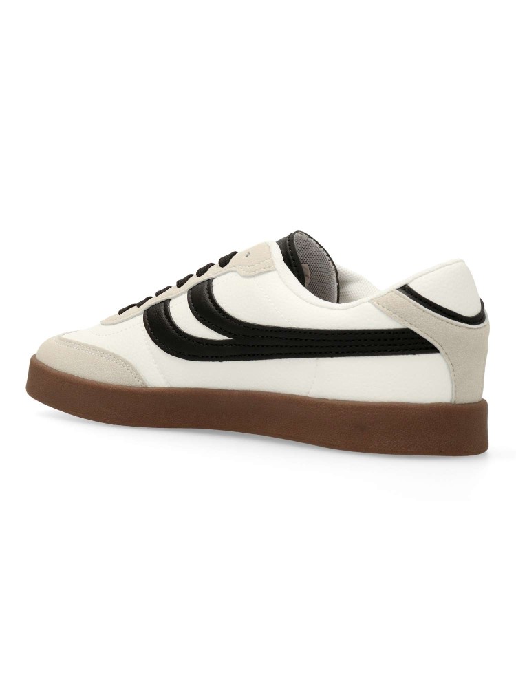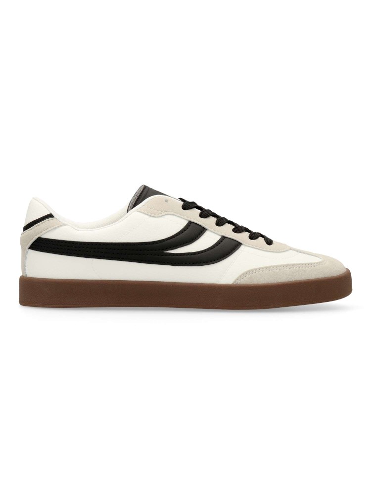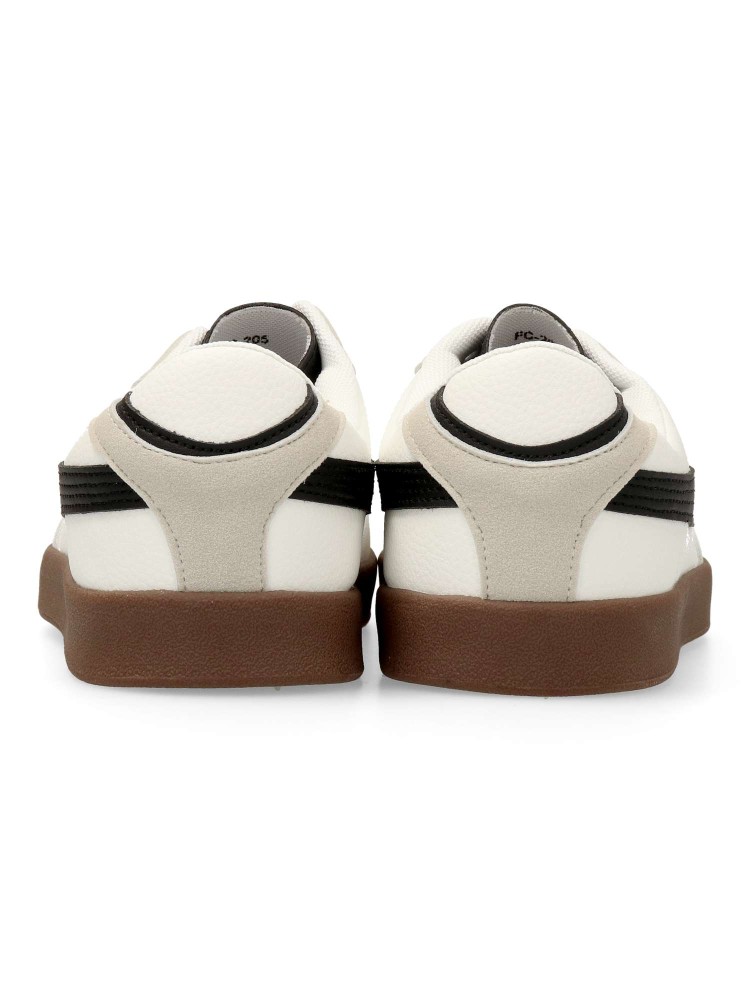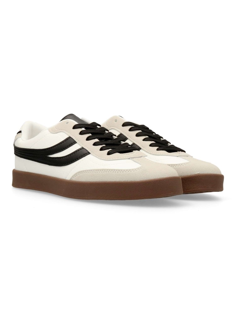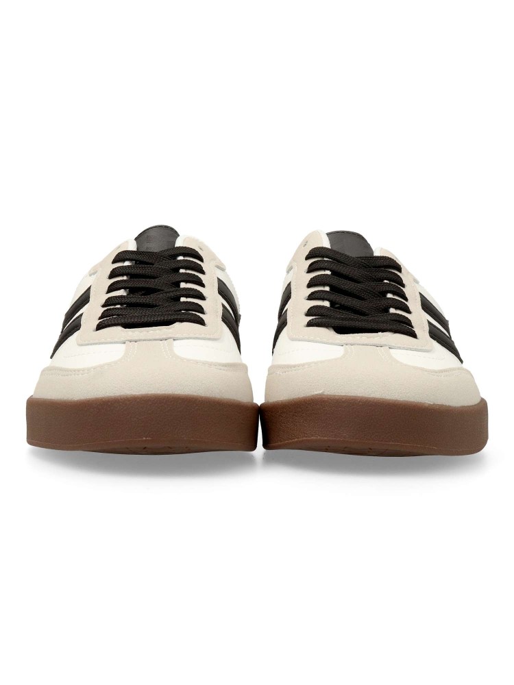 Zapatilla deportiva de mujer, estilo casual. Cierre de cordones. Sneakers fabricado en piel sintética, con suela de goma color caramelo. Plantilla acolchada y extraíble. Color blanco-negro. Silueta estilo casual ideal para vestir sport con ropa urbana.