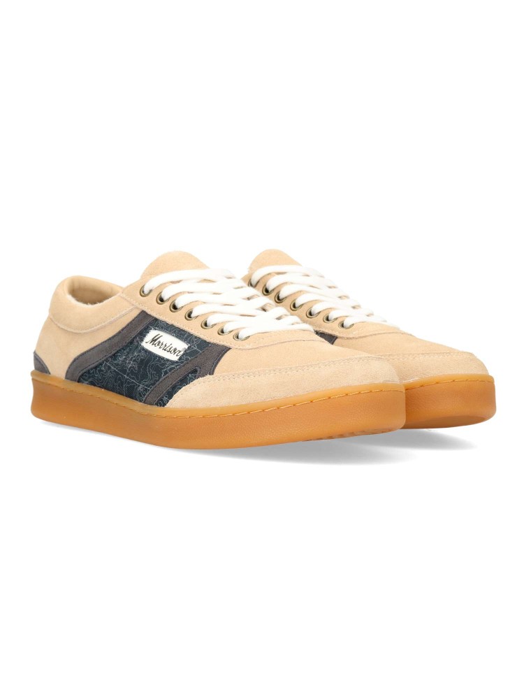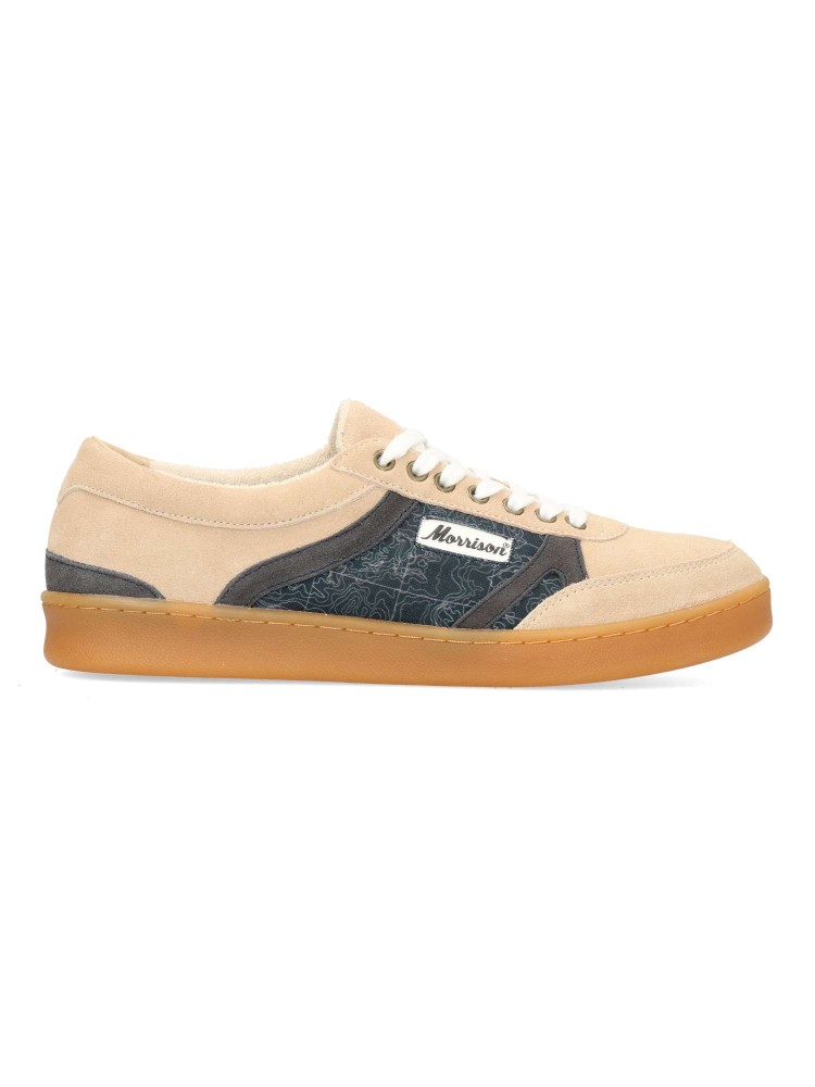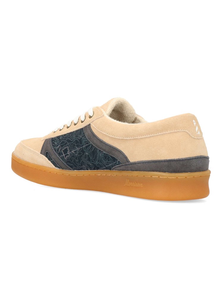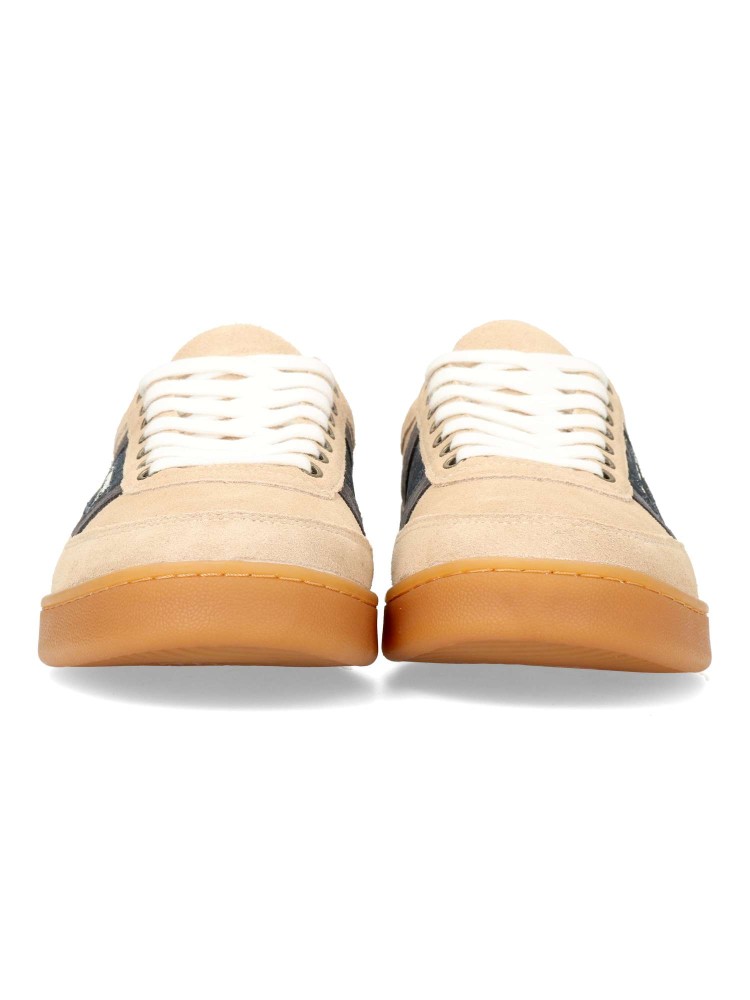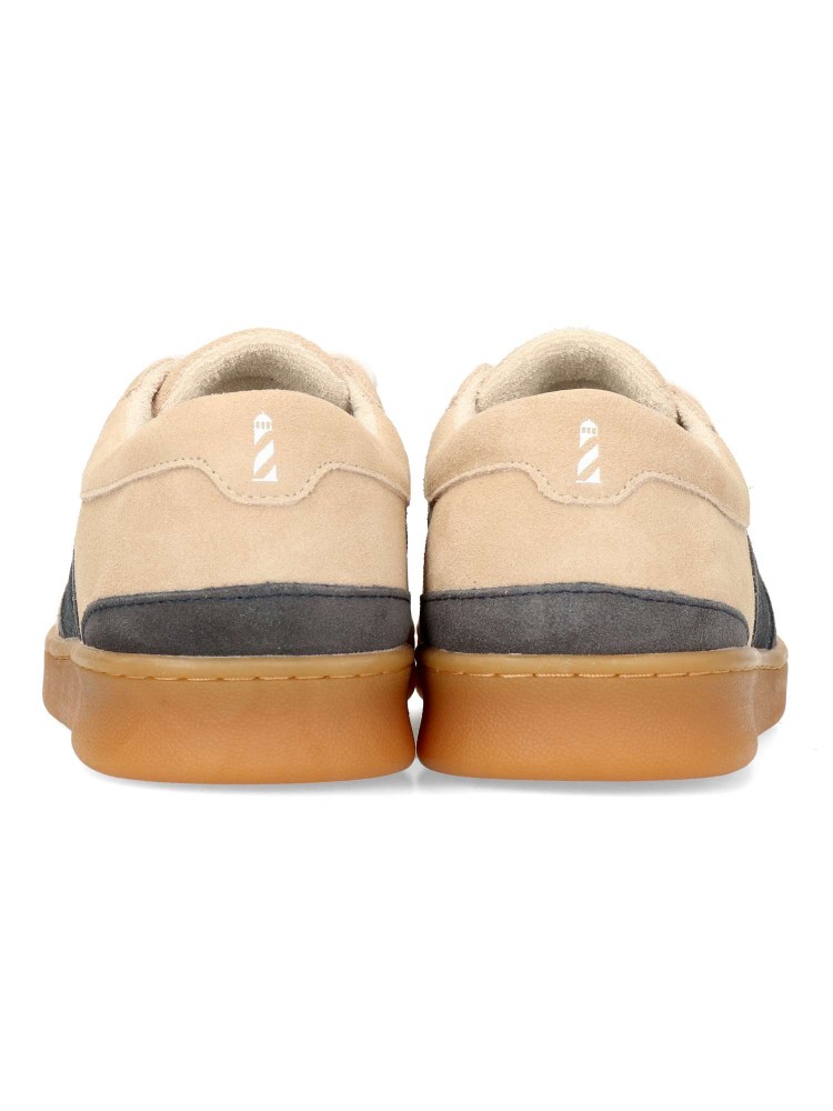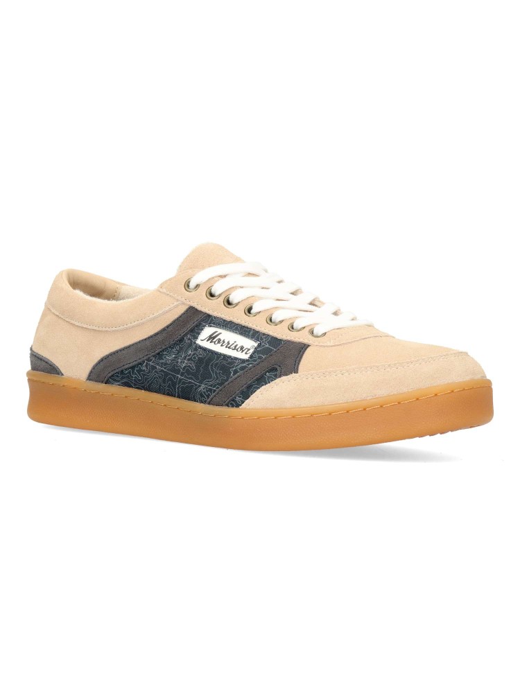 Zapatilla deportiva estilo casual. Cierre de cordones. Diseñada en serraje arena y antracita, con nuestro inconfundible estampado lateral de tipo cartográfico, Nineties Skinner es una pieza única. Combina estilo y confort con este diseño único.