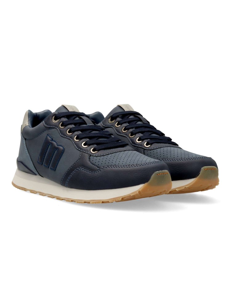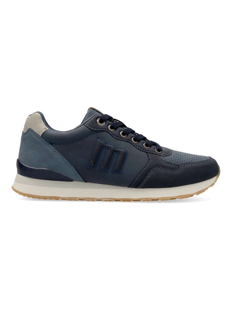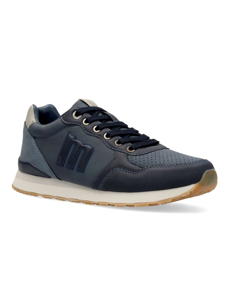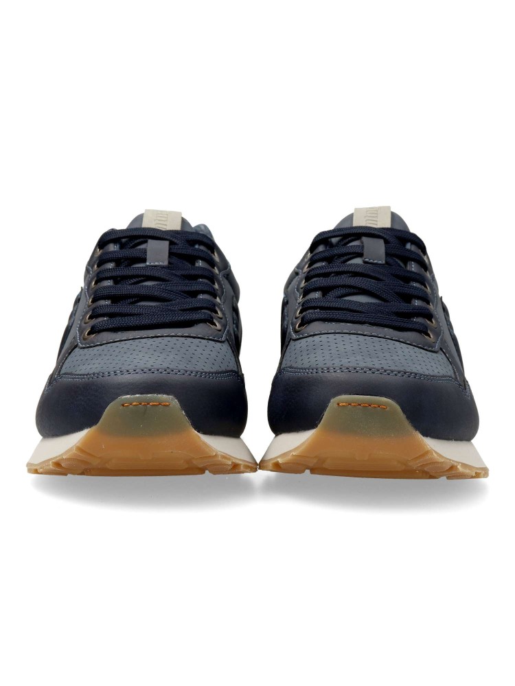 Zapatillas para hombre de Mustang, color marino. Sneakers cómodo, fabricado en piel sintética, con suela de goma color caramelo. Opción versátil y cómoda para el día a día, perfecta para quienes buscan un calzado casual con un toque moderno y funcional.