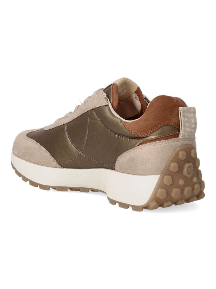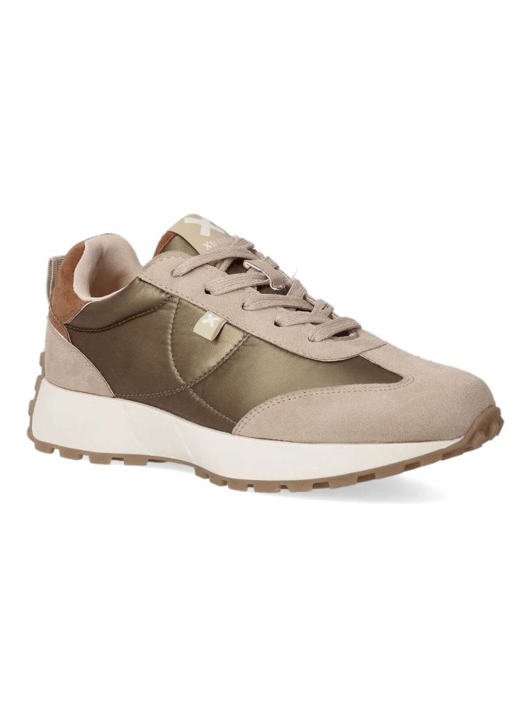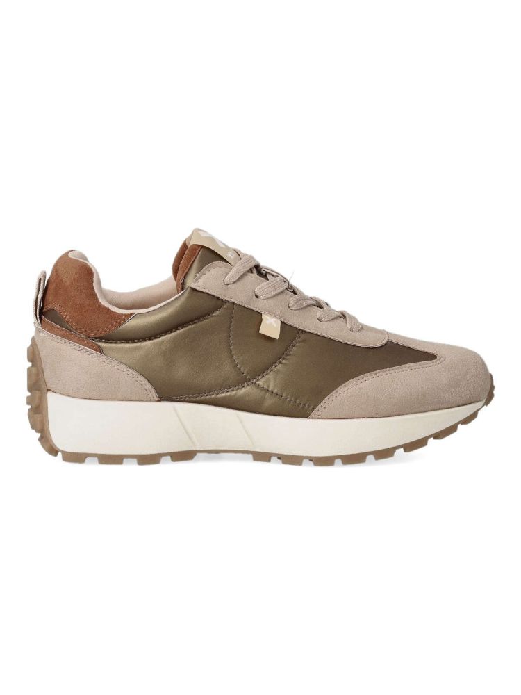 Zapatilla deportiva de mujer, estilo casual. Cierre de cordones. Sneakers cómodo, fabricado en nylon metalizado y antelina. Suela de goma antideslizante. Plantilla acolchada y extraíble. Color platino. Un modelo tendencia con certificado vegano.