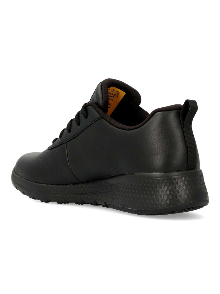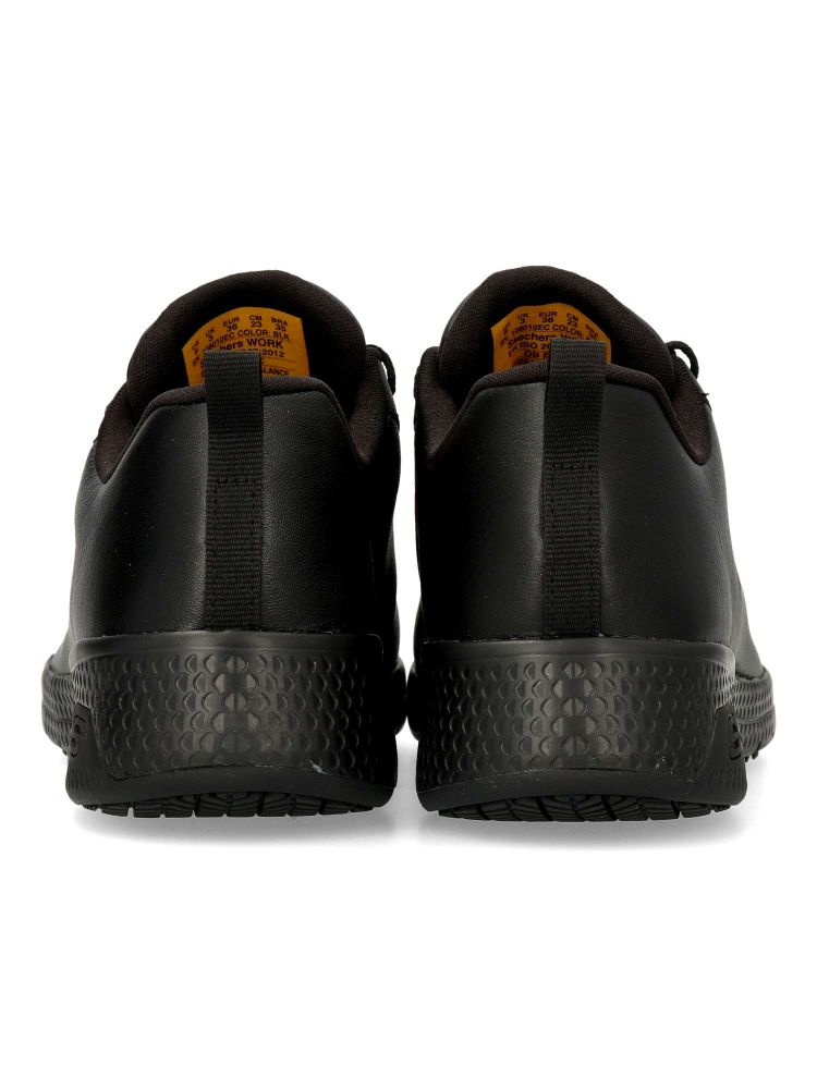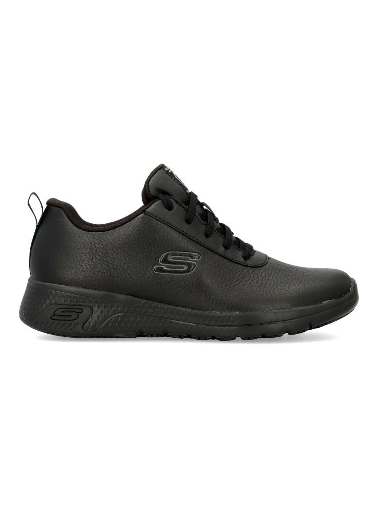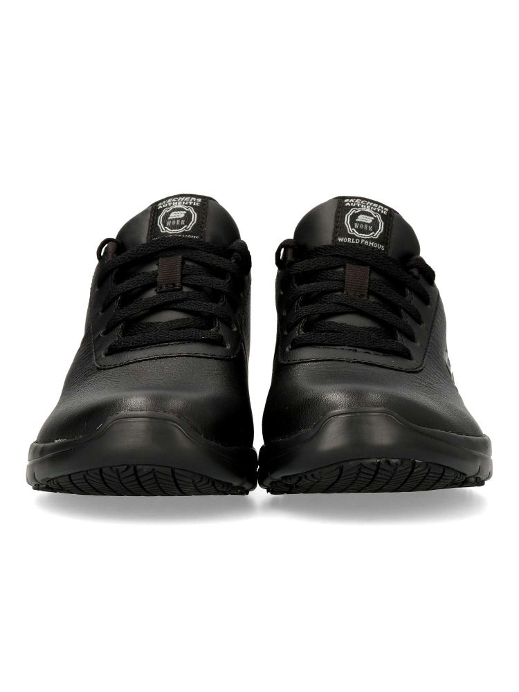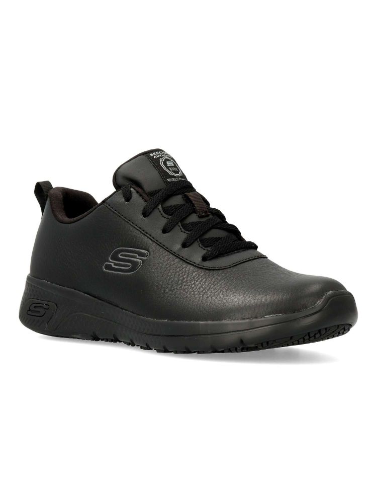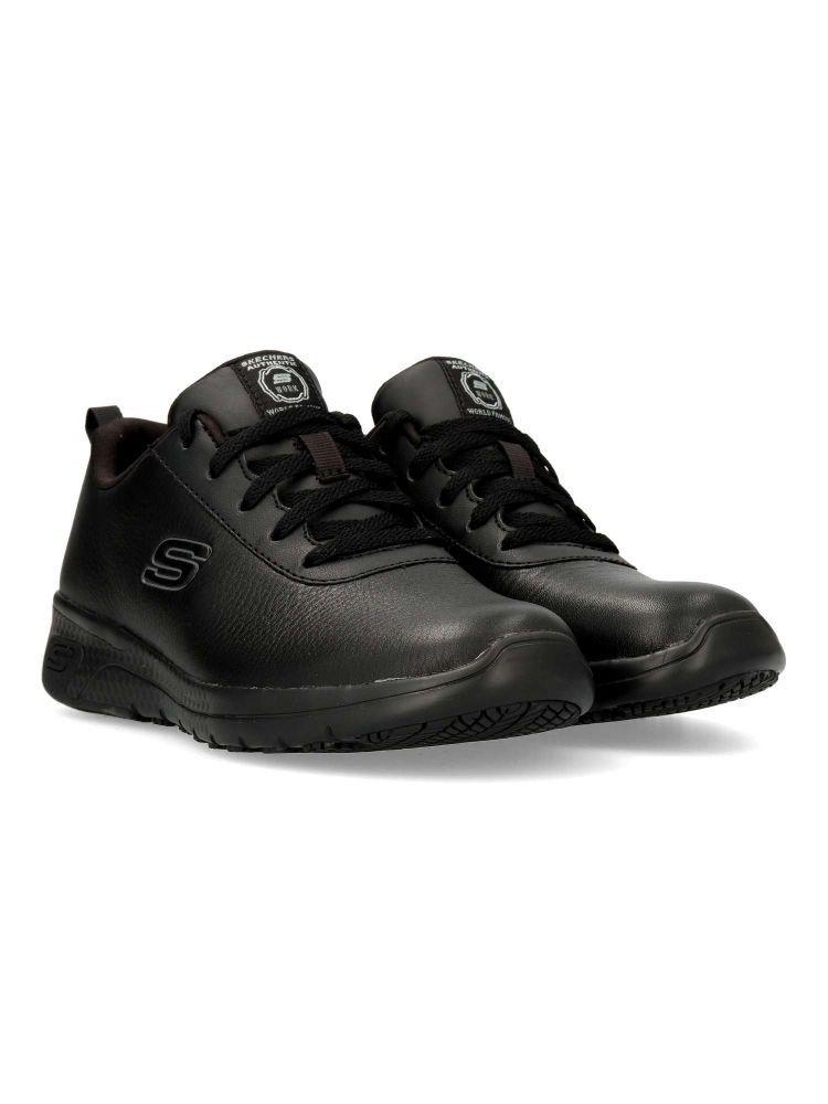 Ofrece soporte, comodidad y seguridad de uso durante todo el día. Modelo con cordones con parte superior de piel y piel sintética, plantilla con amortiguación Skechers Memory Foam™ y suela antideslizante (incluso en superficies húmedas y aceitosas).