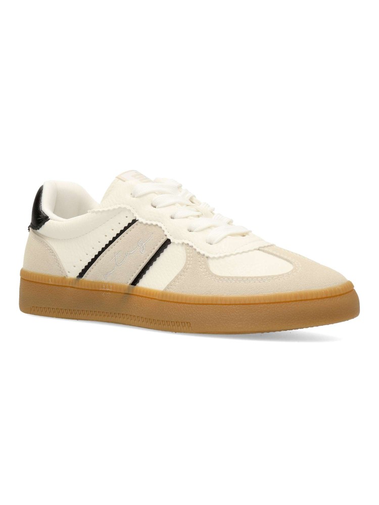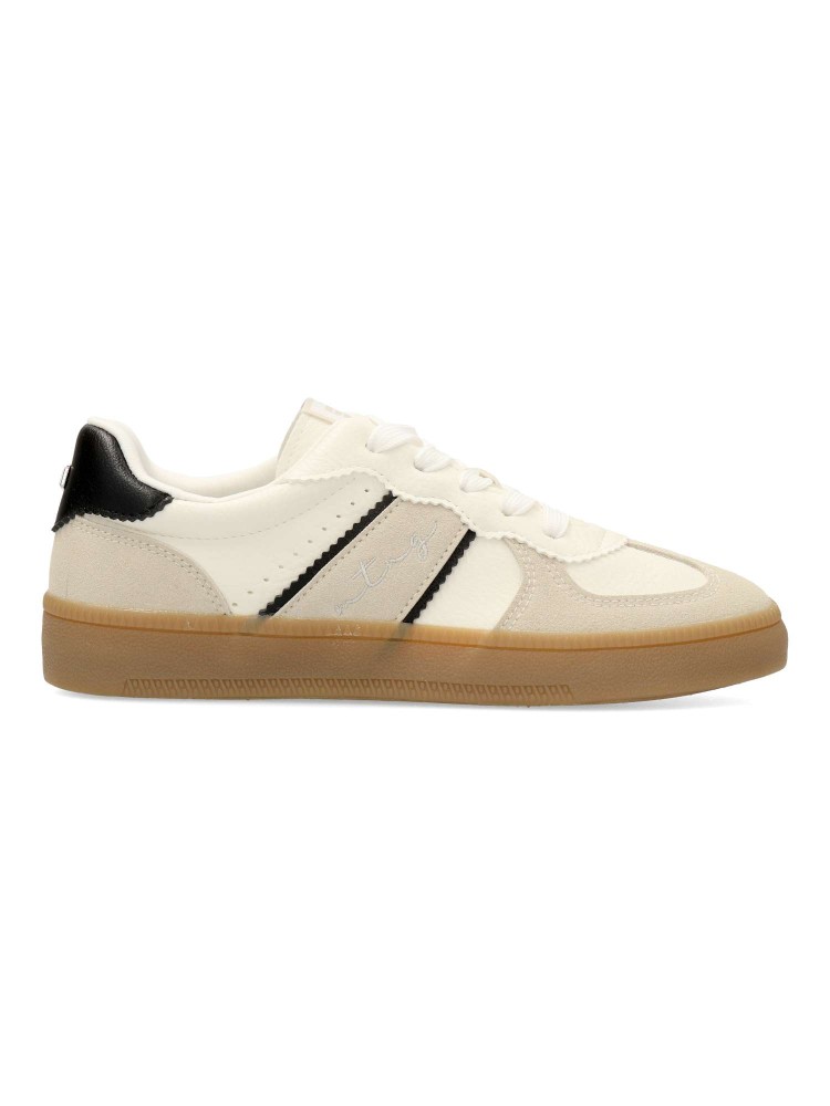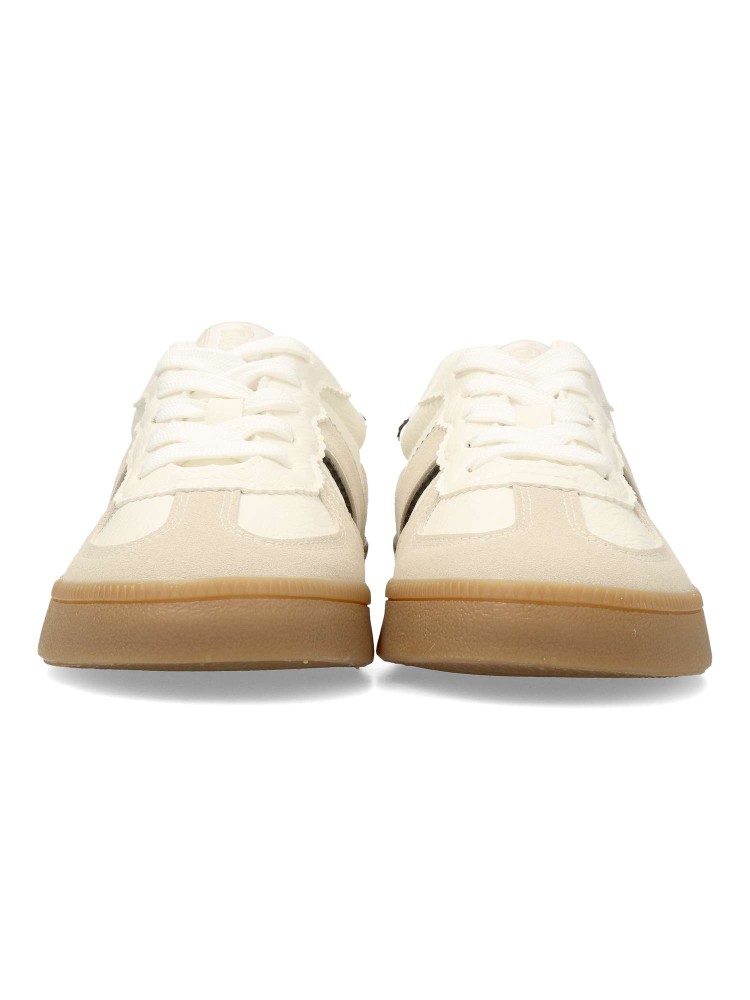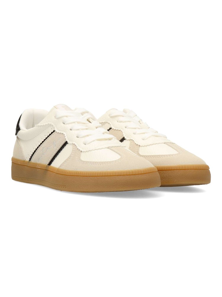 Zapatillas deportivas blancas con diseño casual. Este calzado combina paneles de texturas suaves y un toque retro con su suela de goma en tono caramelo, ofreciendo estilo y comodidad. Plantilla acolchada. Ideal para complementar looks relajados.