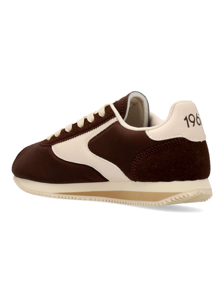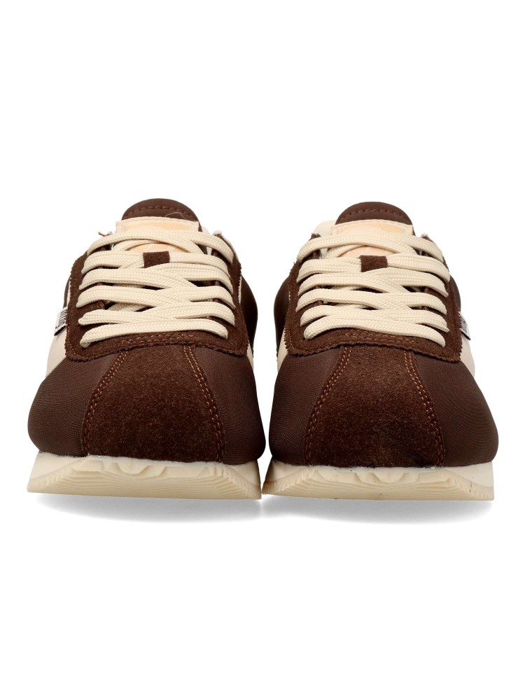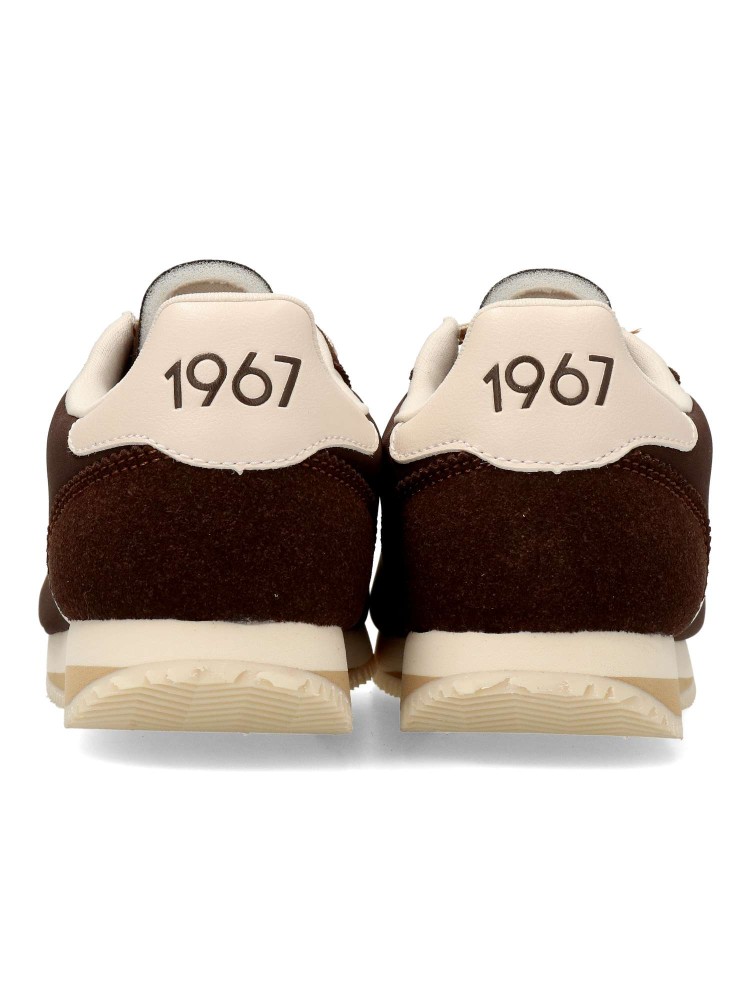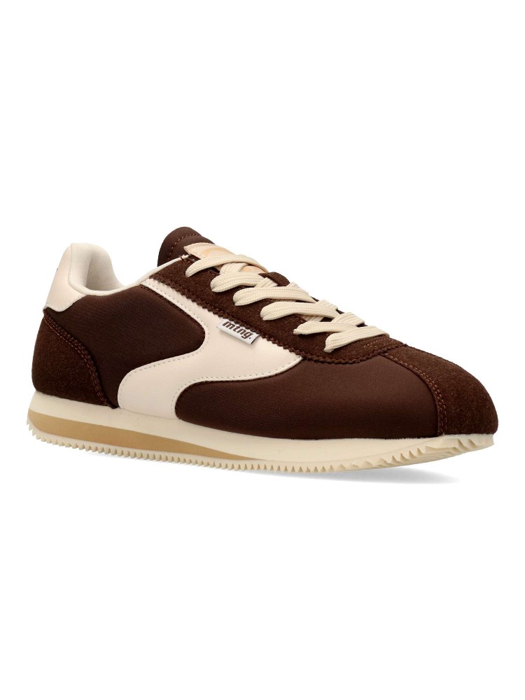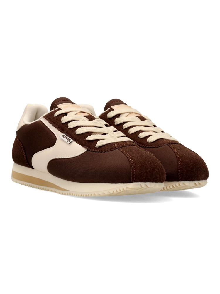 Zapatillas Mustang de color marrón para mujer, de estilo retro. Diseño clásico con silueta vintage. Fabricada en piel vegana con suela de goma dentada y ligera. Cierre de cordones. Plantilla acolchada Comfort Foam. Certificado vegano.