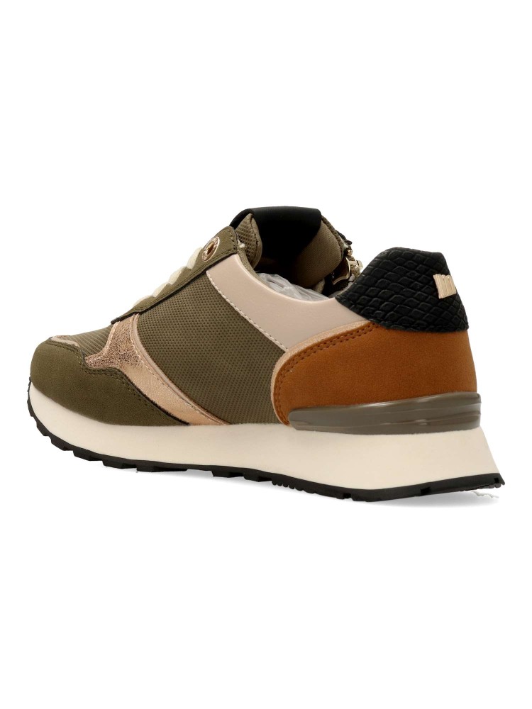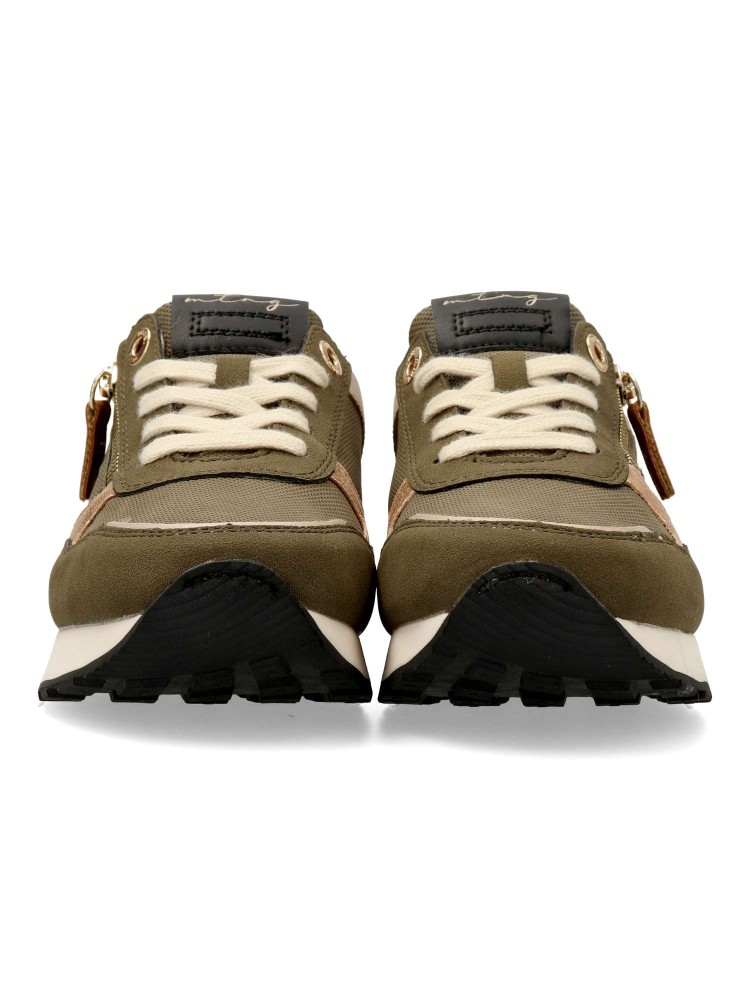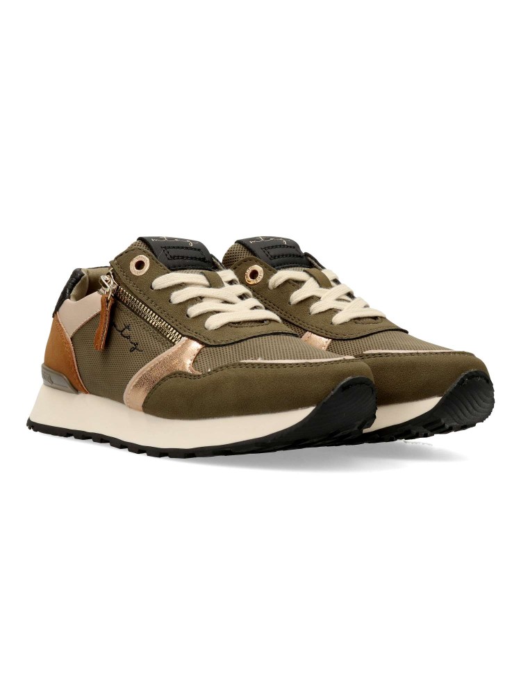 Zapatillas color kaki para mujer de la marca Mustang. Cierre de cordones y cremallera lateral. Fabricadas en piel sintética con suela de goma ligera y cómoda. Destacan por su diseño versátil, ideales para el día a día, adaptándose a diferentes estilos.