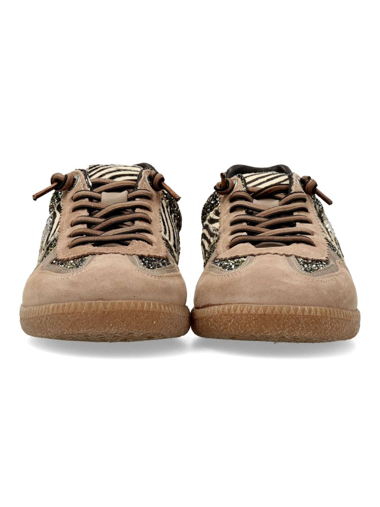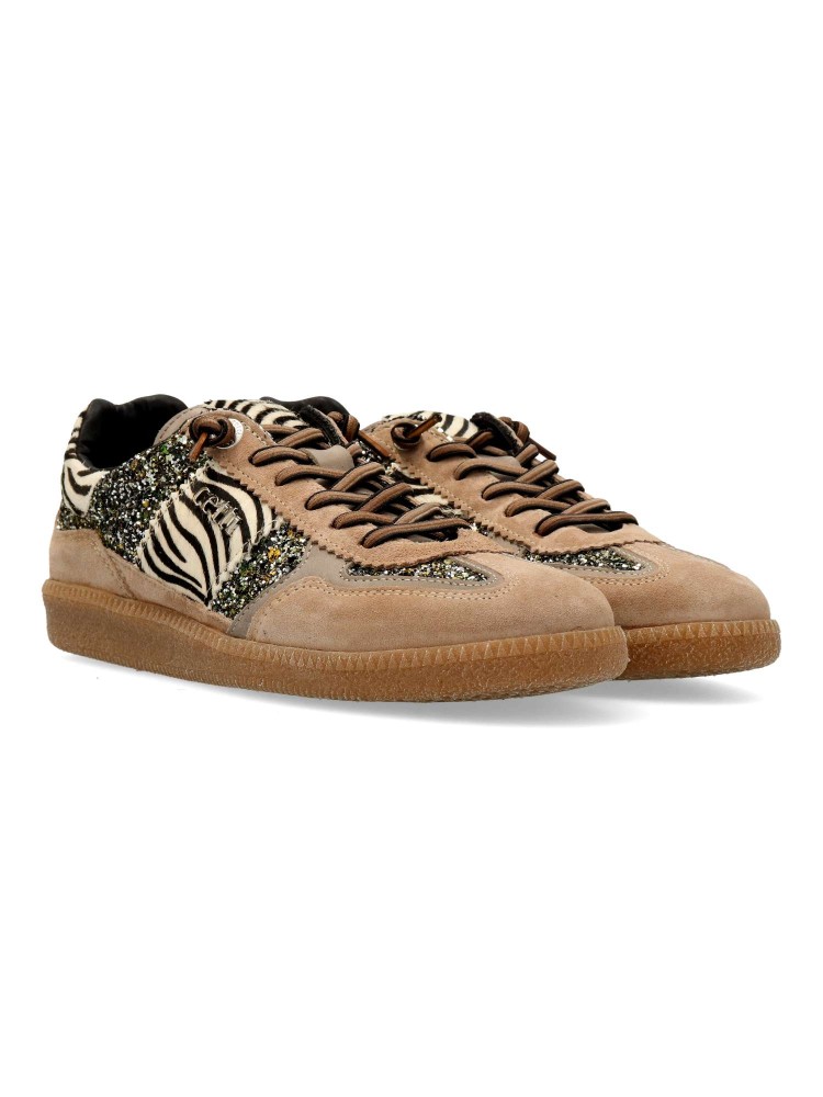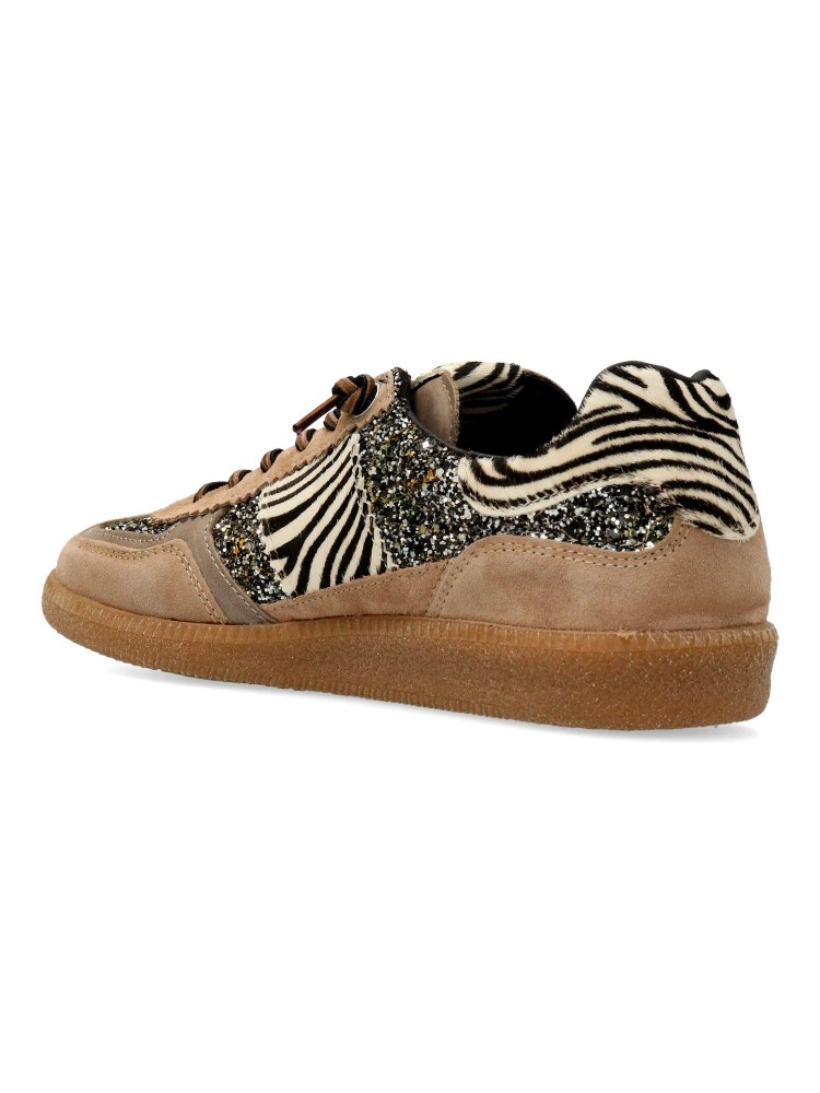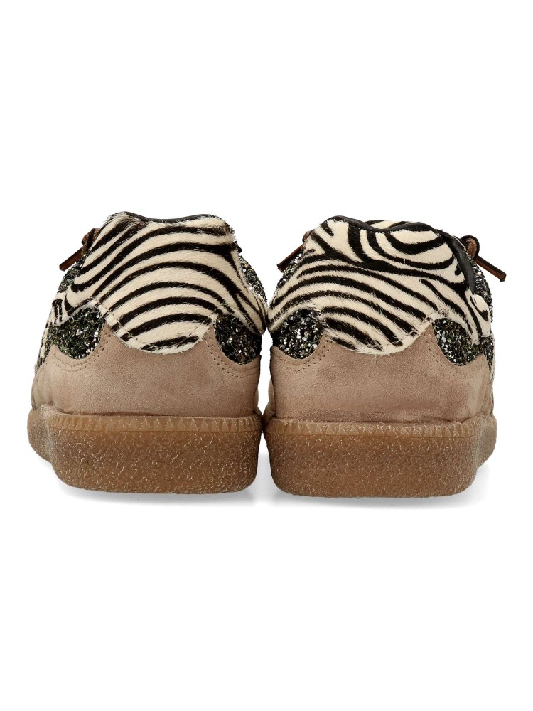 Tenis deportivo de mujer con aspecto vintage retro. Sneakers cómodo fabricado en piel natural y textil. Cierre de cordón elástico. Plantilla acolchada extraible. Detalle print leopardo y glitter. Fácil de combinar con tu outfit urbano. Hecho en España.