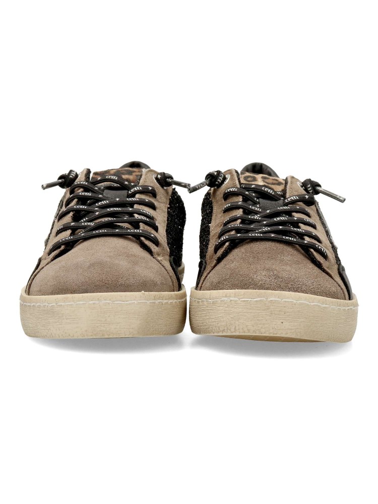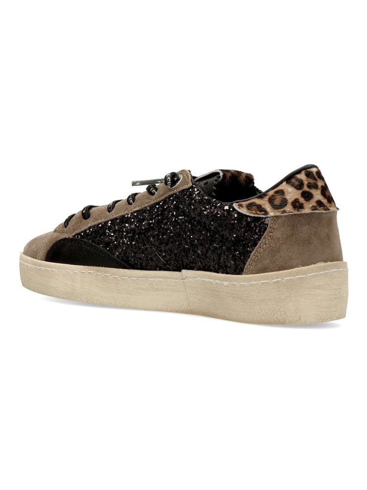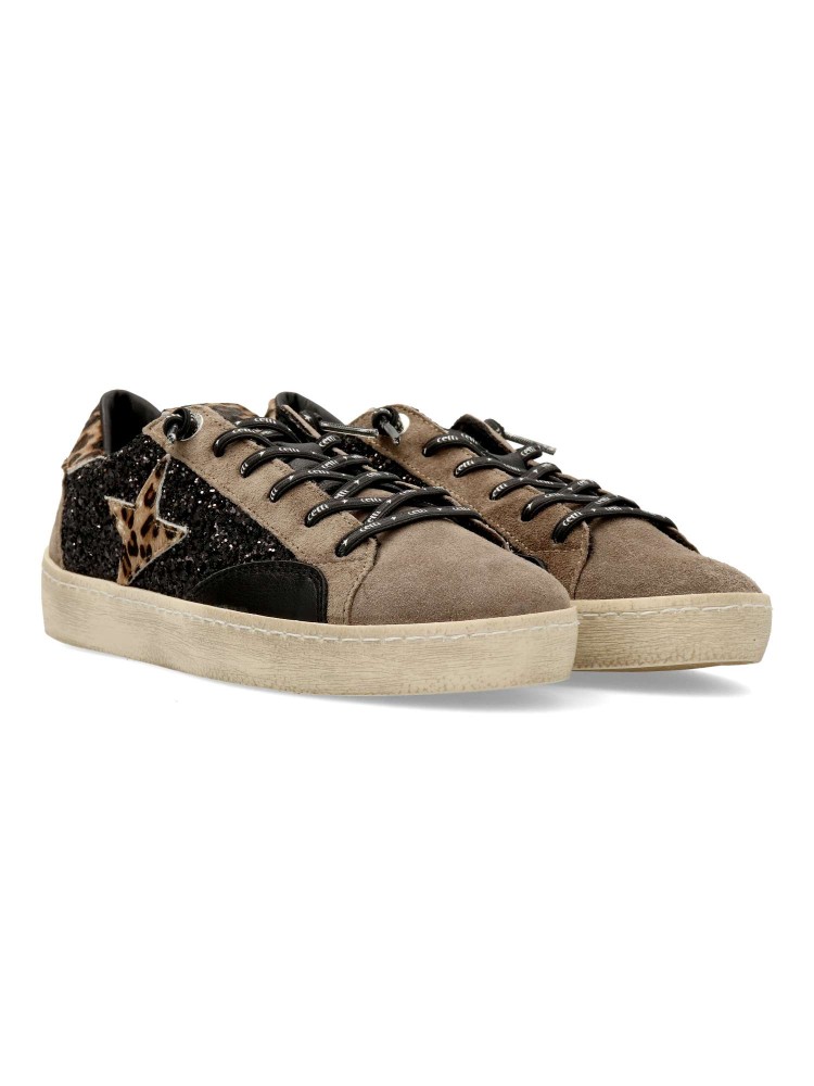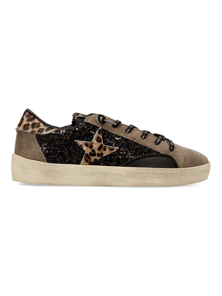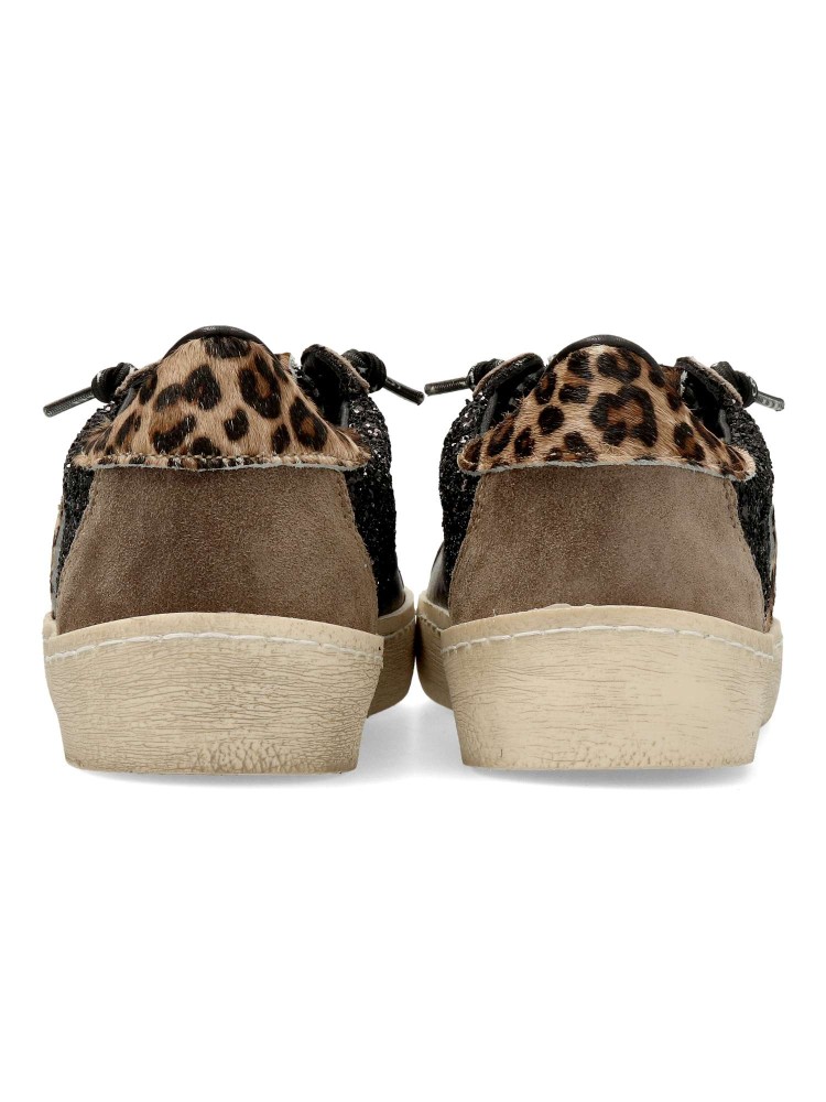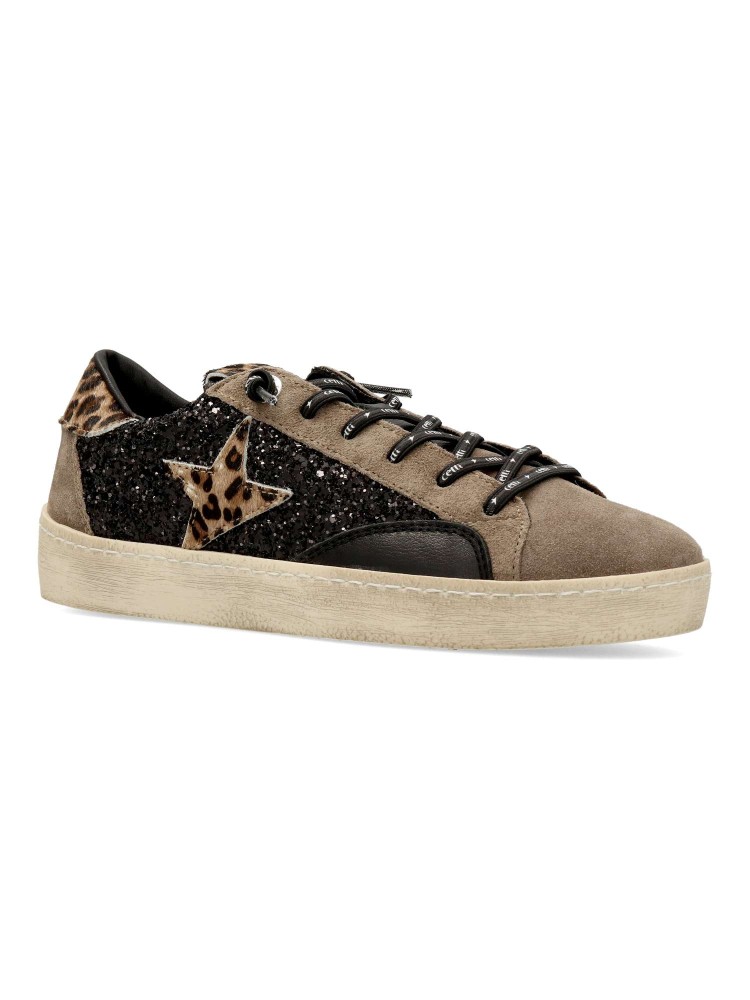 Tenis urbana de mujer con aspecto vintage retro. Sneakers cómodo fabricado en piel natural y sintético. Detalle glitter. Cierre de cordón elástico. Plantilla acolchada extraible. Color negro. Fácil de combinar con tu outfit urbano. Hecho en España.