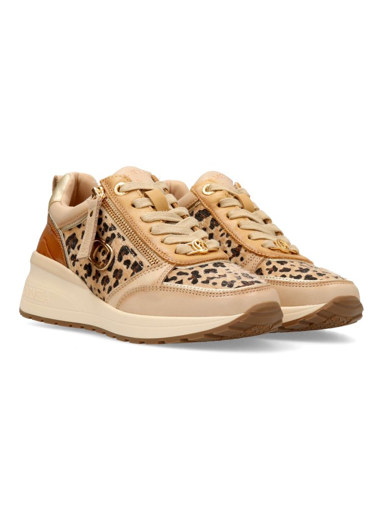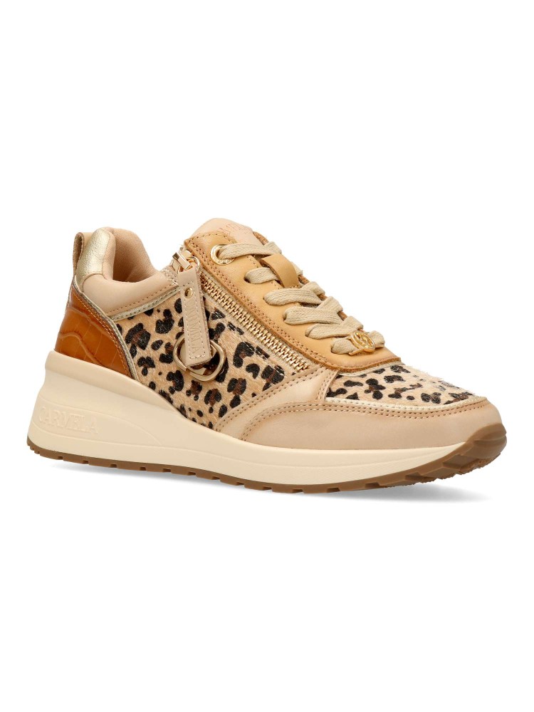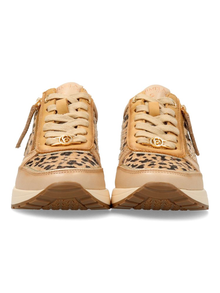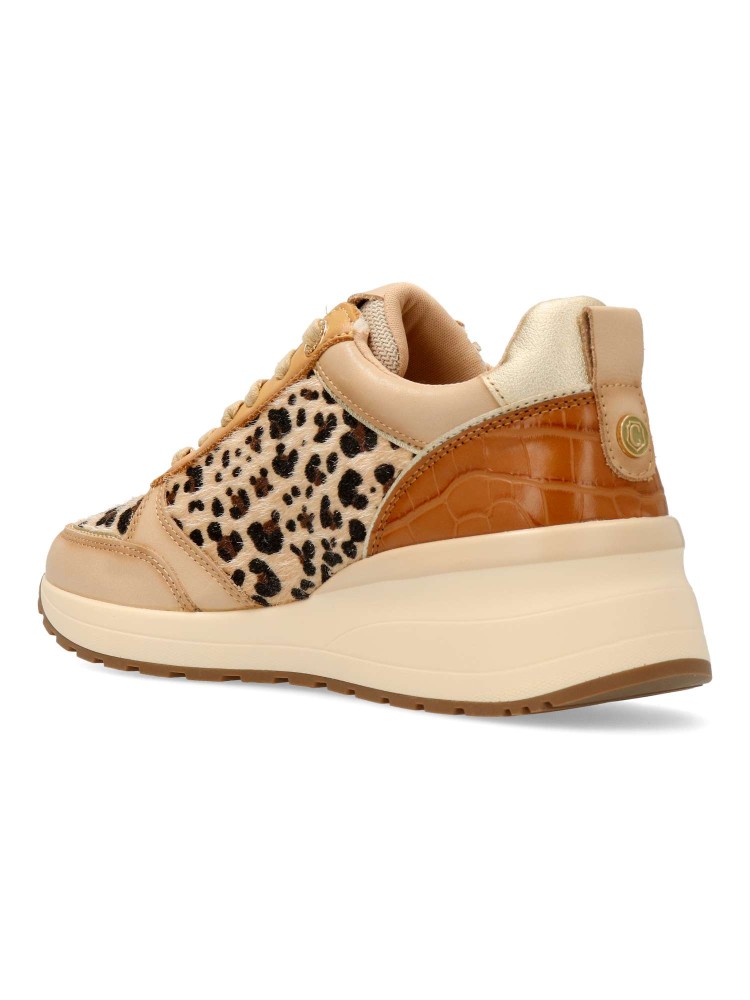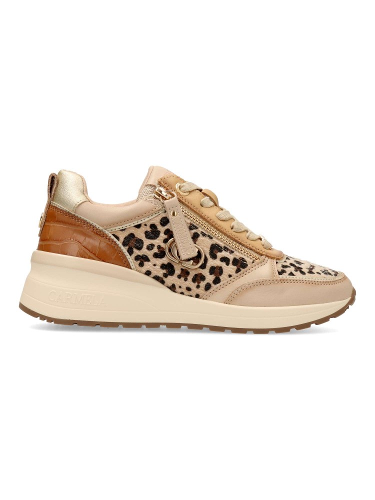 Deportiva de mujer, fabricada en piel de alta calidad. Suela de goma antideslizante. Plantilla acolchada y extraíble. Cierre de cremallera lateral y cordones. Detalle trasero con tachuelas y grabado coco. Elegante estampado leopardo.