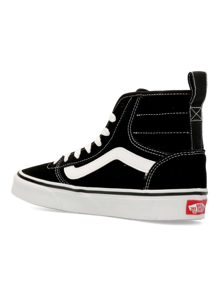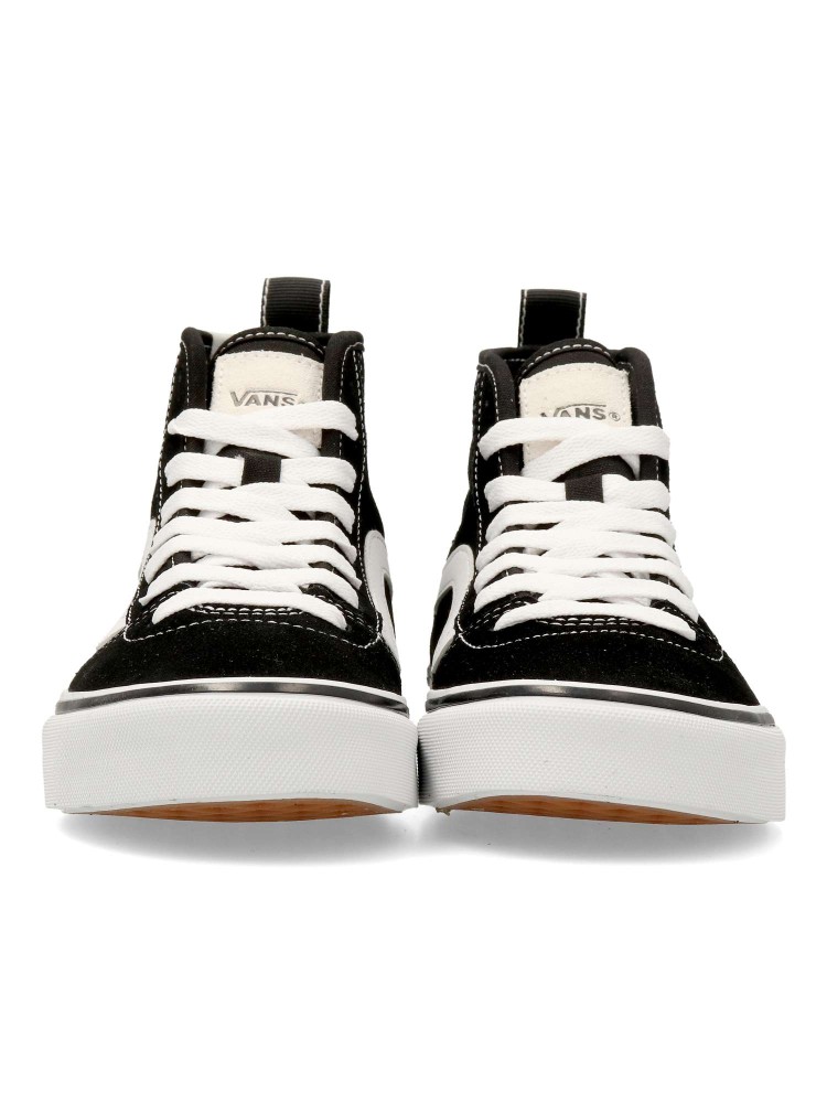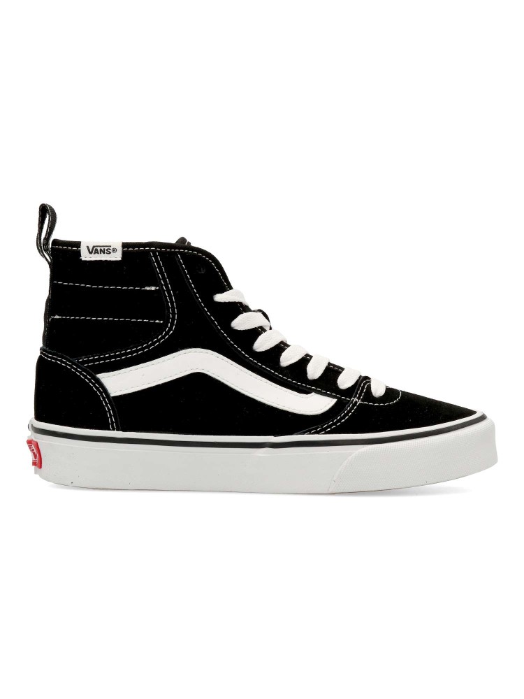 Las Vans Ashwood HI son unas zapatillas de caña alta para niño con cierre de cordones y cremallera lateral. Fabricadas en piel y textil con suela waffle para una tracción duradera. Cuello acolchado. Color negro-blanco. Diseño cómodo y versátil.