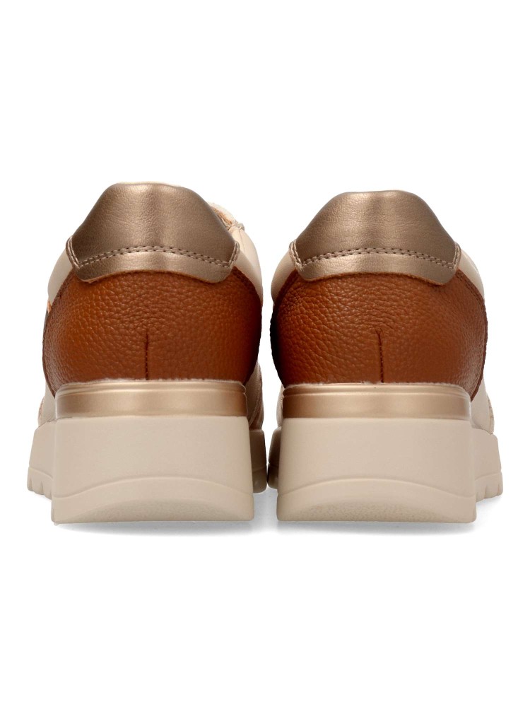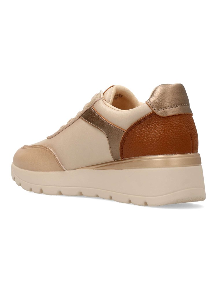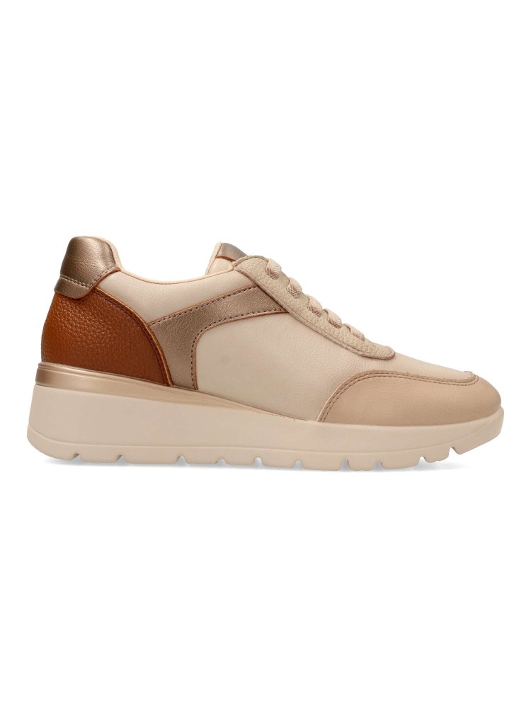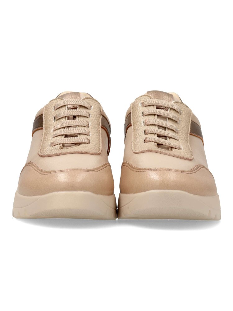 Zapato sport de mujer. Cierre de cordón elástico. Sneakers cómodo, fabricado en piel sintética, con suela de goma. Plantilla acolchada y extraíble. Pequeña cuña de 4 cm. Color beige. Diseño casual para vestir arreglado, o con looks más informales.