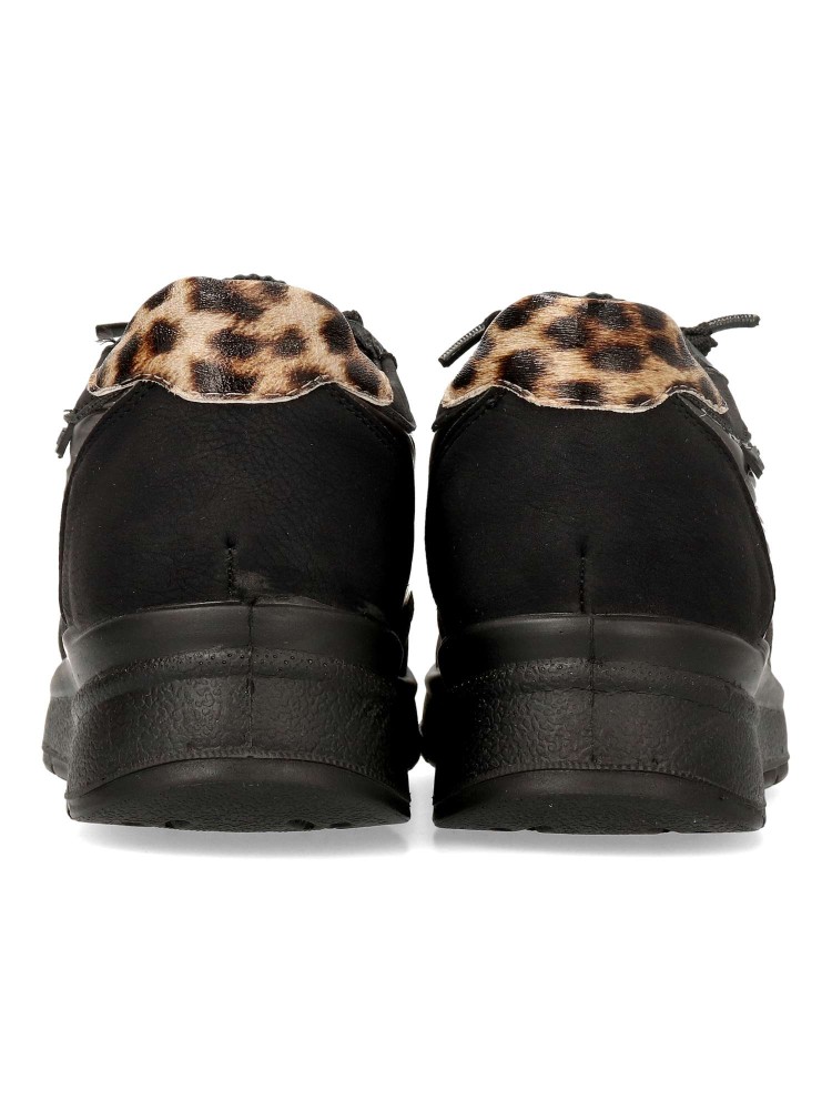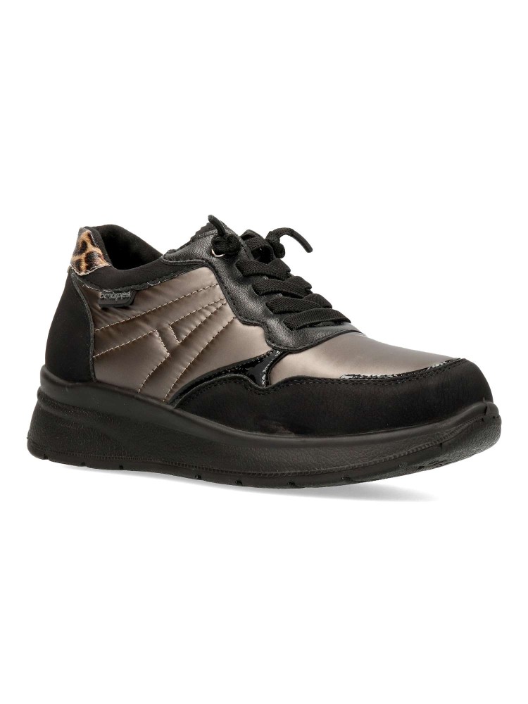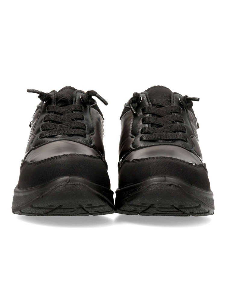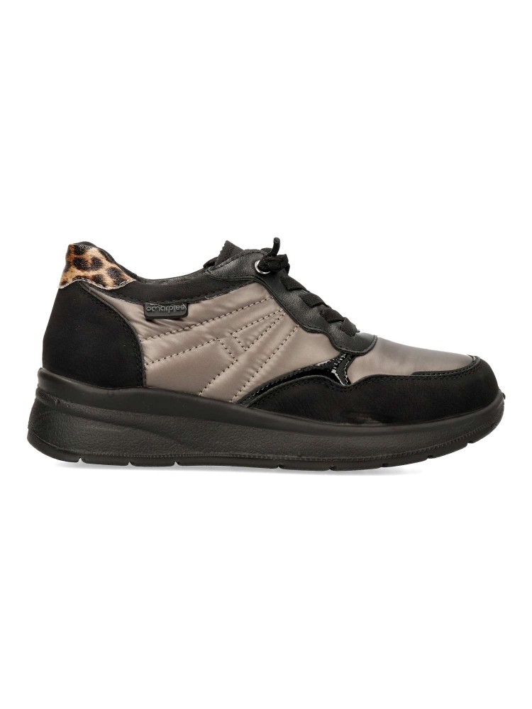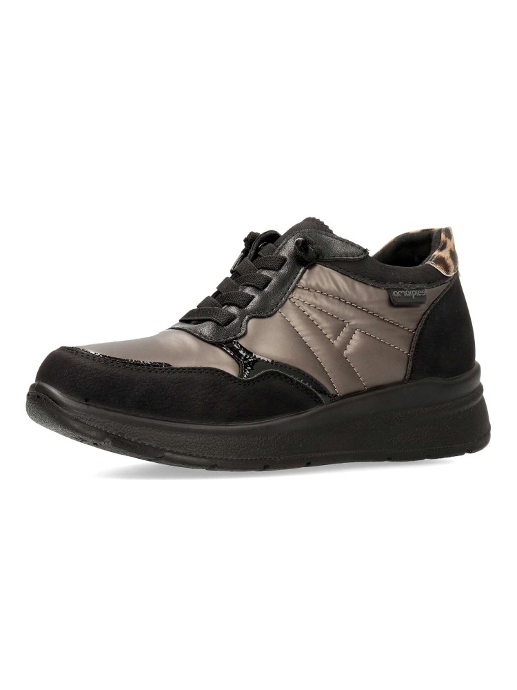 Zapato cómodo de mujer, con cierre de cordón elástico. Fabricado en piel sintética y textil acolchado. Suela de goma ligera y flexible. Plantilla acolchada y extraíble. Disponible en color negro. Amarpies, diseño versátil para ofrecer el máximo confort.