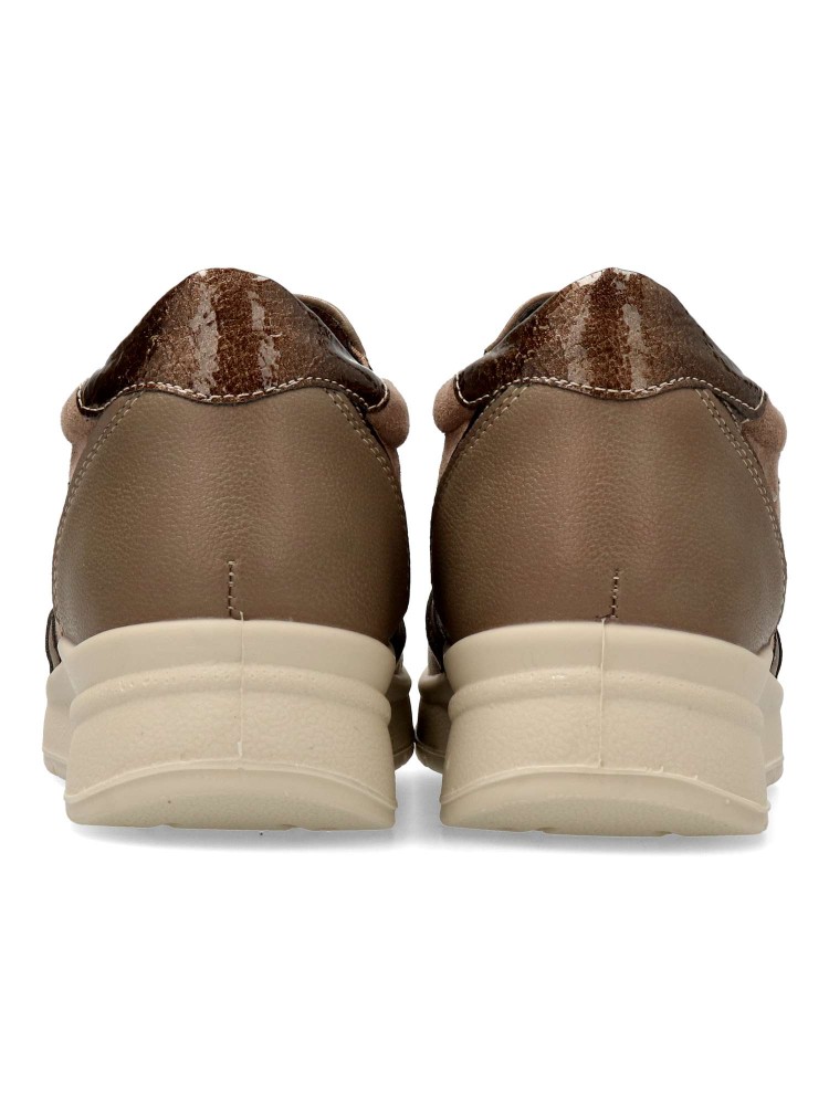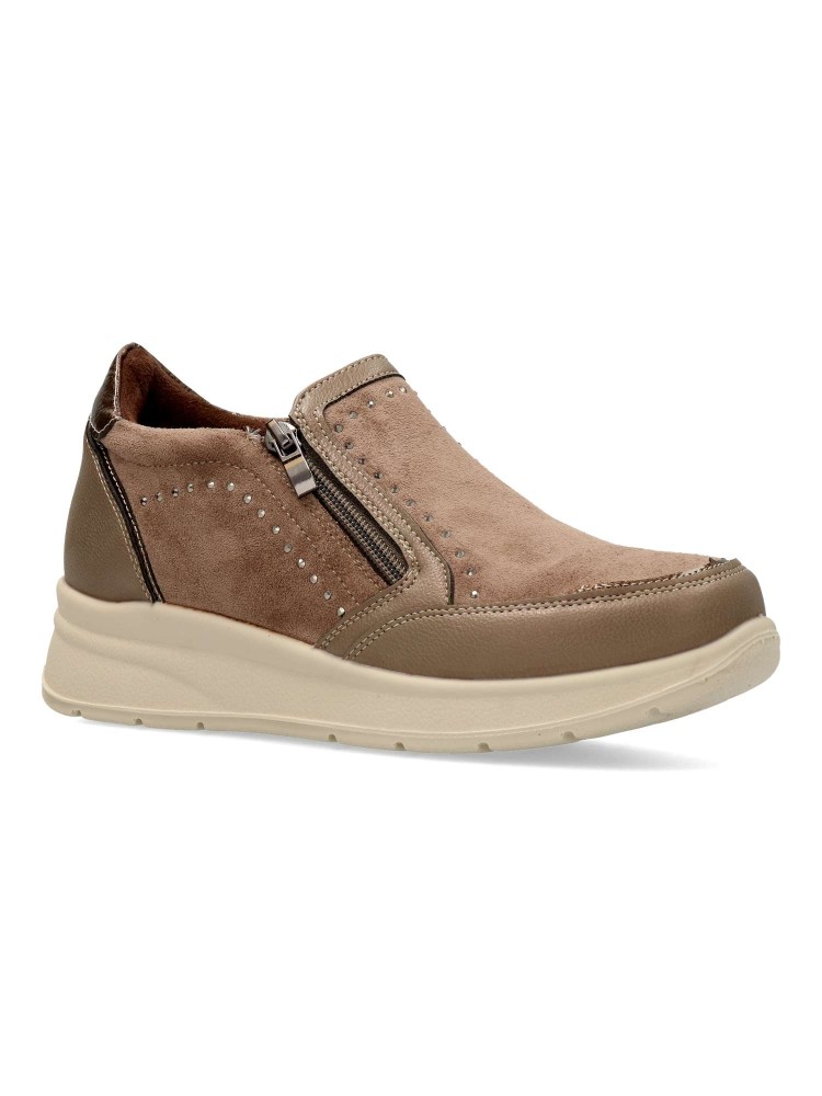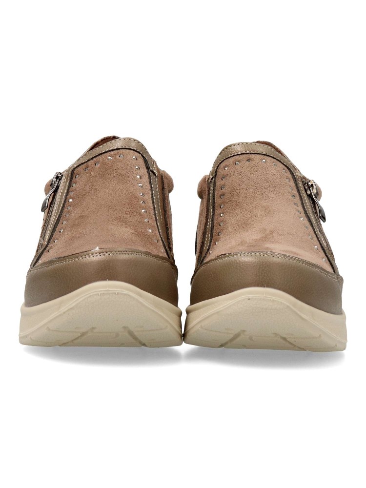 Zapato cómodo de mujer, con cierre de cremallera lateral. Fabricado en piel sintética antelina, con suela de goma ligera y flexible. Plantilla acolchada y extraíble. Disponible en color taupe. Amarpies, diseño versátil para ofrecer el máximo confort.