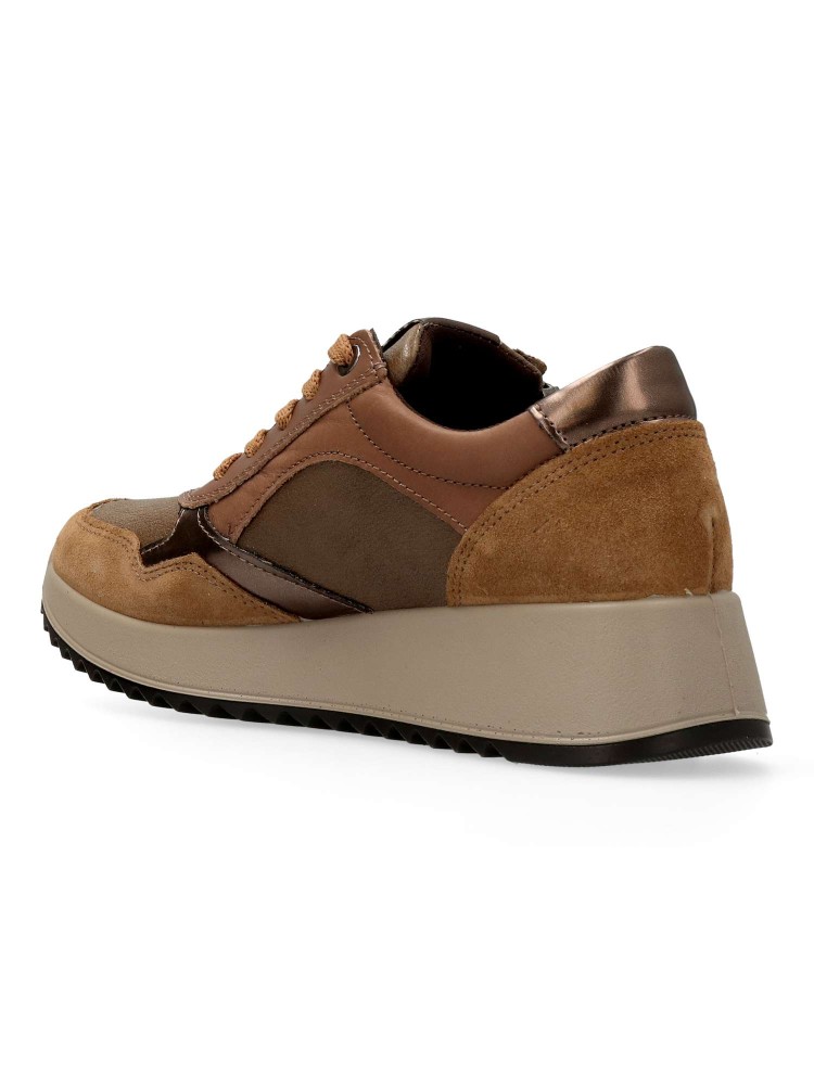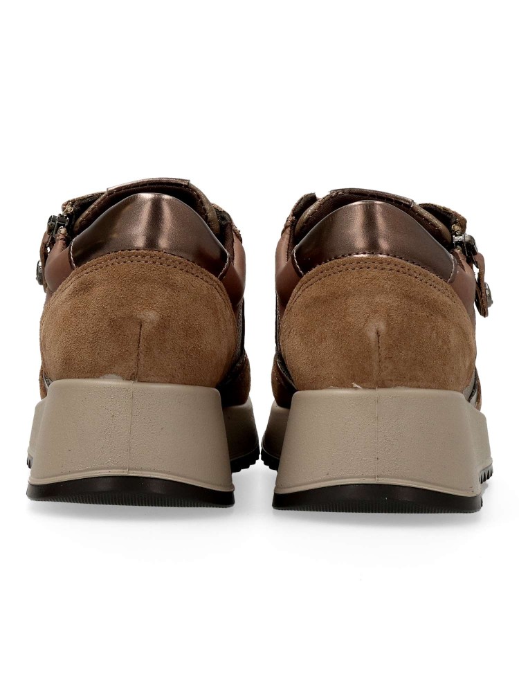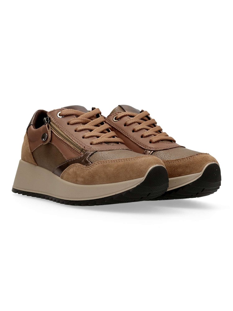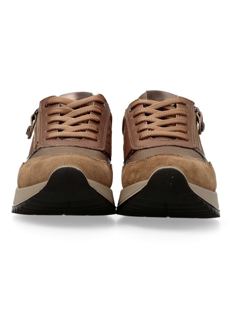 Zapato cómodo de mujer, estilo casual. Cierre de cordones y cremallera. Modelo ligero, flexible y transpirable. Fabricado en piel natural y sintética. Plantilla extraíble de piel. Color taupe-bronce. Cuña de 4 m. Diseño versátil y confort en tu día a día.