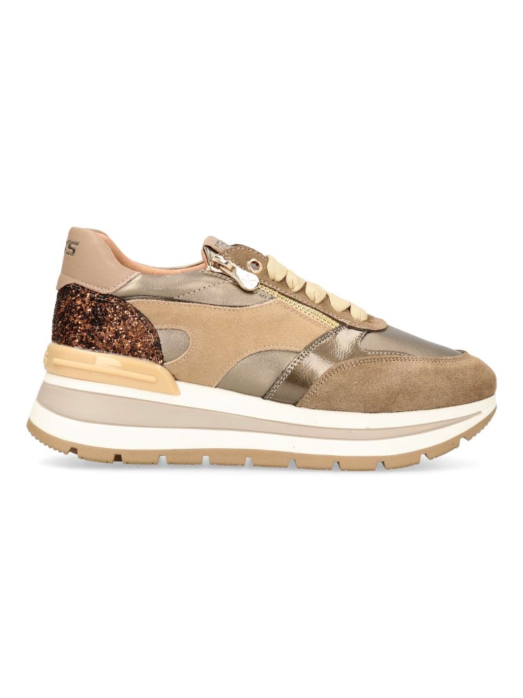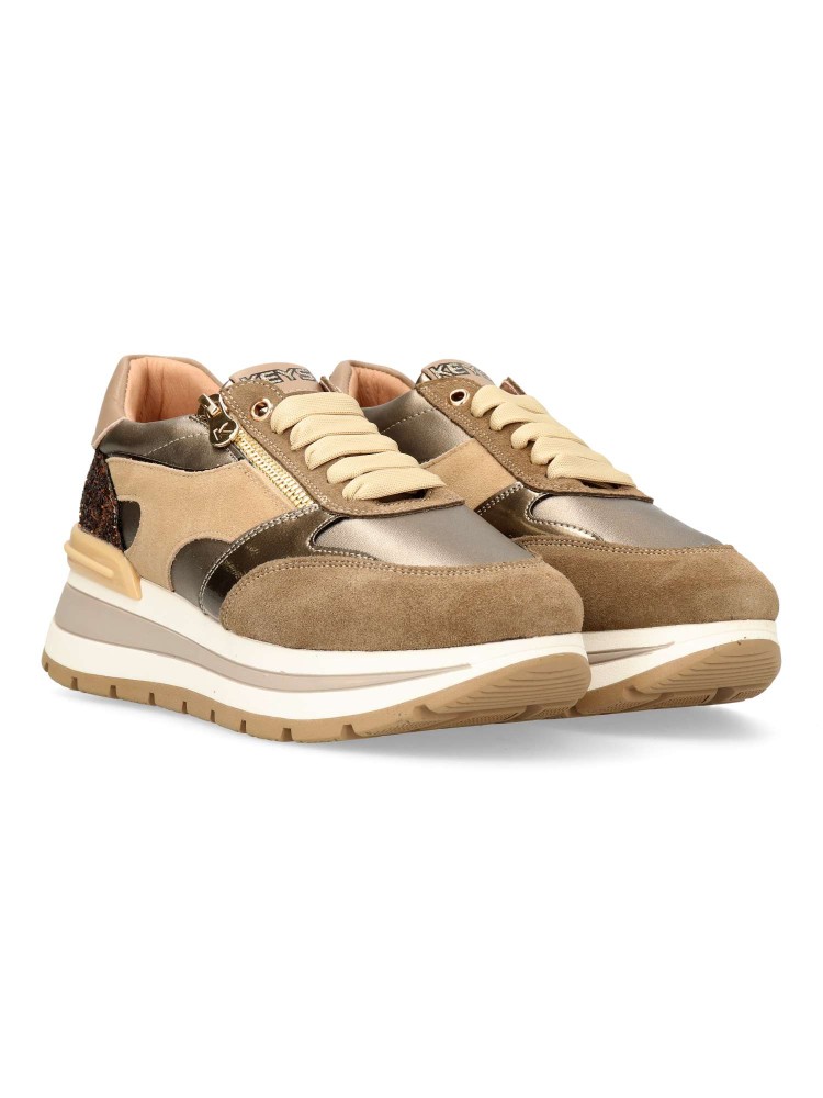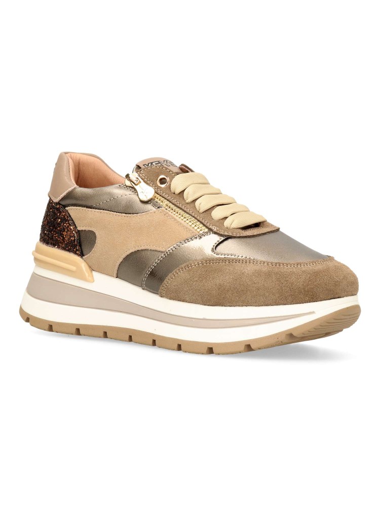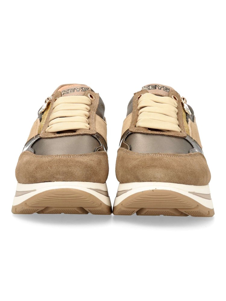 Zapatilla deportiva de mujer, estilo casual. Cierre de cordones y cremallera. Sneakers fabricado en piel, con suela de goma ligera. Plantilla de piel acolchada y extraíble. Color taupe-bronce. Diseño sport versátil y elegante, ideal con tu estilo urbano.