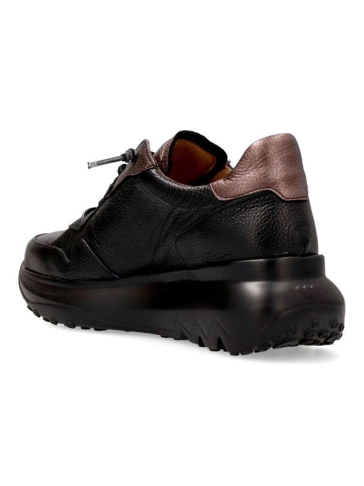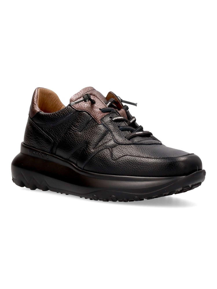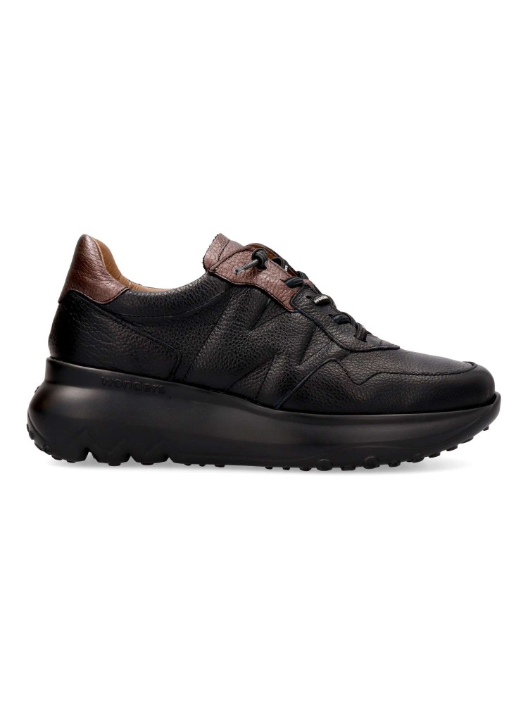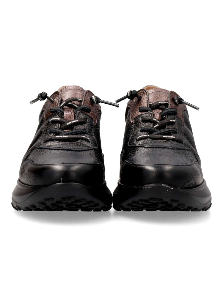 Zapatilla deportiva de mujer, estilo casual. Cordón elástico. Sneakers fabricado en piel texturizada negra. Suela gruesa desarrollada con tecnología WondersFly ™, garantía de ligereza y confort. Plantilla MemoryGel extraíble. Sensación #YesWeFly.