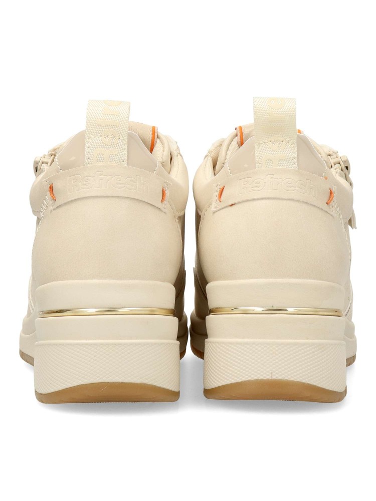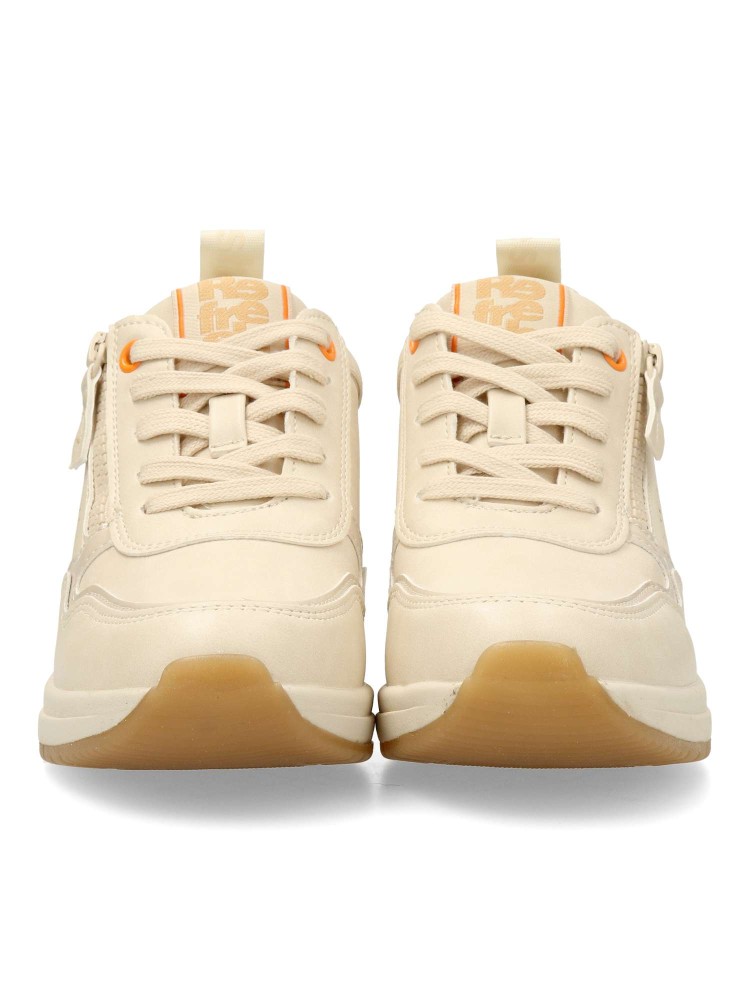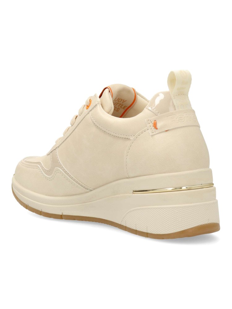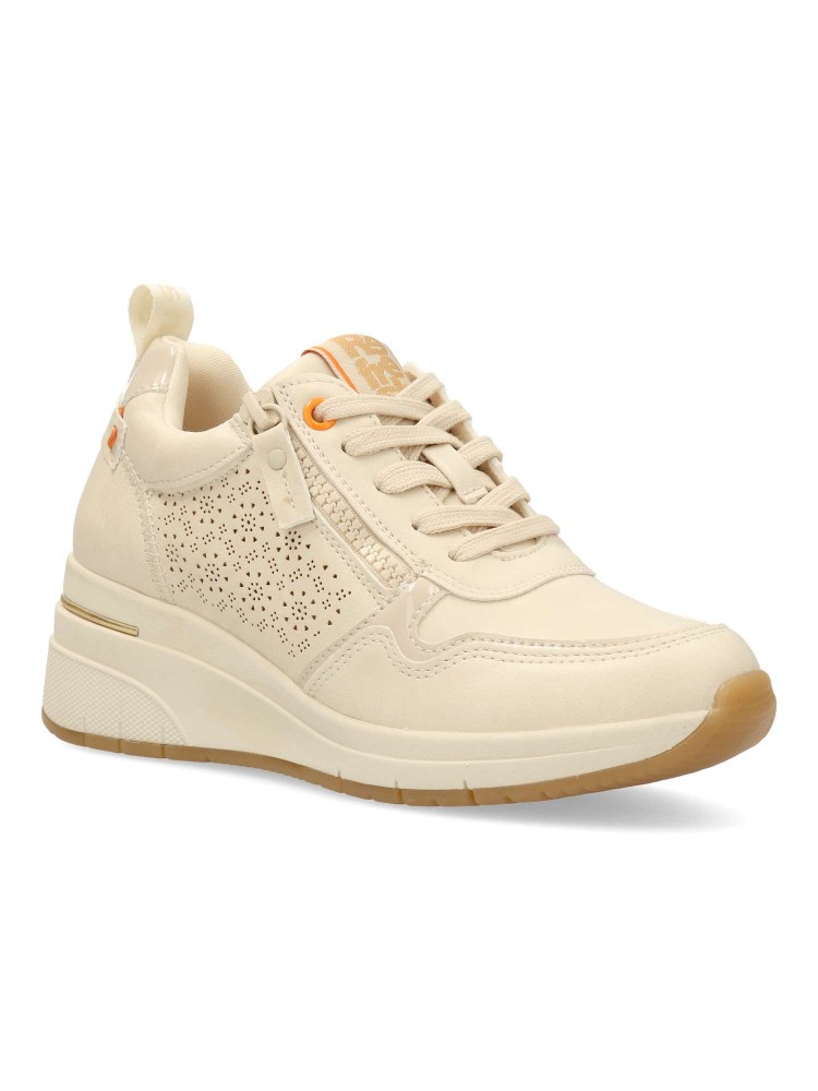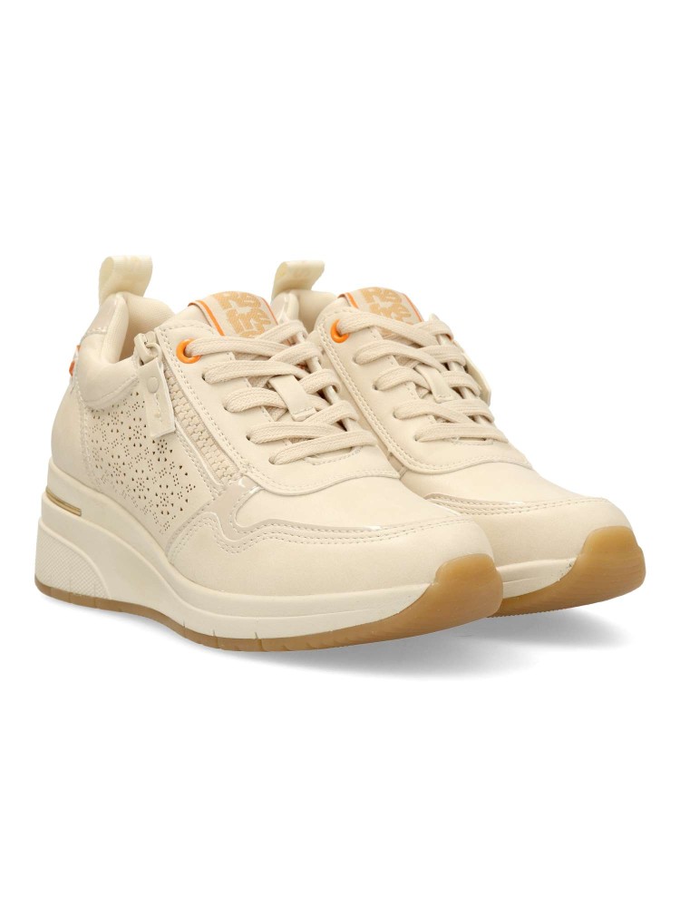 Zapato deportivo de mujer, estilo casual. Cierre de cordones y cremallera. Sneakers fabricados en piel sintética troquelada. Plantilla acolchada y extraíble. Cuña de 5 cm. Zapatilla versátil para crear tus mejores looks. Color beige. Certificado vegano.