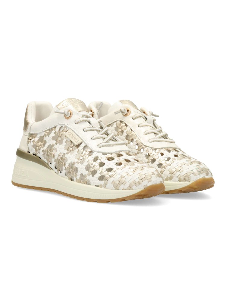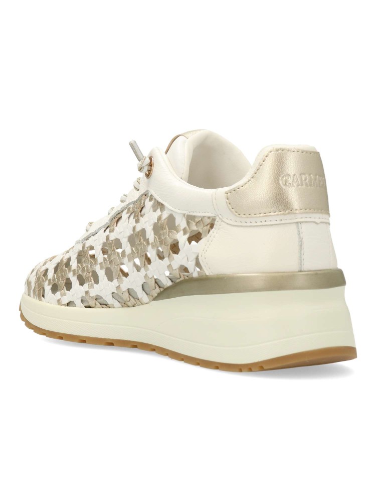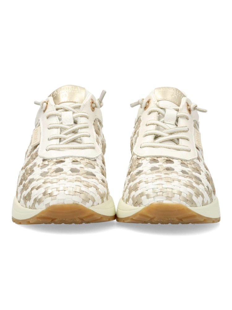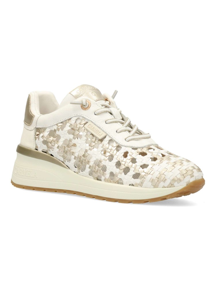 Zapato de mujer estilo casual. Sneakers cómodo, fabricado en piel de alta calidad, con suela de goma antideslizante. Diseño trenzado con toques metalizados. Cierre de cordón elástico. Platilla acolchada y extraíble. Diseño original y versátil.
