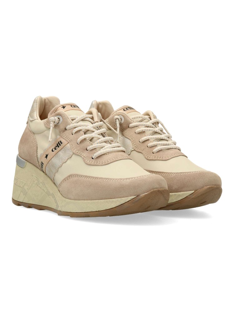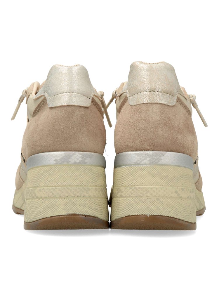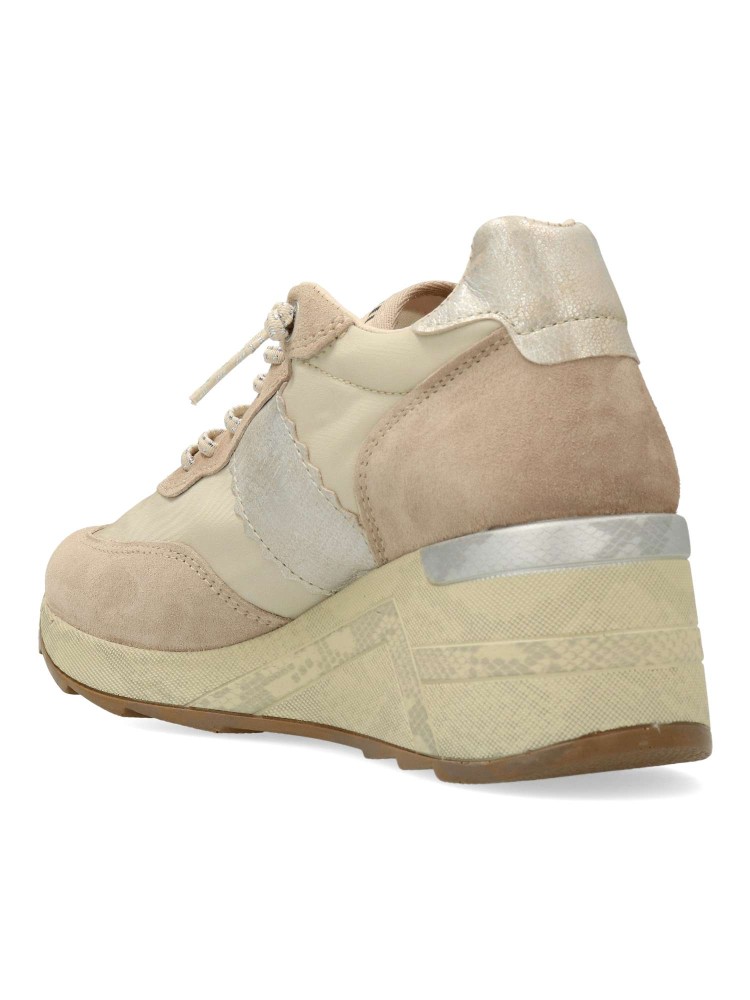 Zapailla deportiva de mujer, estilo casual. Cierre de cordones elásticos. Sneakers cómodo, fabricado con pieles naturales y textil. Plantilla acolchada y extraíble. Altura cuña 6 cm. Color beige - taupe. Hecho en España.