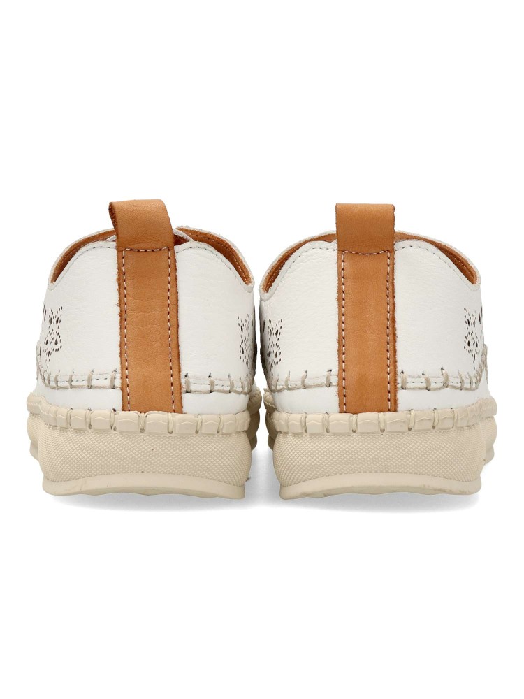 Zapato blucher de mujer, estilo casual. Cierre de cordón elástico. Fabricados en piel troquelada de primera calidad, color blanca. Suela de Flexibilidad Extrema. Plantilla acolchada. El equilibrio perfecto entre diseño moderno y ergonomía.