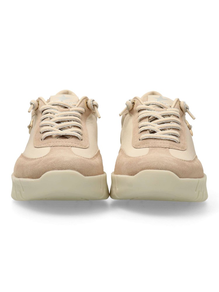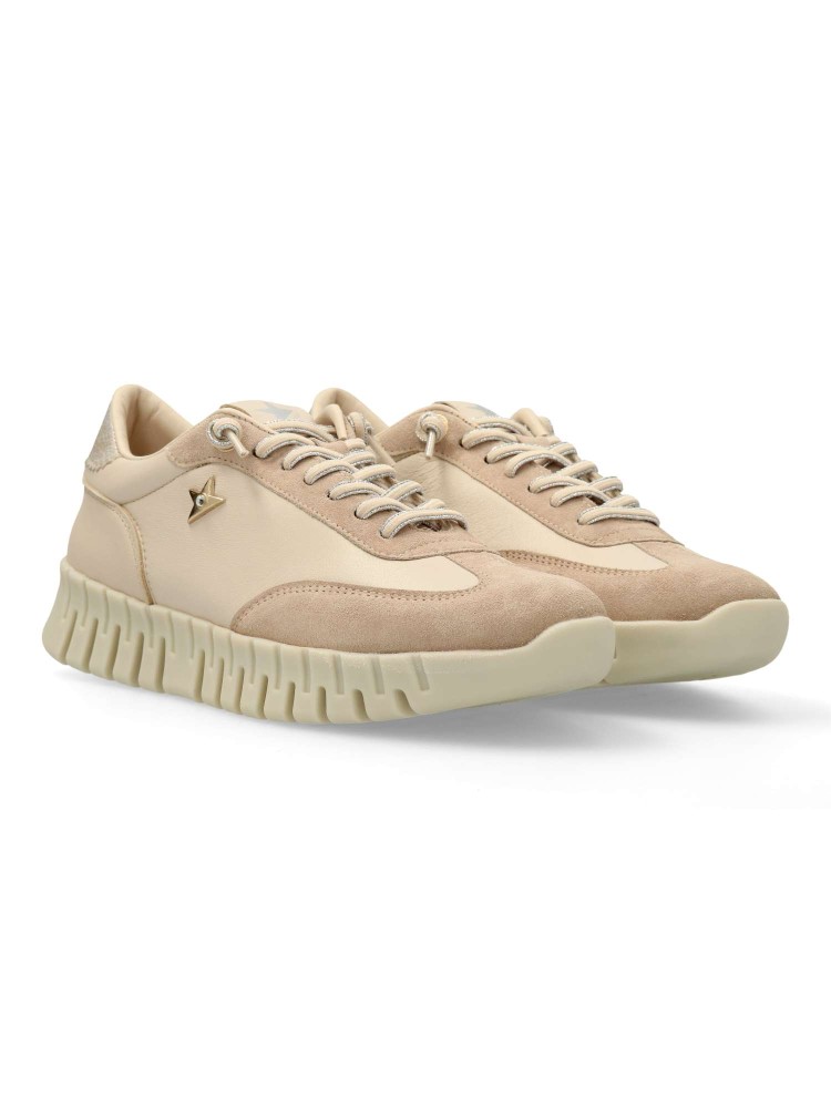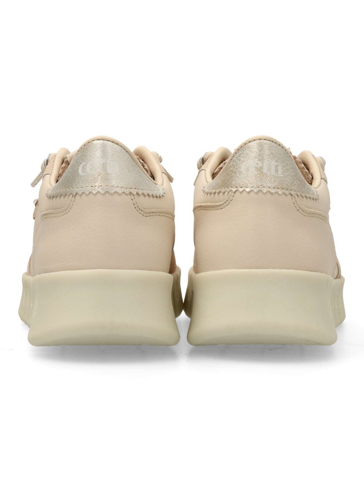 Zapato casual de mujer, con aspecto vintage-retro. Sneakers cómodo fabricado en piel natural. Cierre de cordón elástico. Plantilla acolchada extraible. Suela de goma gruesa dentada. Color beige. Estilo urbano. Hecho en España.