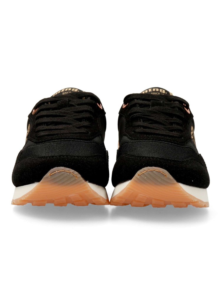 Zapatilla casual para mujer, estilo retro running. Sneakers fabricados en piel sintética y textil, con suela dentada color caramelo. Plantilla con tecnología Starfit. Perfectas para quienes buscan un look urbano con inspiración deportiva.